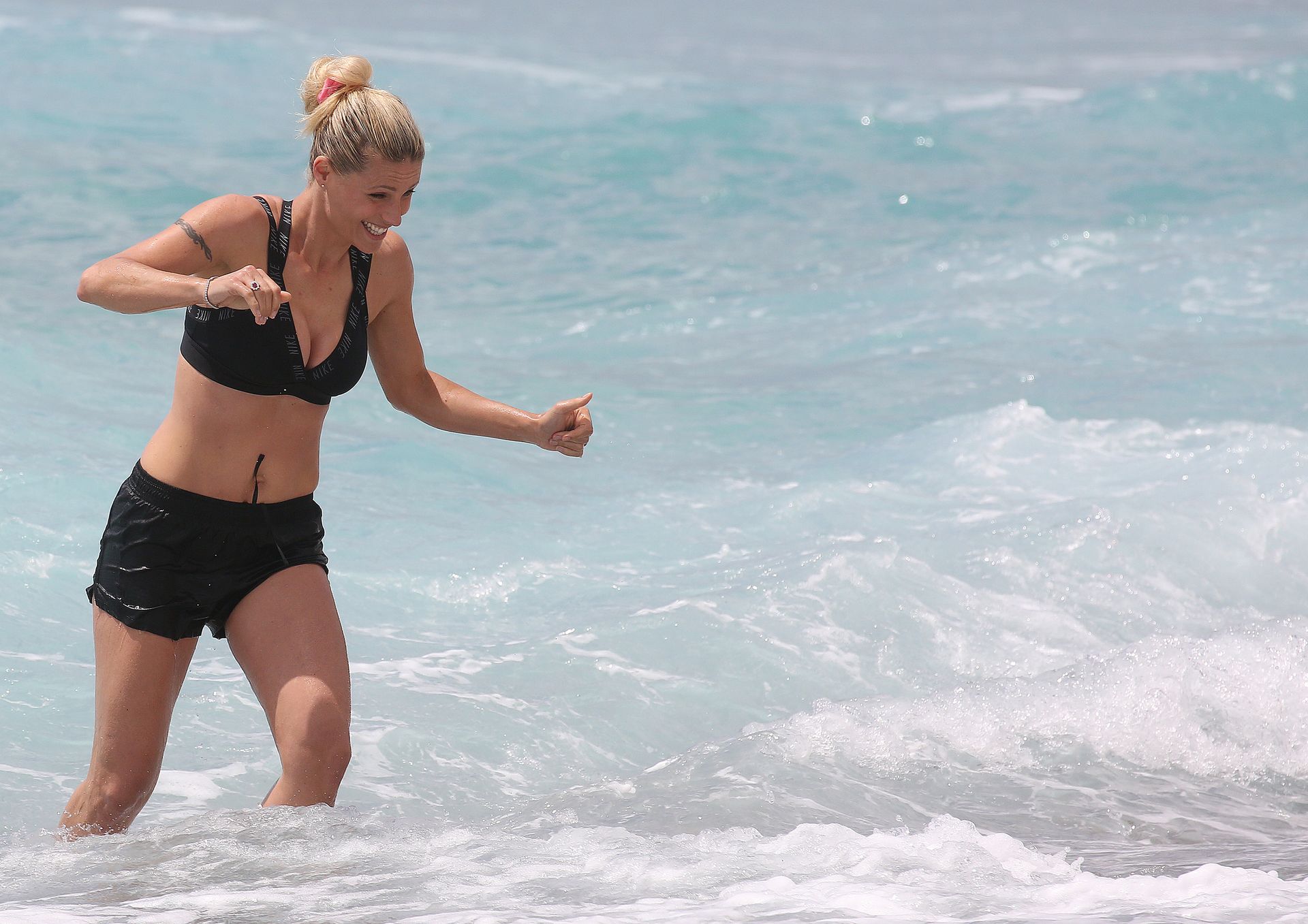Michelle Hunziker, Suisse-Italienne aux formes généreuses (43 ans), se baigne dans la mer avec ses filles à Varigotti, 06/06/2020.