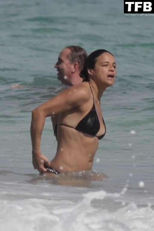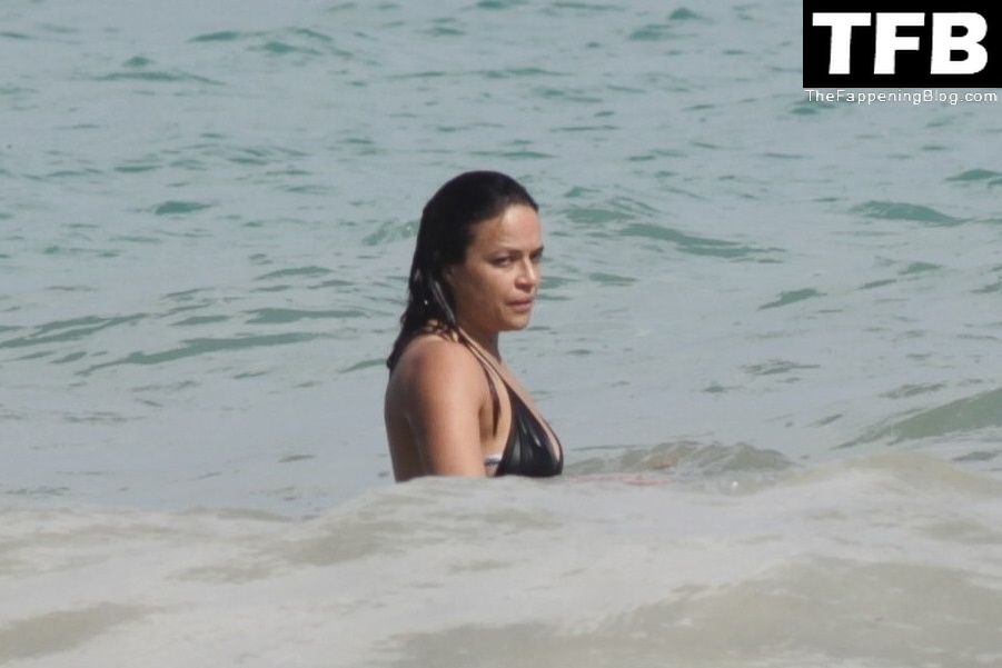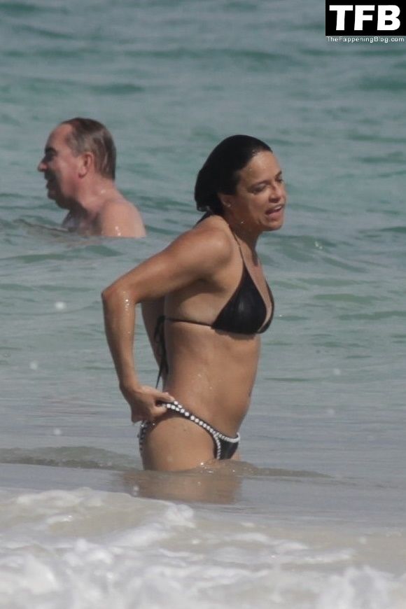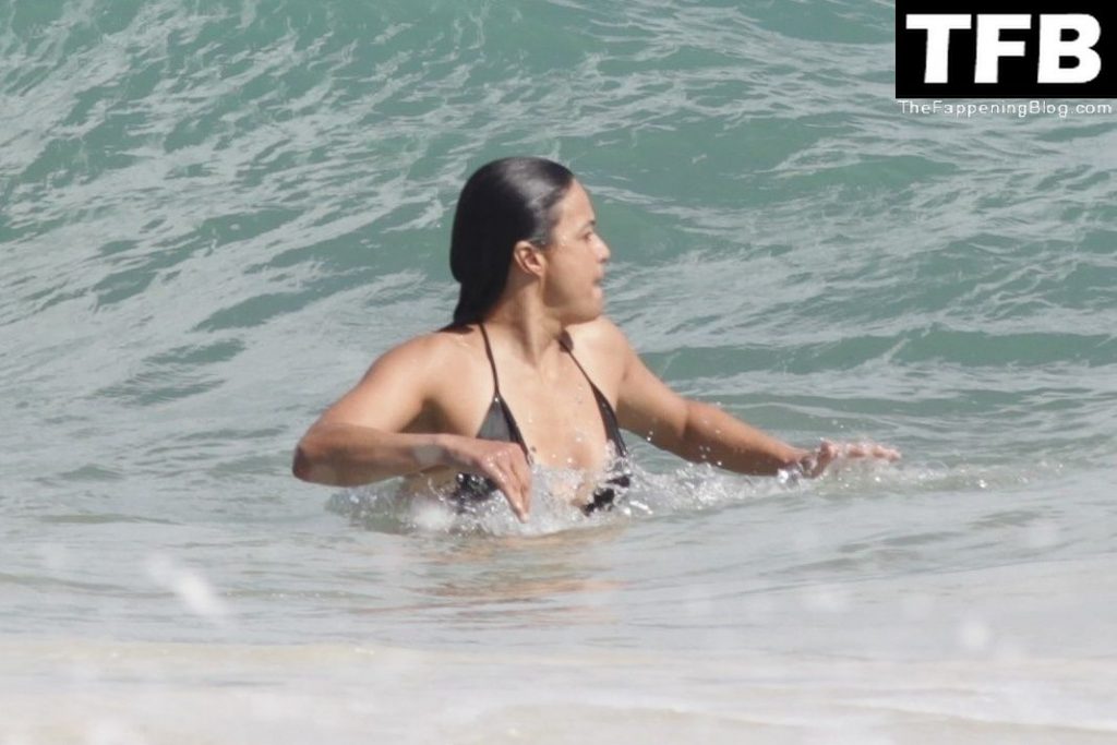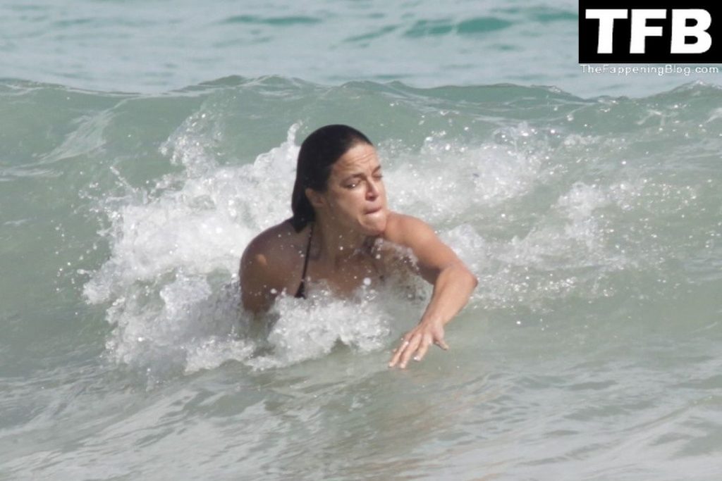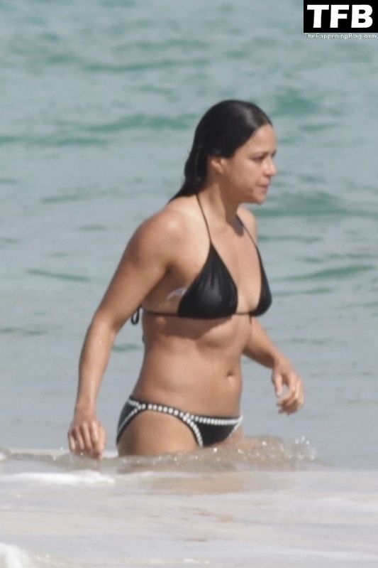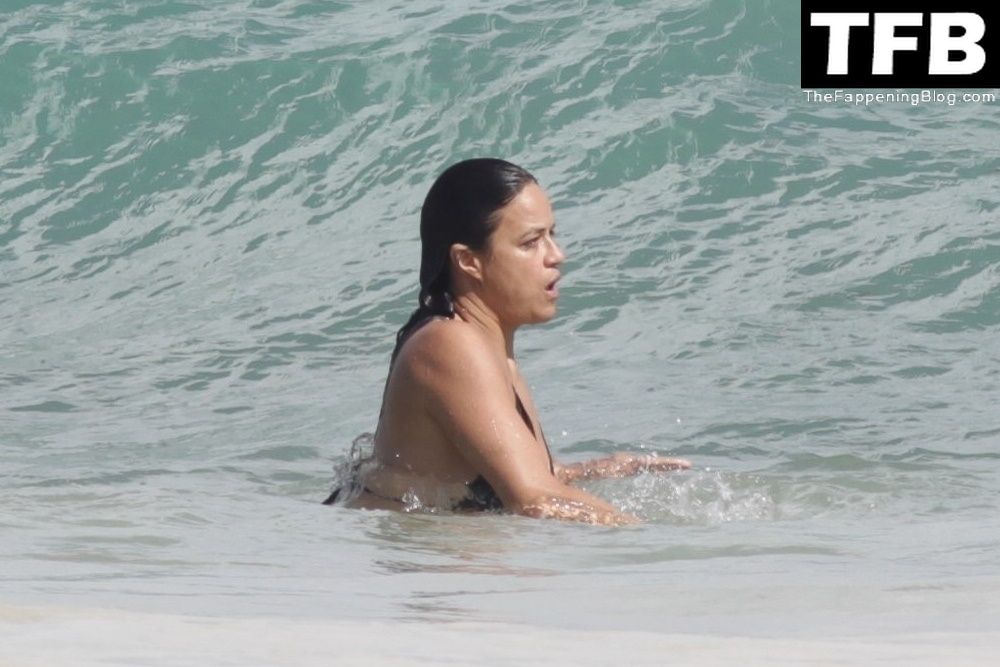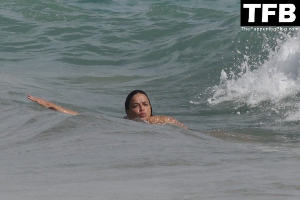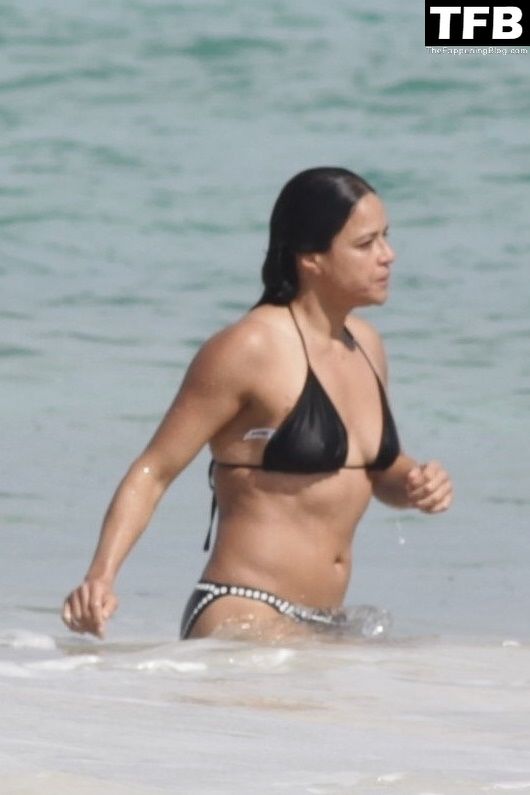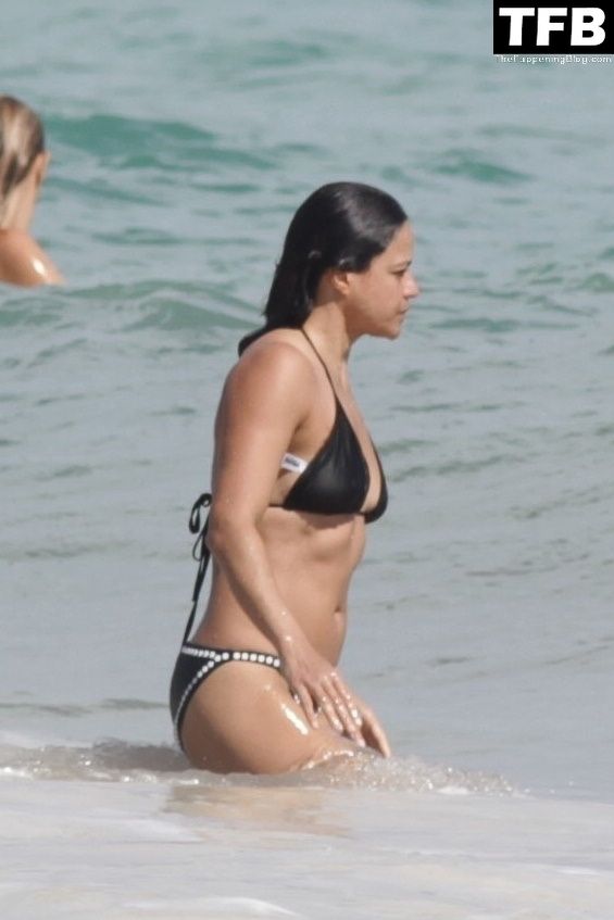 L’actrice de “Fast and the Furious” Michelle Rodriguez est vue en train de passer ses vacances en profitant du soleil sur les plages de sable de Tulum, au Mexique, le 20/12/2021. Michelle est tout sourire alors qu’elle s’éclabousse dans l’eau avec une amie.