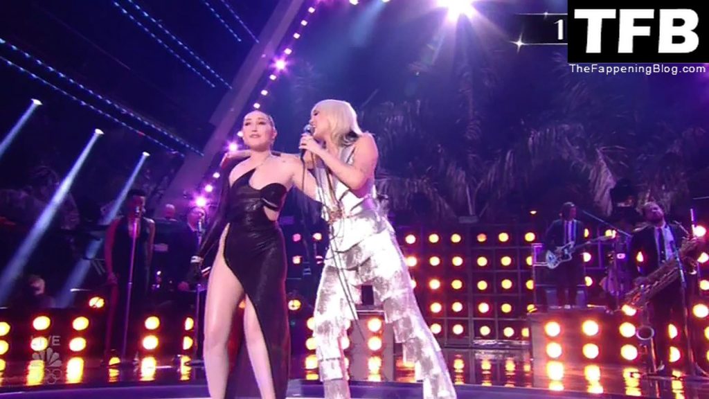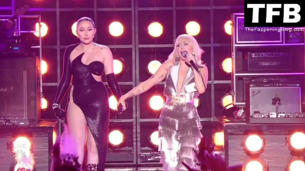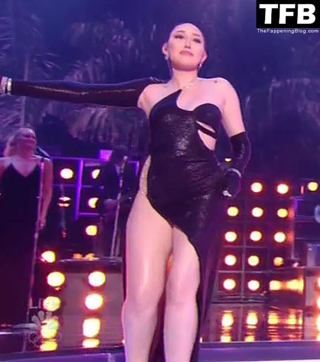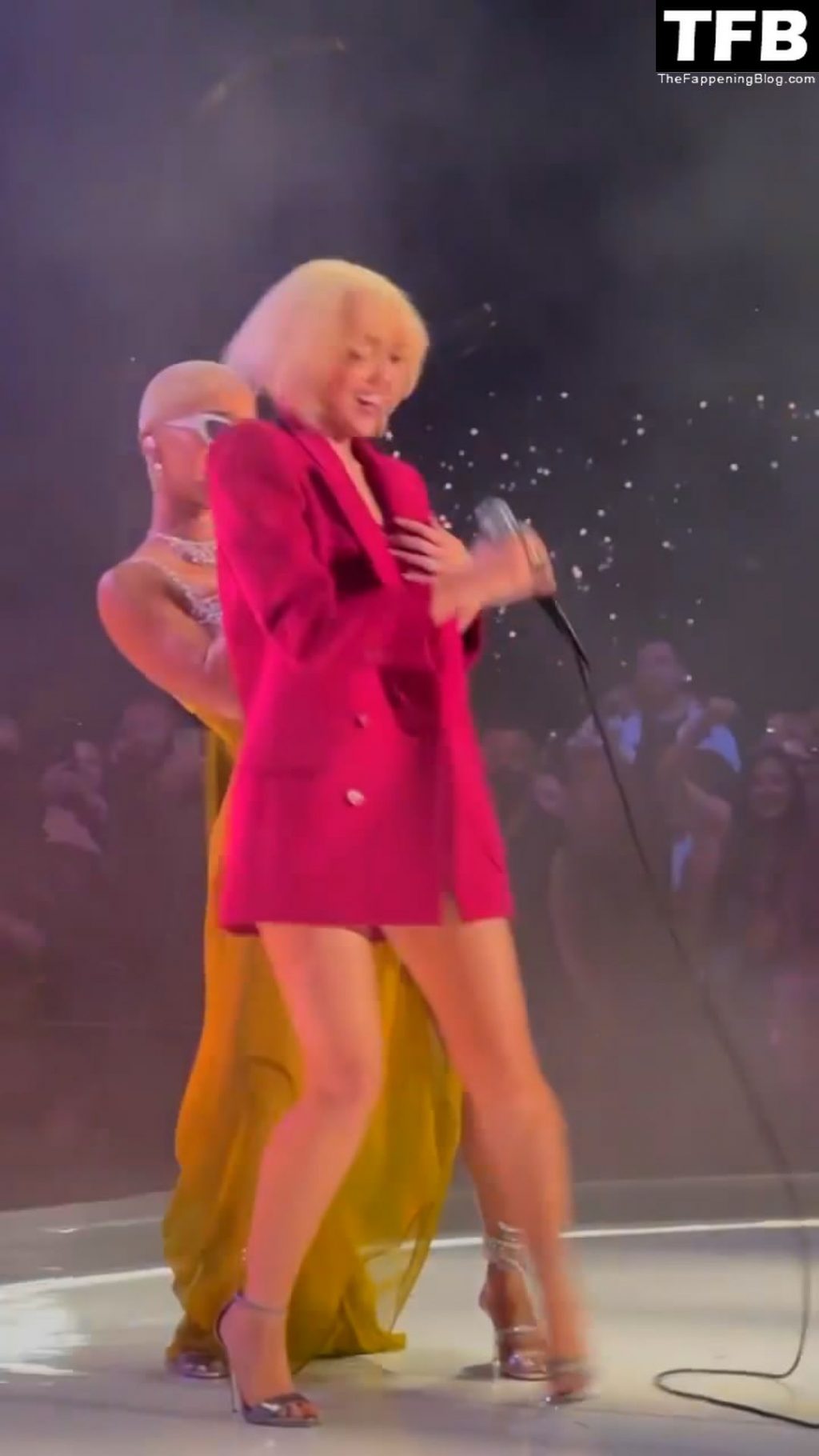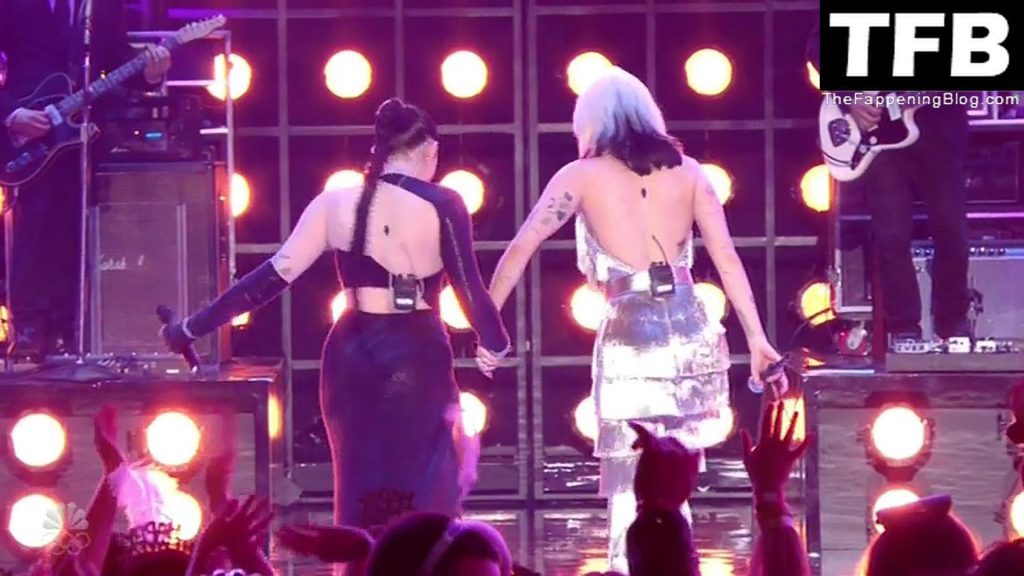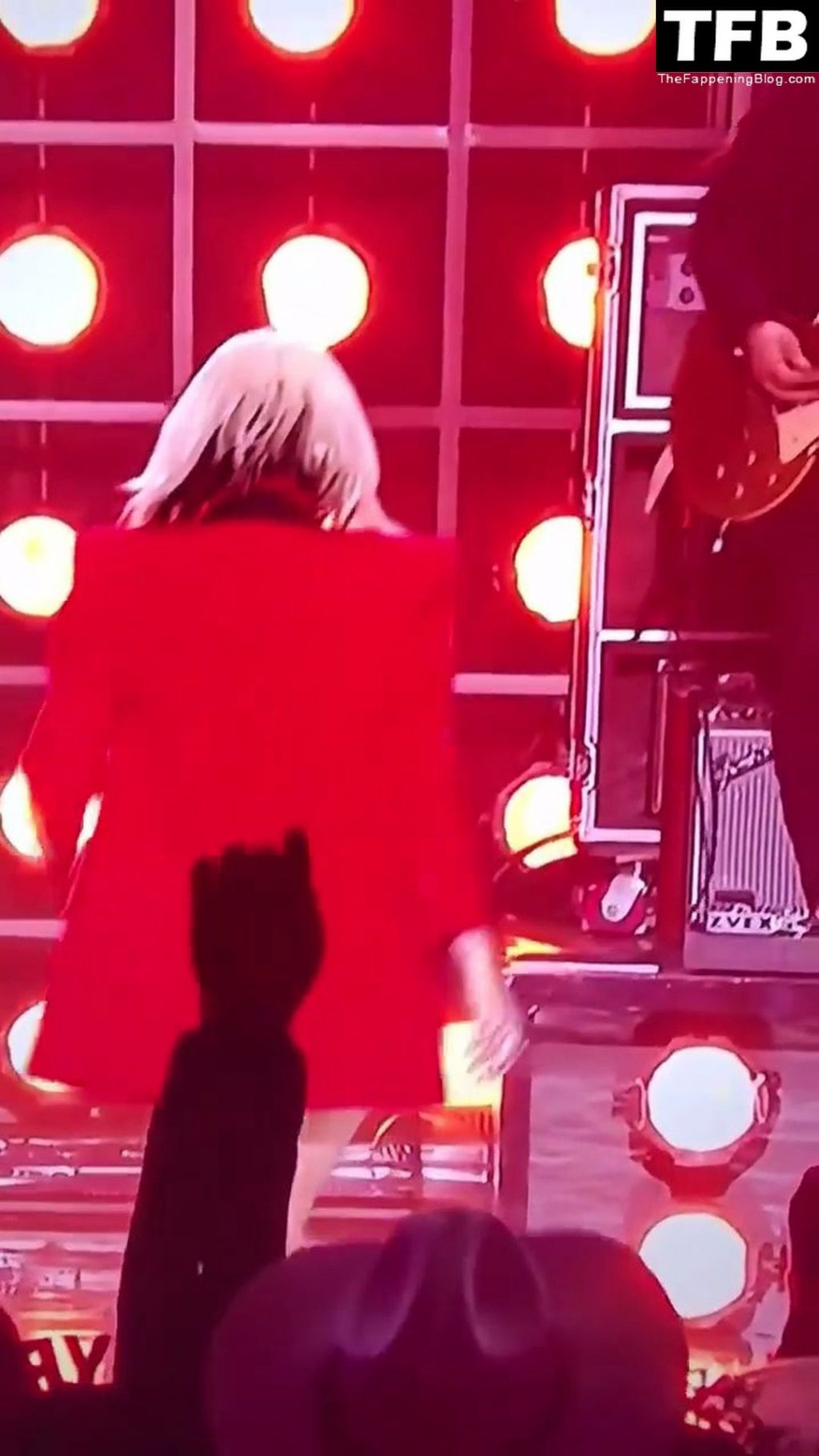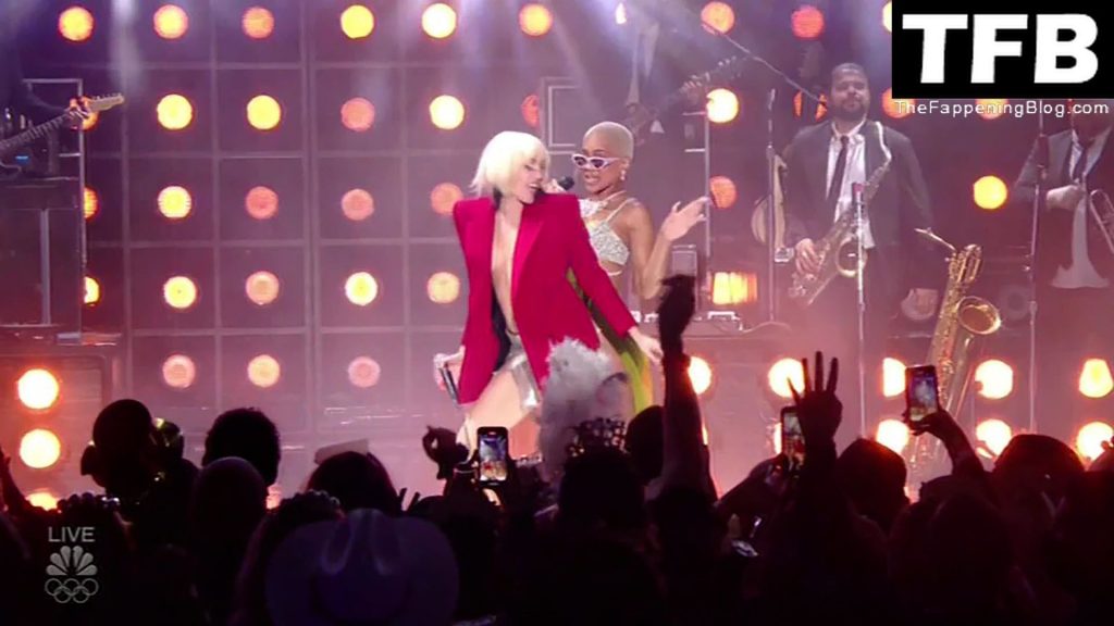Alors qu’elle continuait à chanter, elle a fait une blague en référence à une des phrases de Party In the USA, disant : “Tout le monde me REGARDE DÉFINITIVEMENT maintenant !” Elle a aussi plaisanté en disant que sa tenue actuelle était encore la plus couverte qu’elle ait jamais portée lors d’une performance. Mais le blazer ne l’a pas empêchée de taquiner la foule puisqu’elle ne portait rien en dessous et a plusieurs fois failli exposer ses seins en dansant sur scène avec la chanteuse invitée Saweetie.