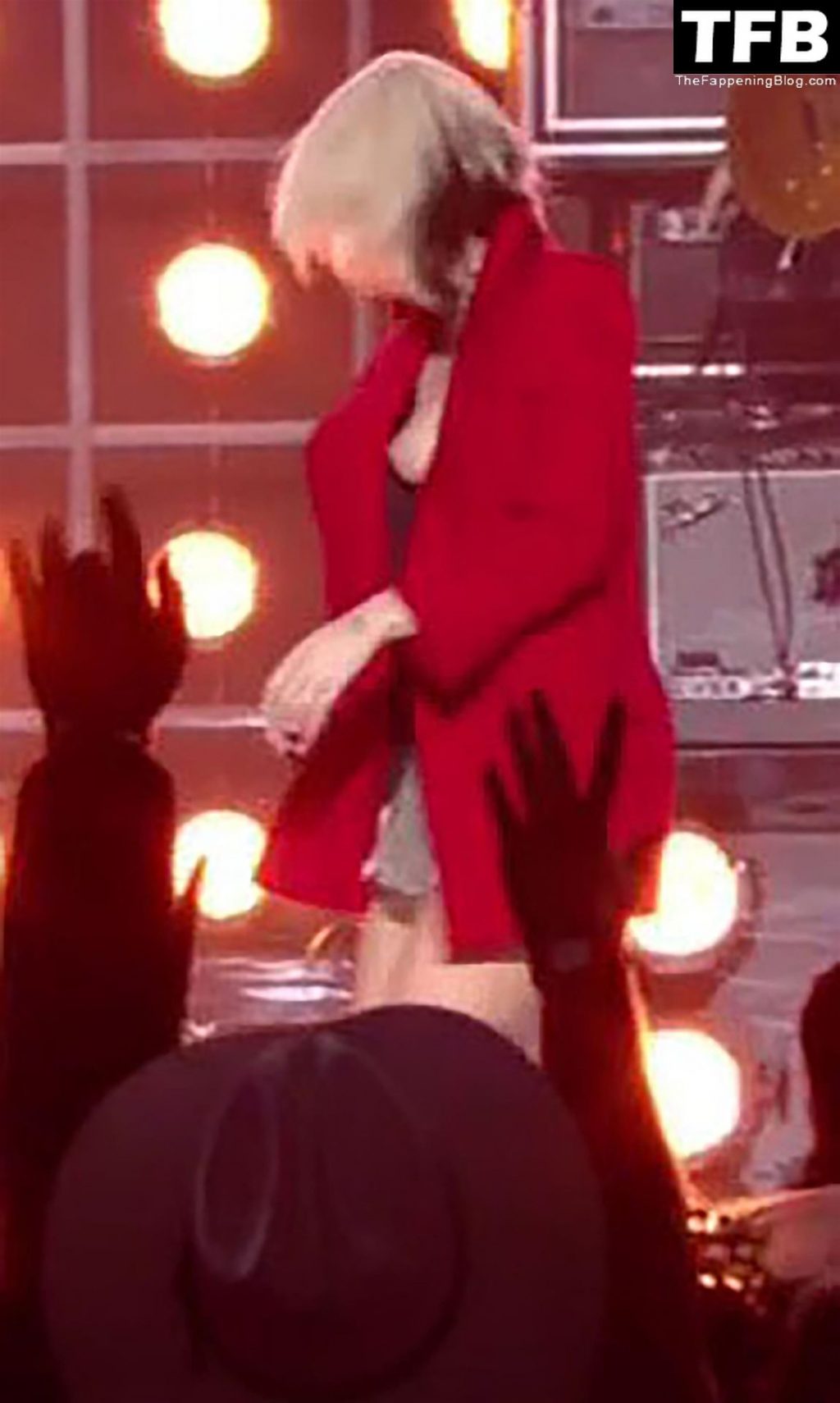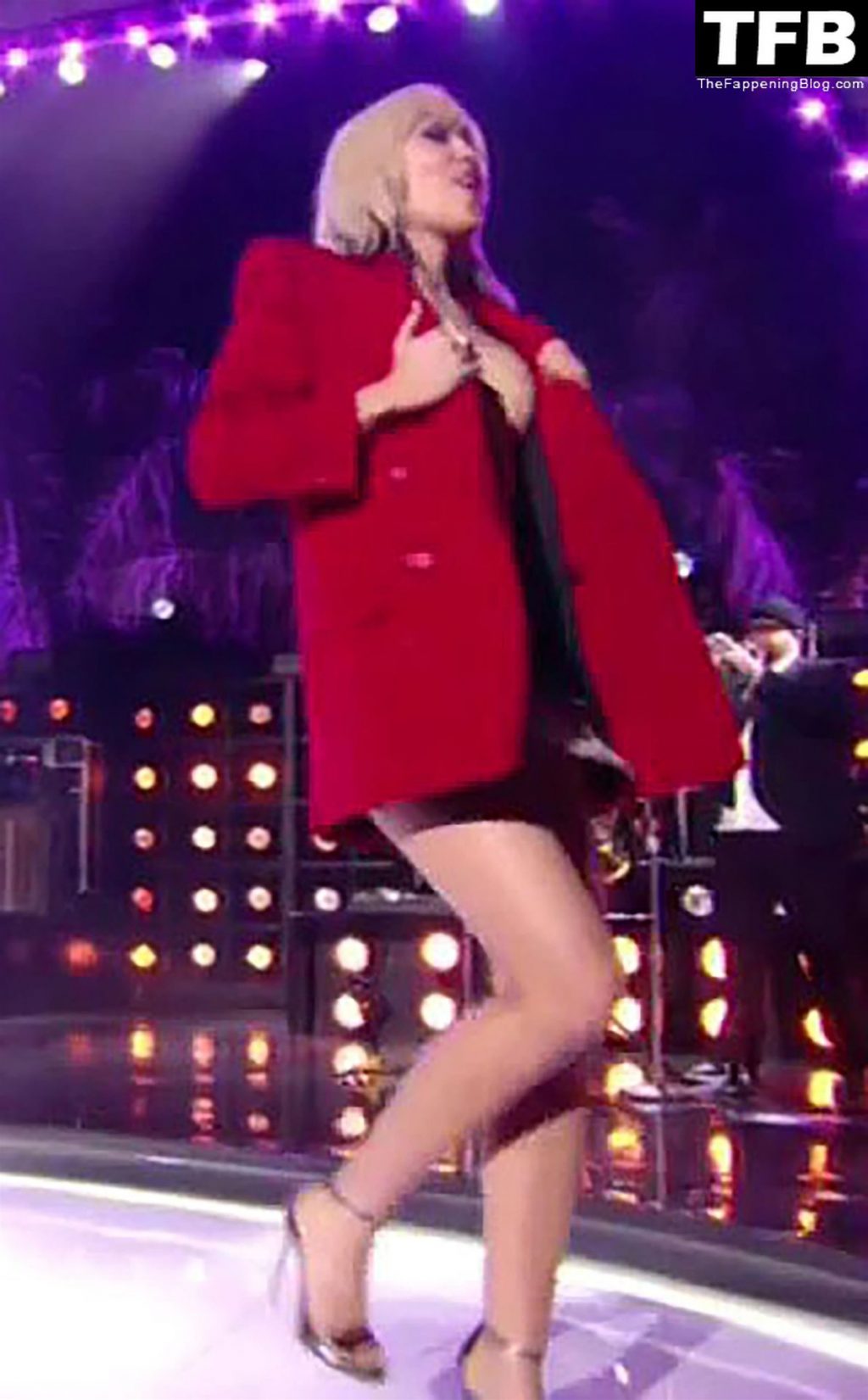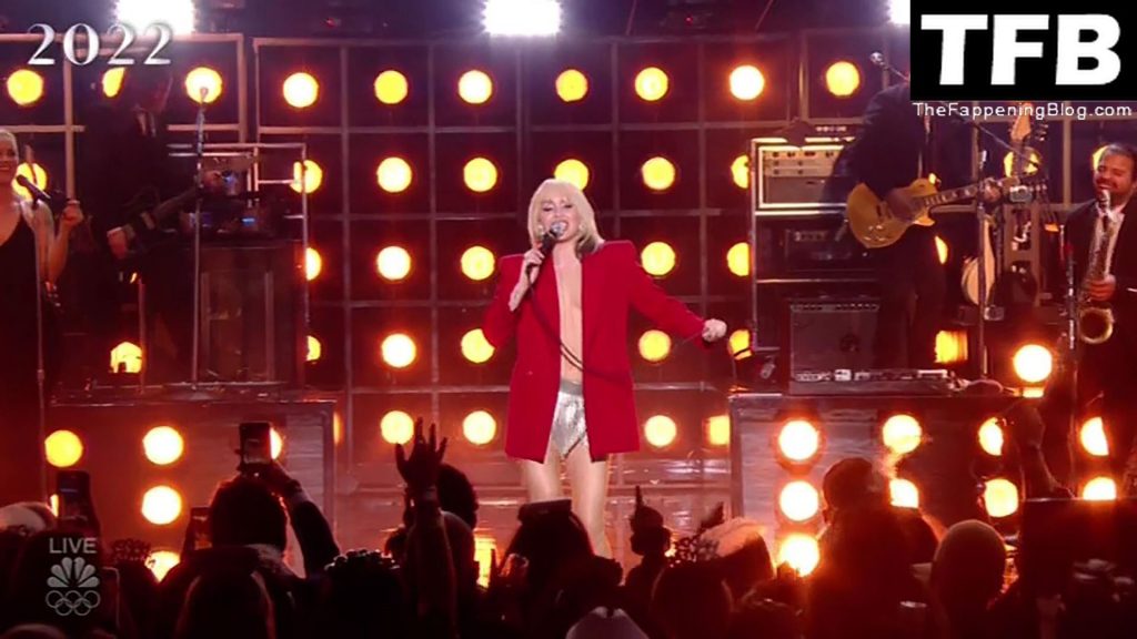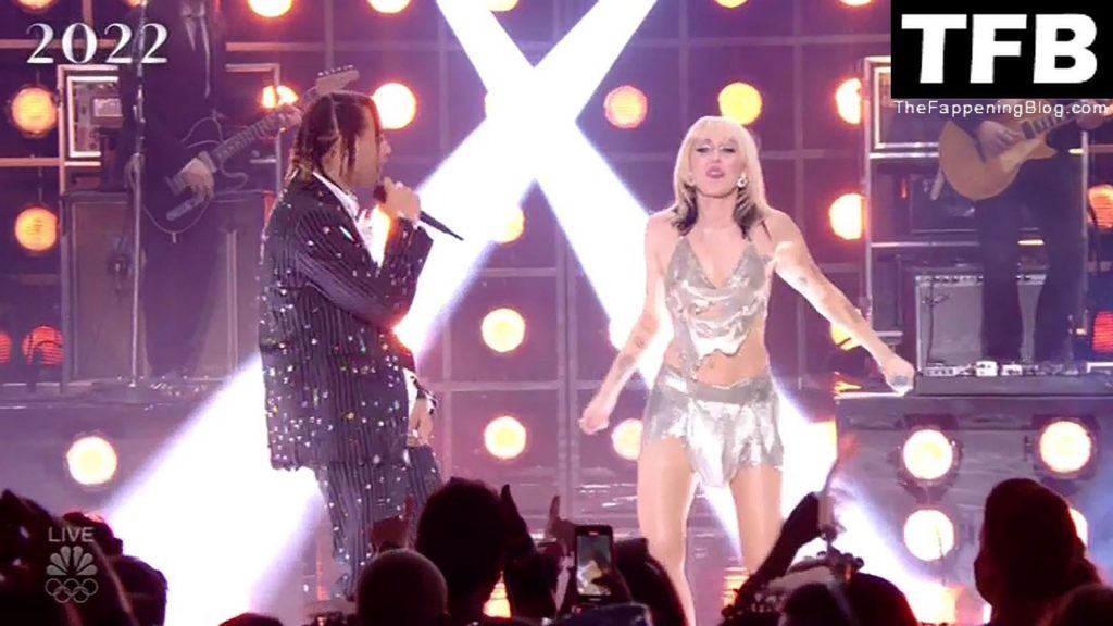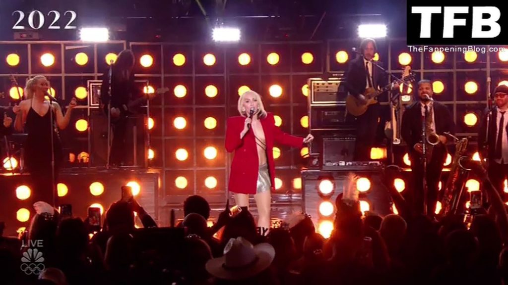 La star venait de chanter sa chanson “We Can’t Stop” aux côtés du rappeur 24kGoldn lorsqu’elle a lancé son tube Party in the USA. En tournant sur scène, la fine bretelle de sa robe en maille argentée très courte s’est rompue.