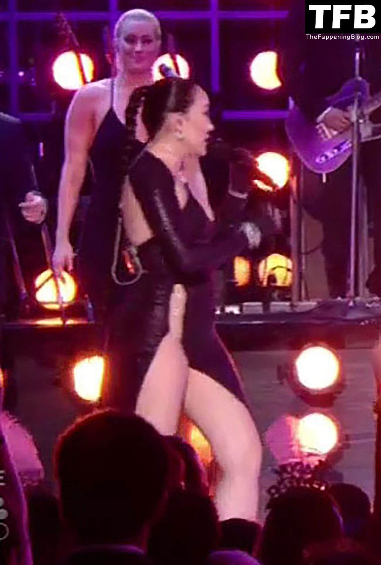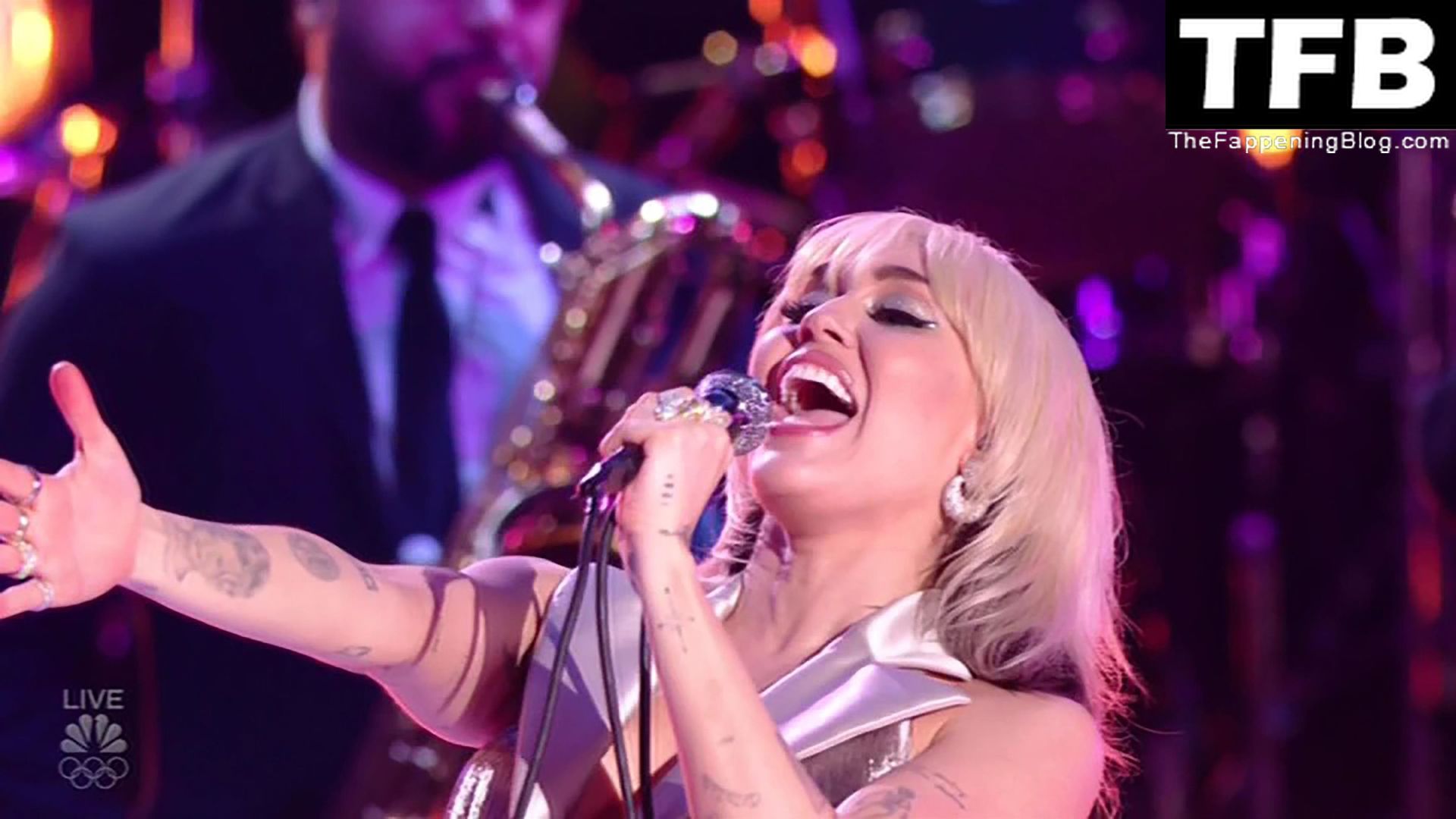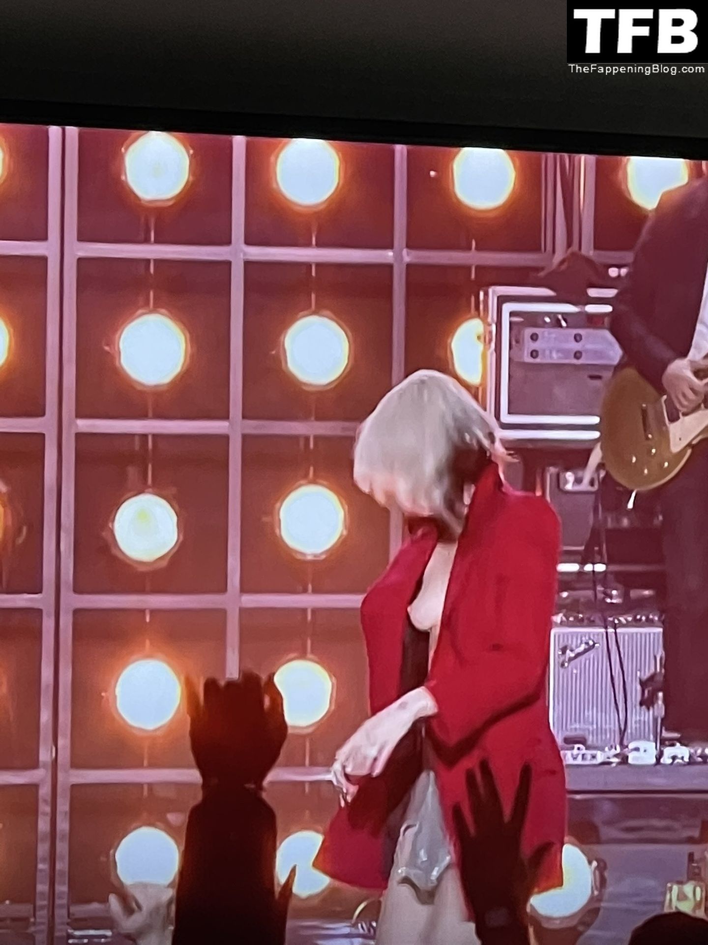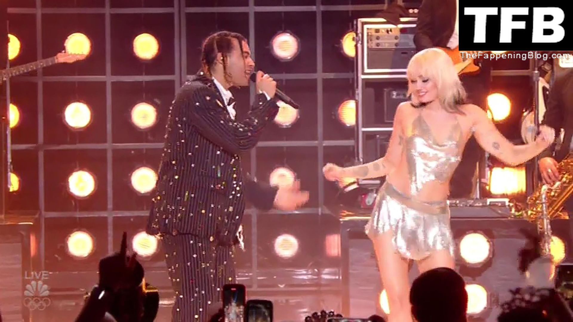La star venait de chanter sa chanson “We Can’t Stop” aux côtés du rappeur 24kGoldn lorsqu’elle a lancé son tube Party in the USA. En tournant sur scène, la fine bretelle de sa robe en maille argentée très courte s’est rompue.