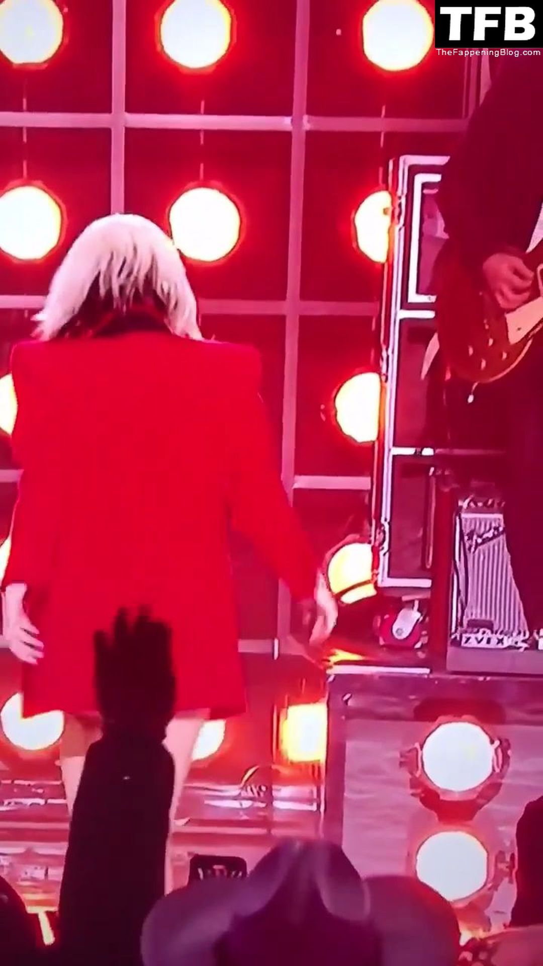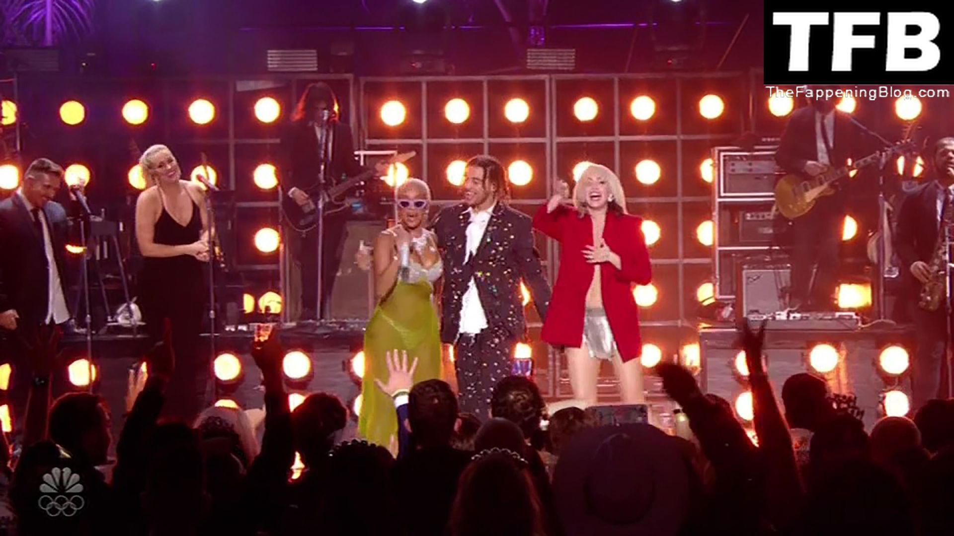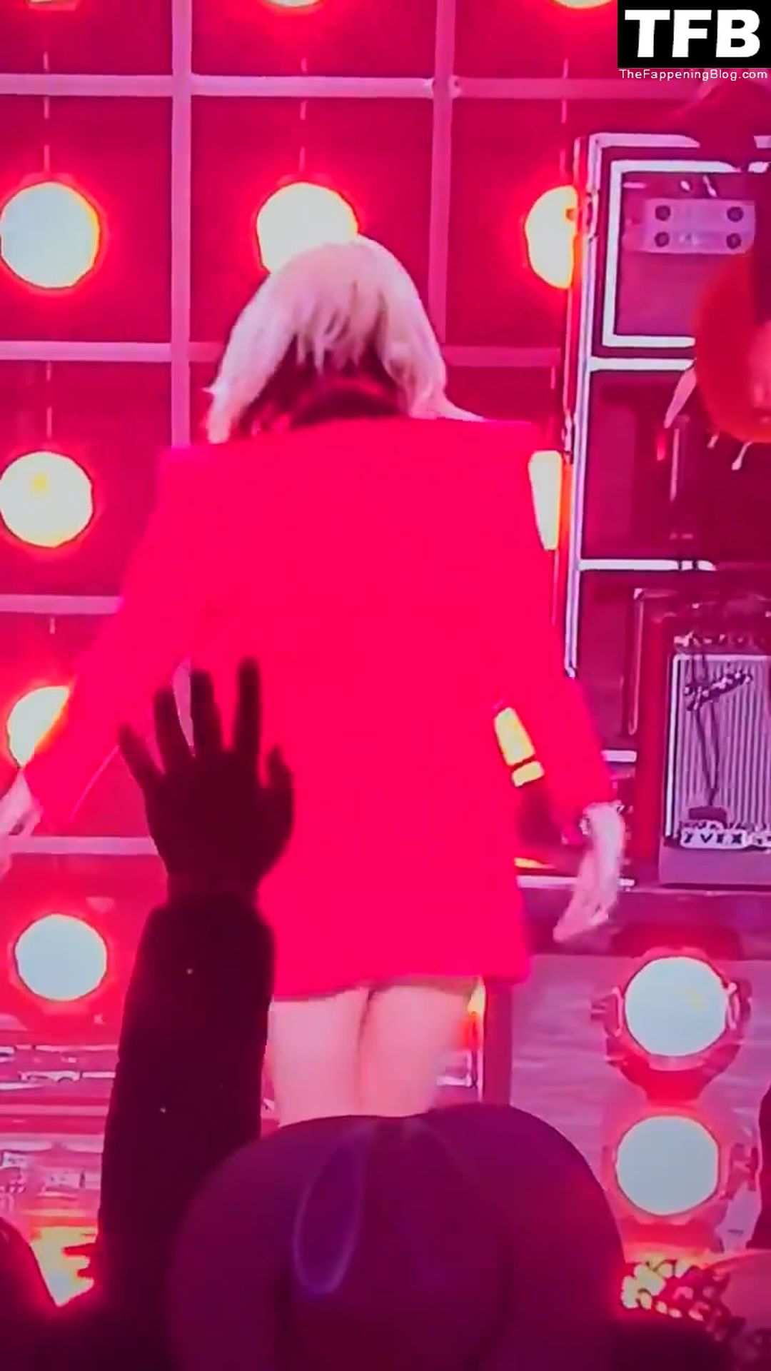 Alors qu’elle continuait à chanter, elle a fait une blague en référence à une des phrases de Party In the USA, disant : “Tout le monde me REGARDE DÉFINITIVEMENT maintenant !” Elle a aussi plaisanté en disant que sa tenue actuelle était encore la plus couverte qu’elle ait jamais portée lors d’une performance. Mais le blazer ne l’a pas empêchée de taquiner la foule puisqu’elle ne portait rien en dessous et a plusieurs fois failli exposer ses seins en dansant sur scène avec la chanteuse invitée Saweetie.