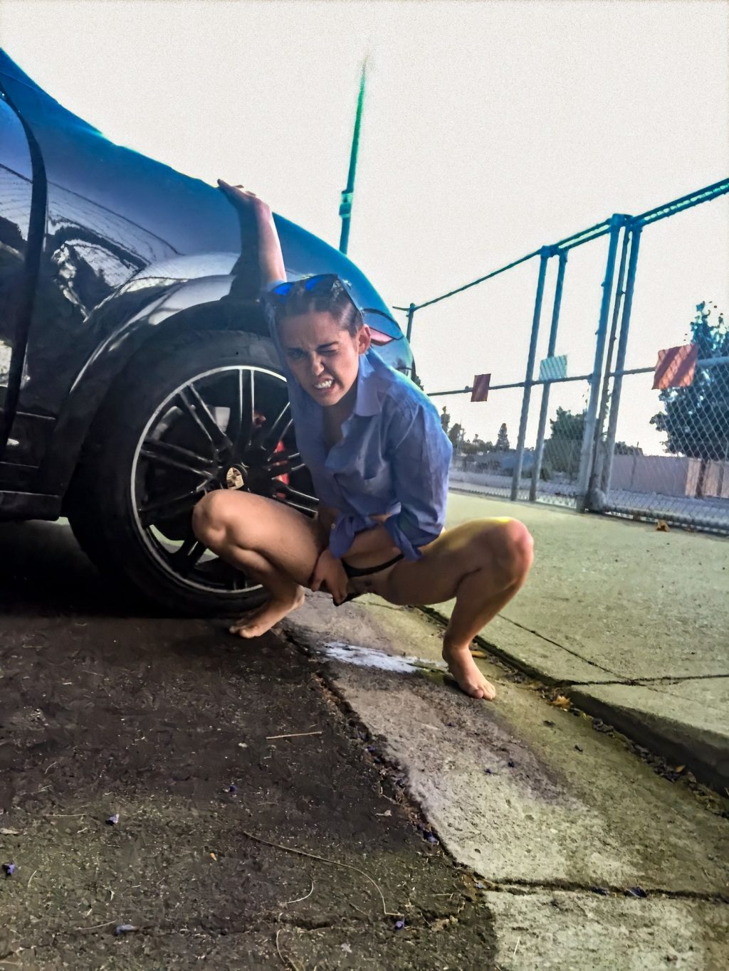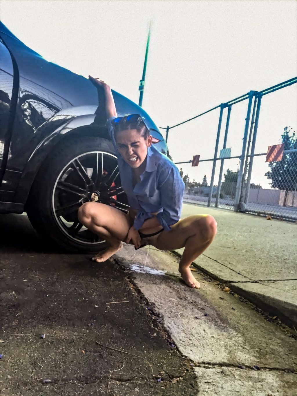 Une poche de goon de trop et elle a dû s'arrêter sur le bord de la route pour libérer ses fluides. À en juger par l'expression sur son visage, elle semble très soulagée, bien que je parie que le conseil municipal va la sanctionner lourdement pour le trou énorme que son urine acide a creusé dans le bitume. Écrase-la maintenant, je suis sûr qu'elle a le covid-19...