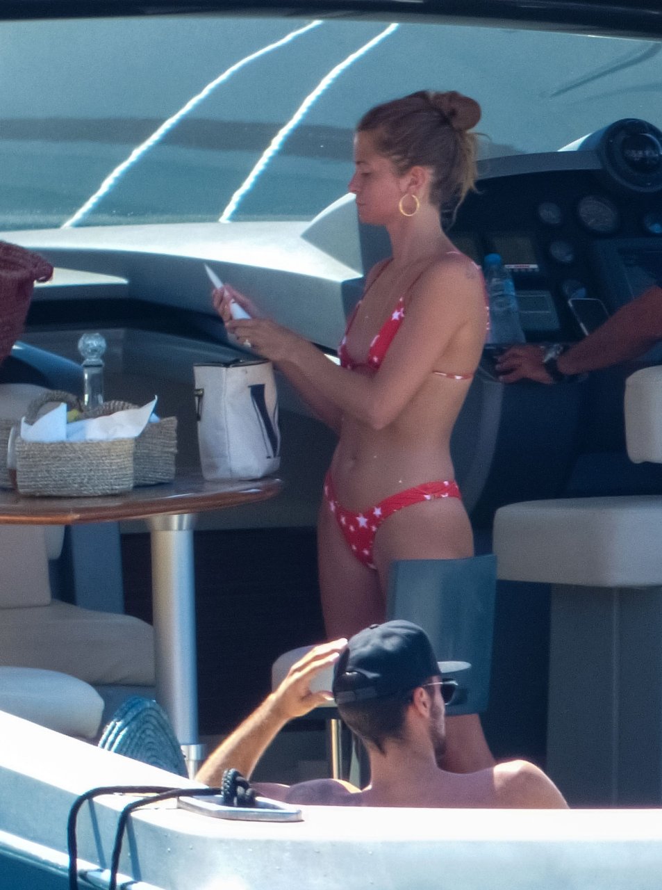 Milie Mackintosh aperçue sur un bateau avec son petit ami Hugo Taylor sur l’île de Mykonos, Grèce, 27/07/2017. Millie Mackintosh est une star britannique de la télé-réalité (Made in Chelsea). Âge – 28.