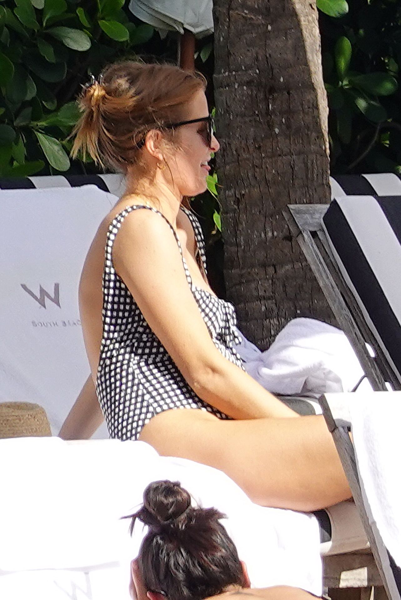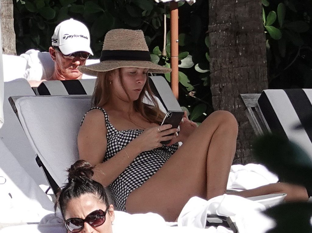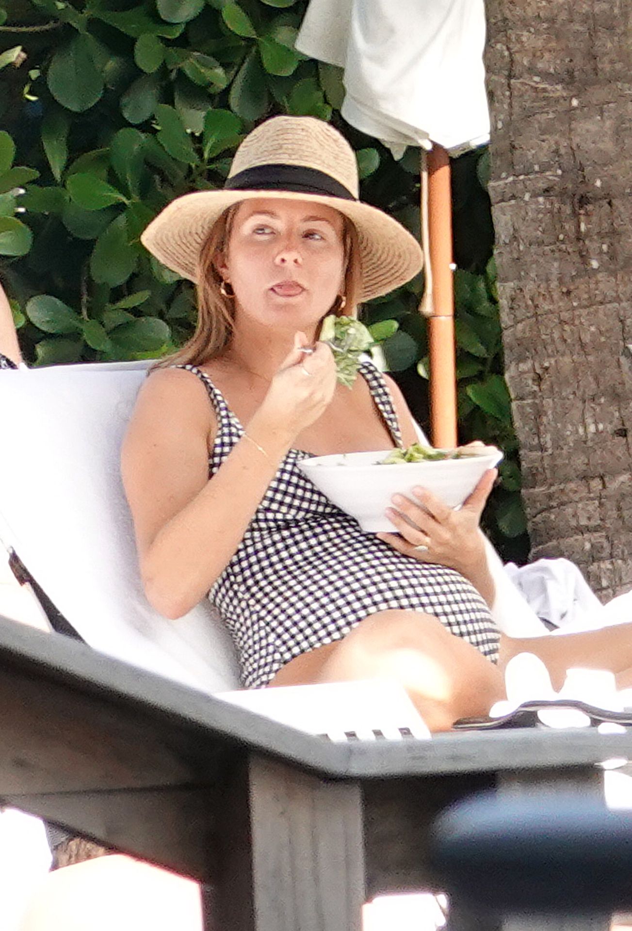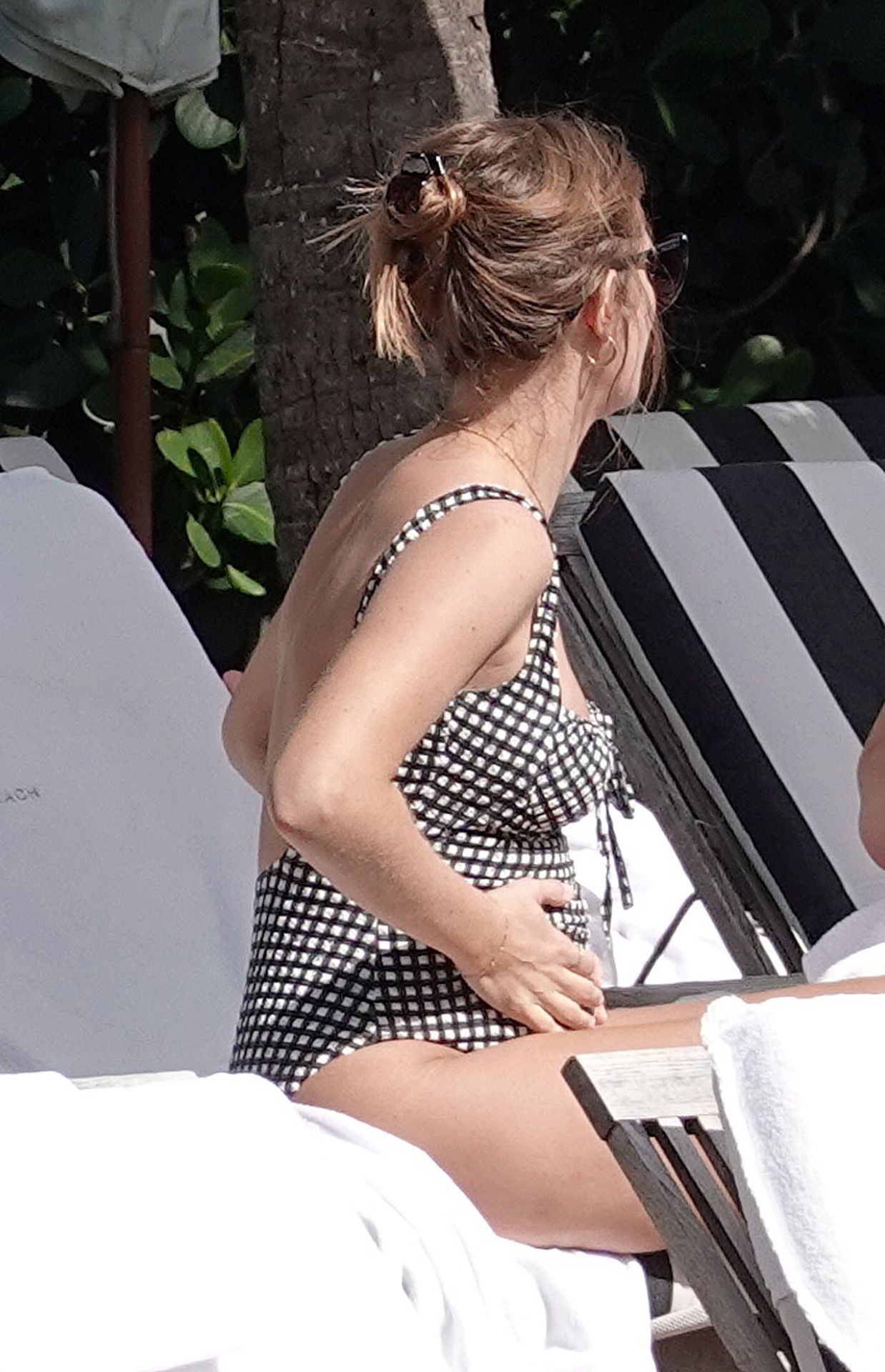 La star enceinte Millie Mackintosh montre son ventre de grossesse en maillot de bain et caresse tendrement son ventre tout en se relaxant au bord de la piscine à Miami, 21/11/2019.