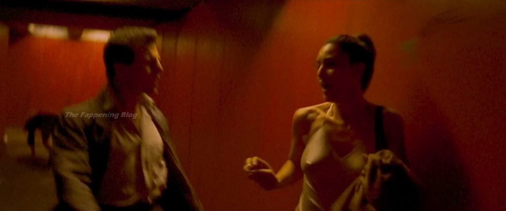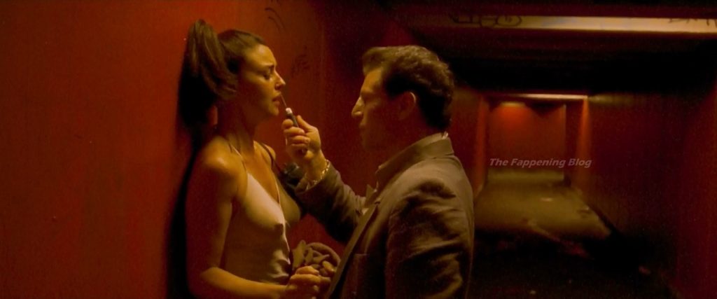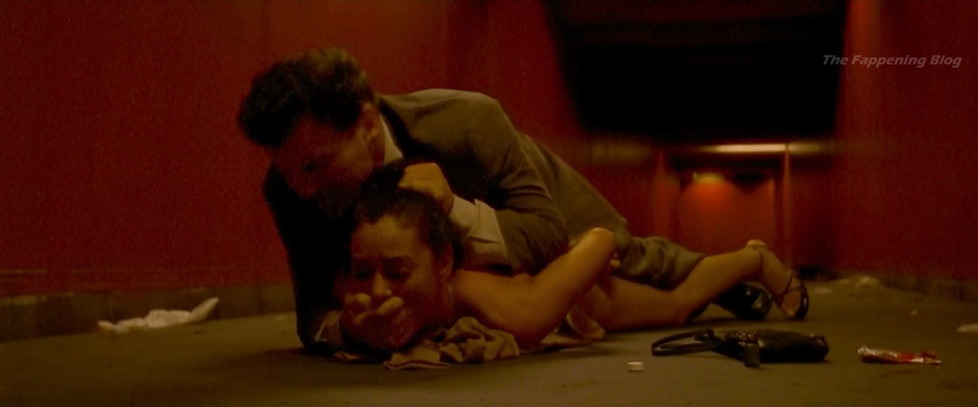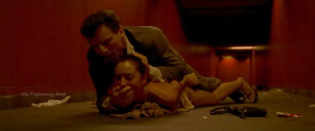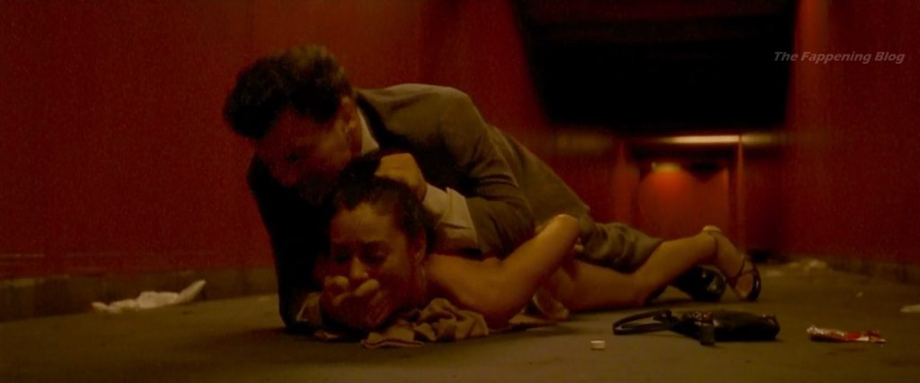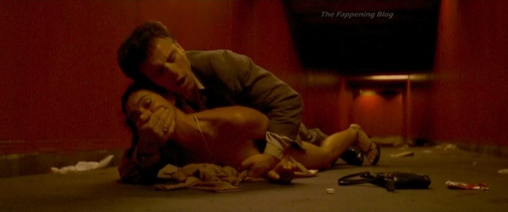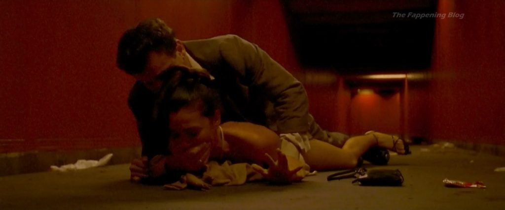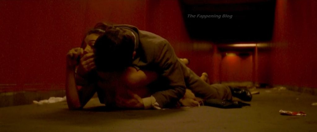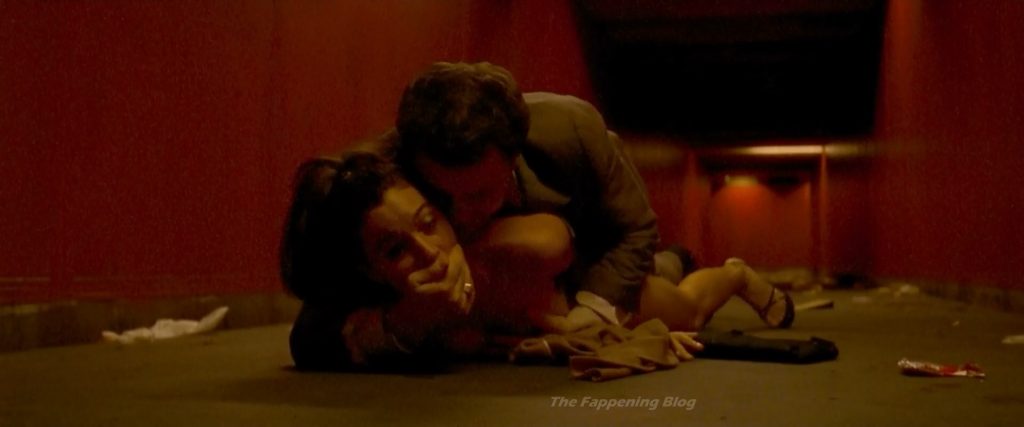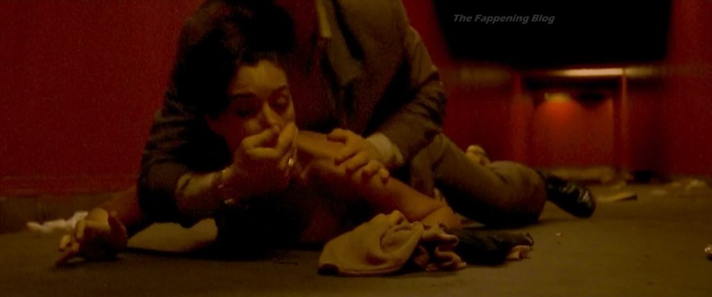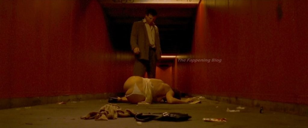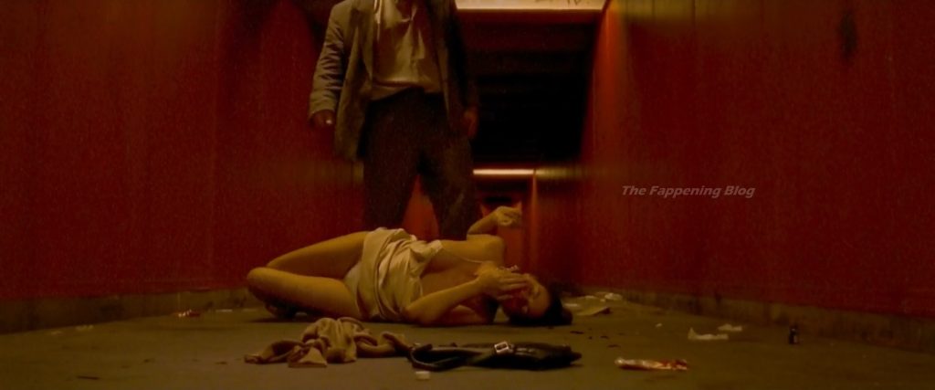 Monica Bellucci est allongée sur le sol d’un tunnel avec un homme au-dessus d’elle qui remonte sa robe pour exposer sa fesse gauche et baisse la bretelle gauche de sa robe, révélant son sein gauche. L’homme a ensuite un rapport sexuel avec elle par derrière tout en tenant sa main droite sur sa bouche.