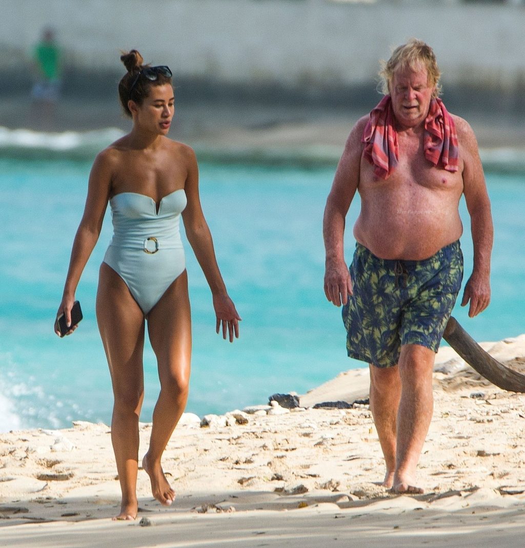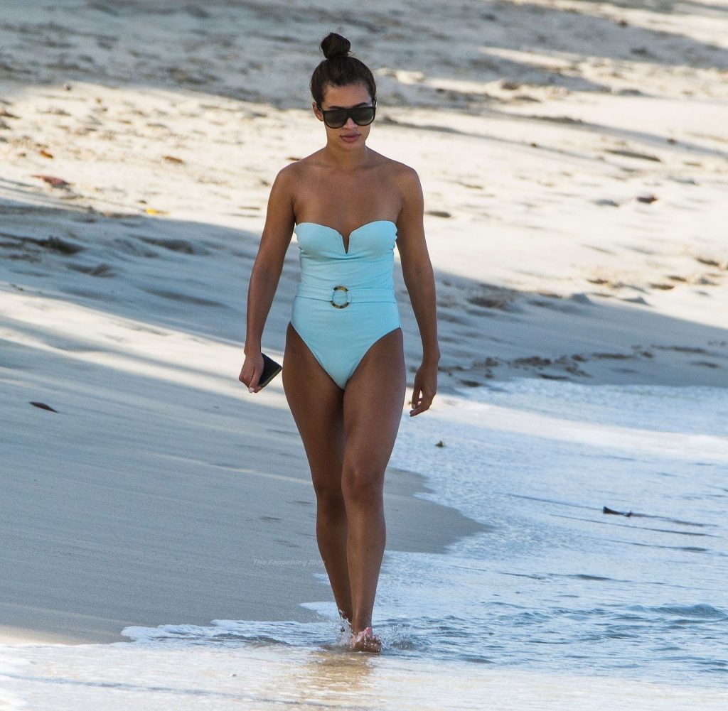 Portant son maillot de bain bleu clair minimaliste, la star sexy s’est promenée le long de la plage de sable doré à la paroisse de St. Peter.