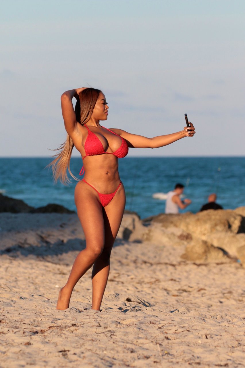 Le mannequin Moriah Mills porte un bikini rouge à la plage de Miami, 27/12/2017.
