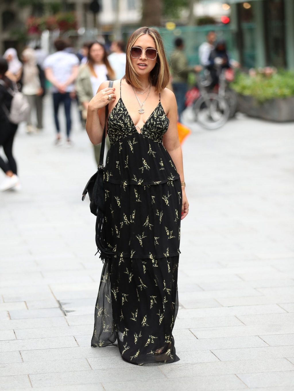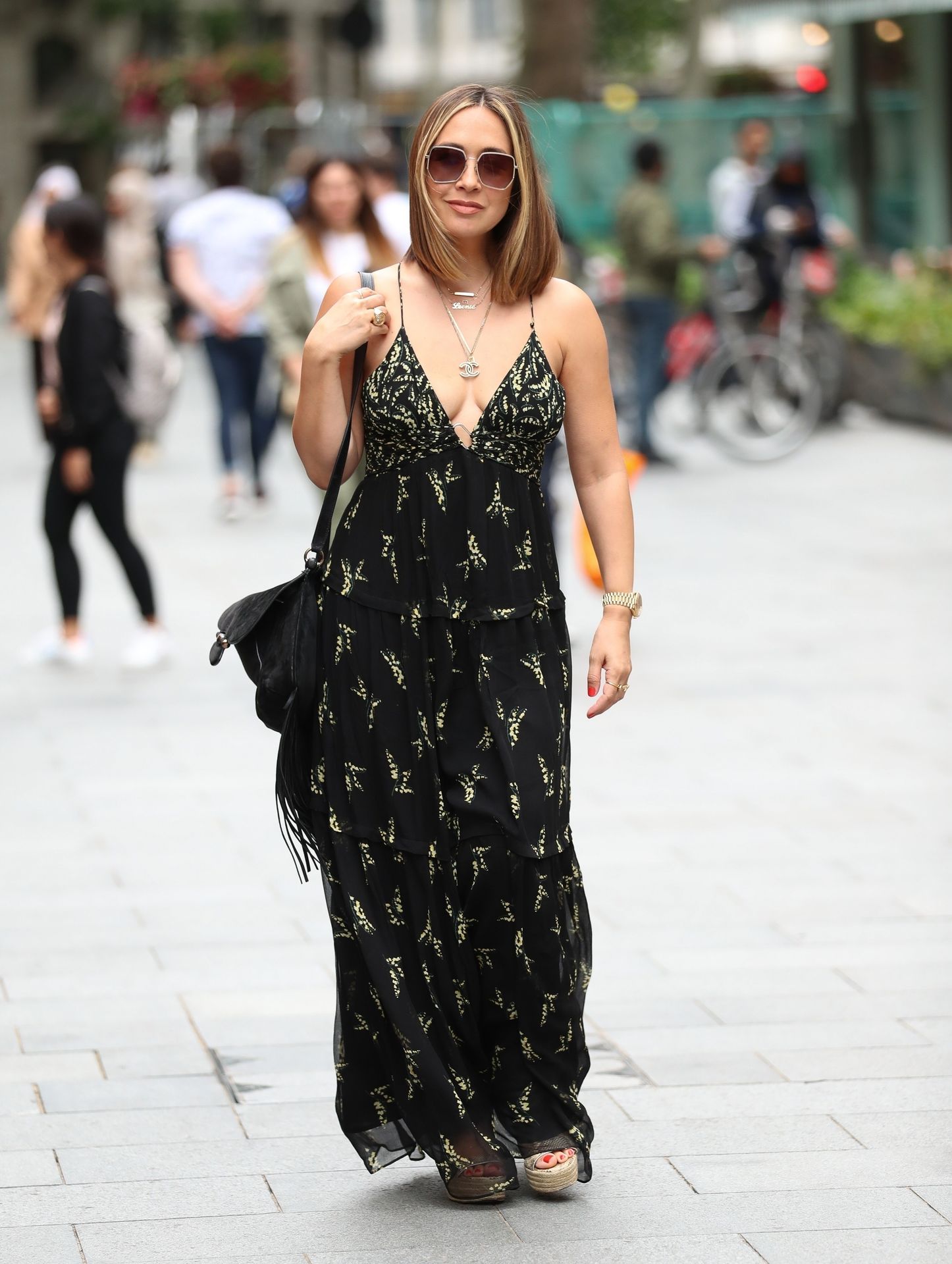 Myleene Klass a l’air sensationnelle en exhibant sa première coupe de cheveux post-confinement, arrivant à Global radio dans une robe maxi plongeante à Londres, le 07/04/2020.