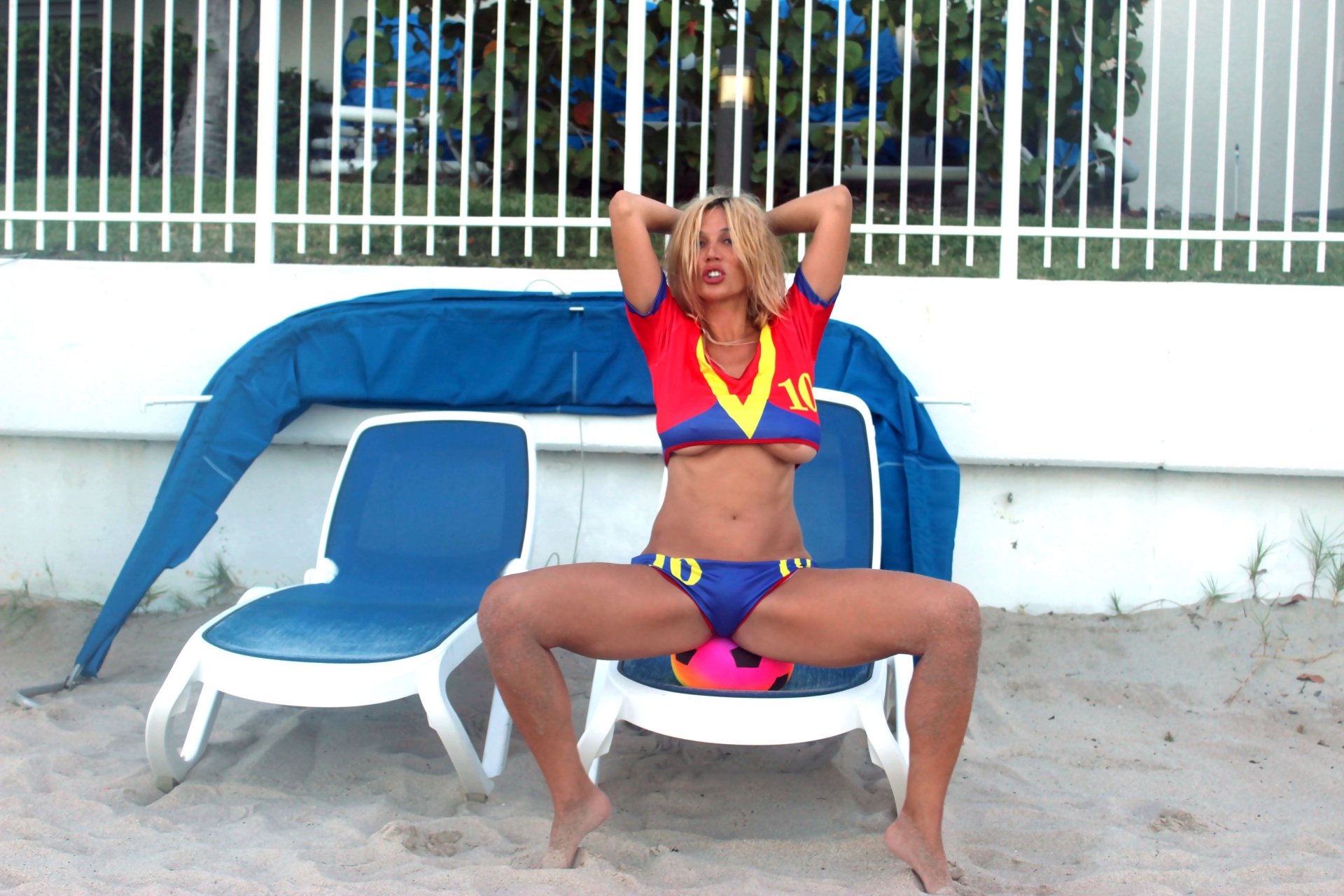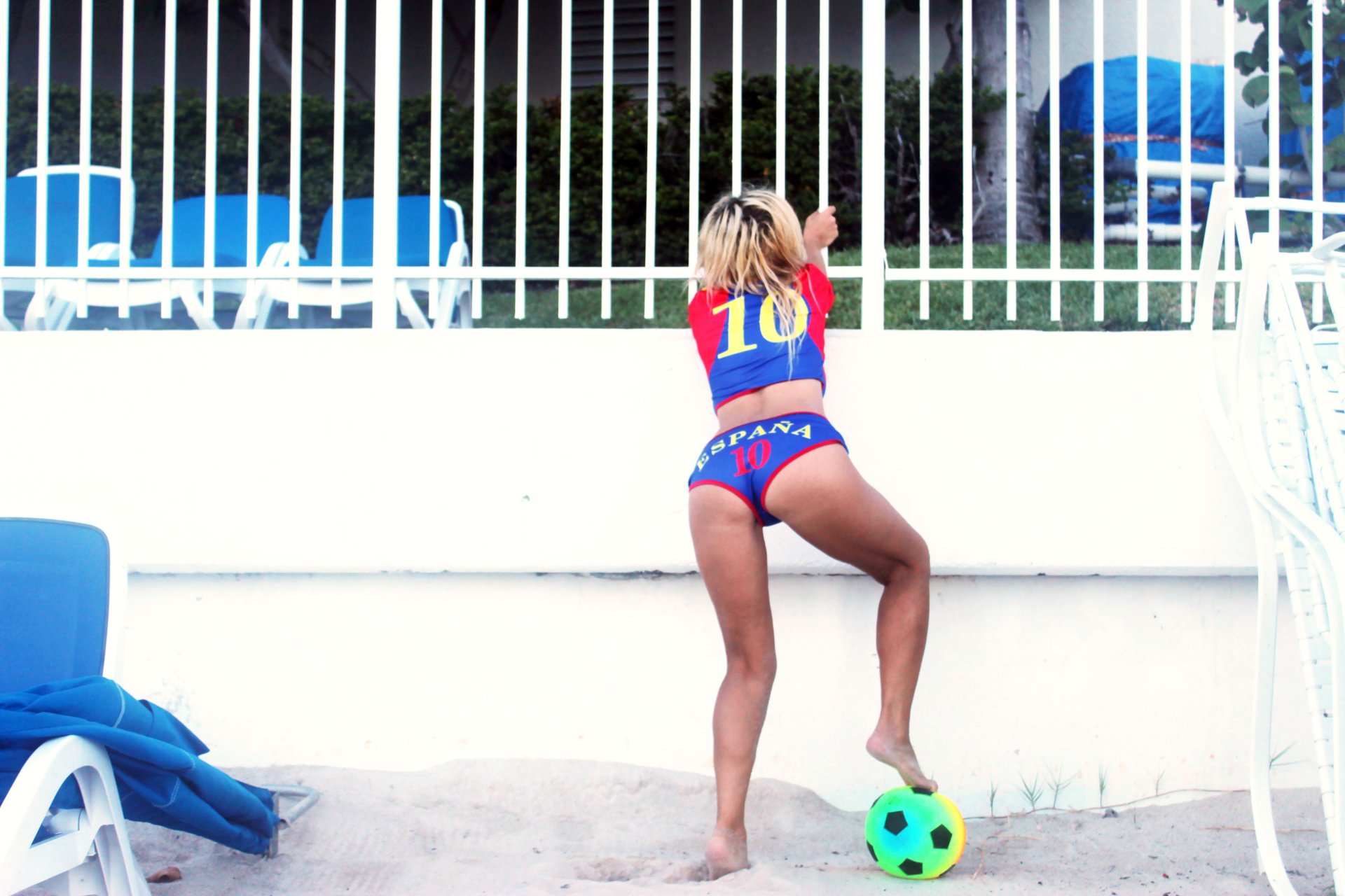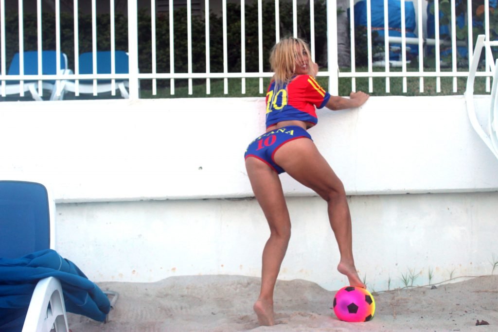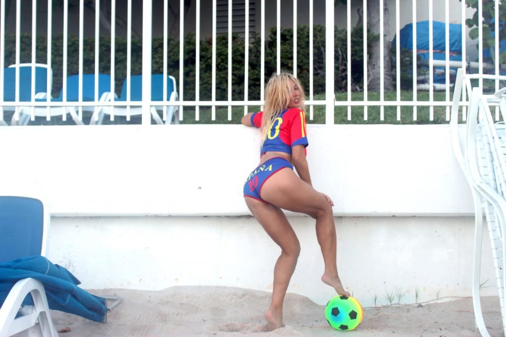 La chanteuse pop Nadeea Volianova célèbre la victoire de Barcelone lors du match de football Barcelone Madrid à Miami, le 30/07/2017.