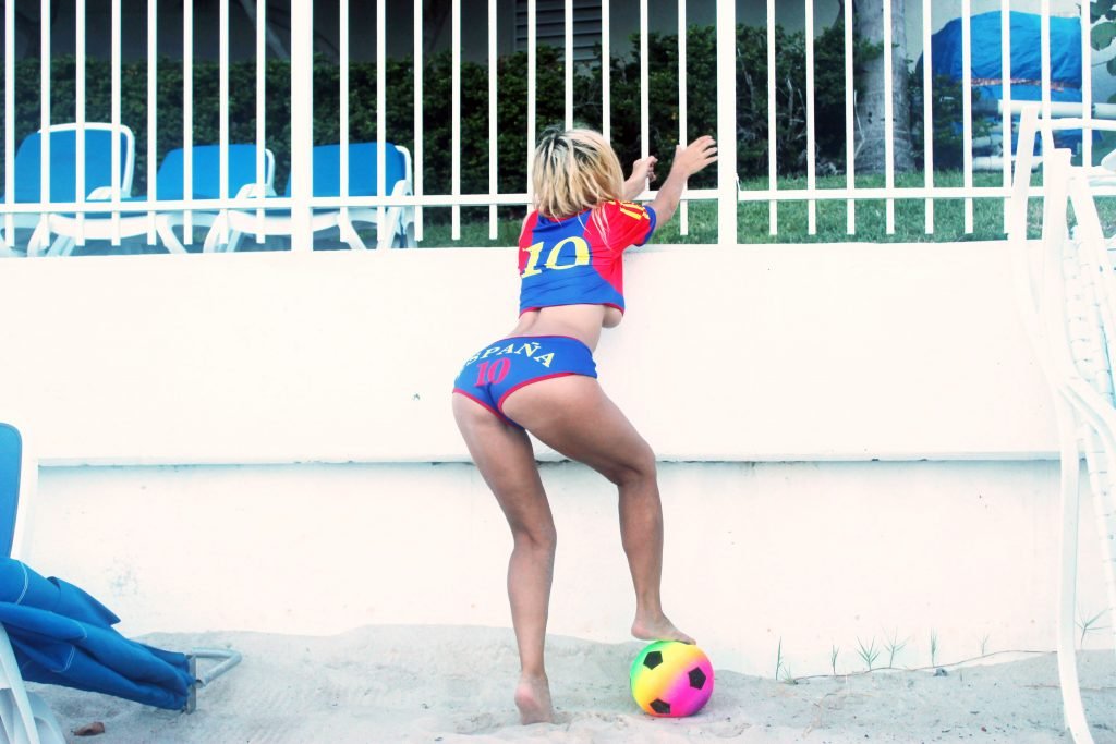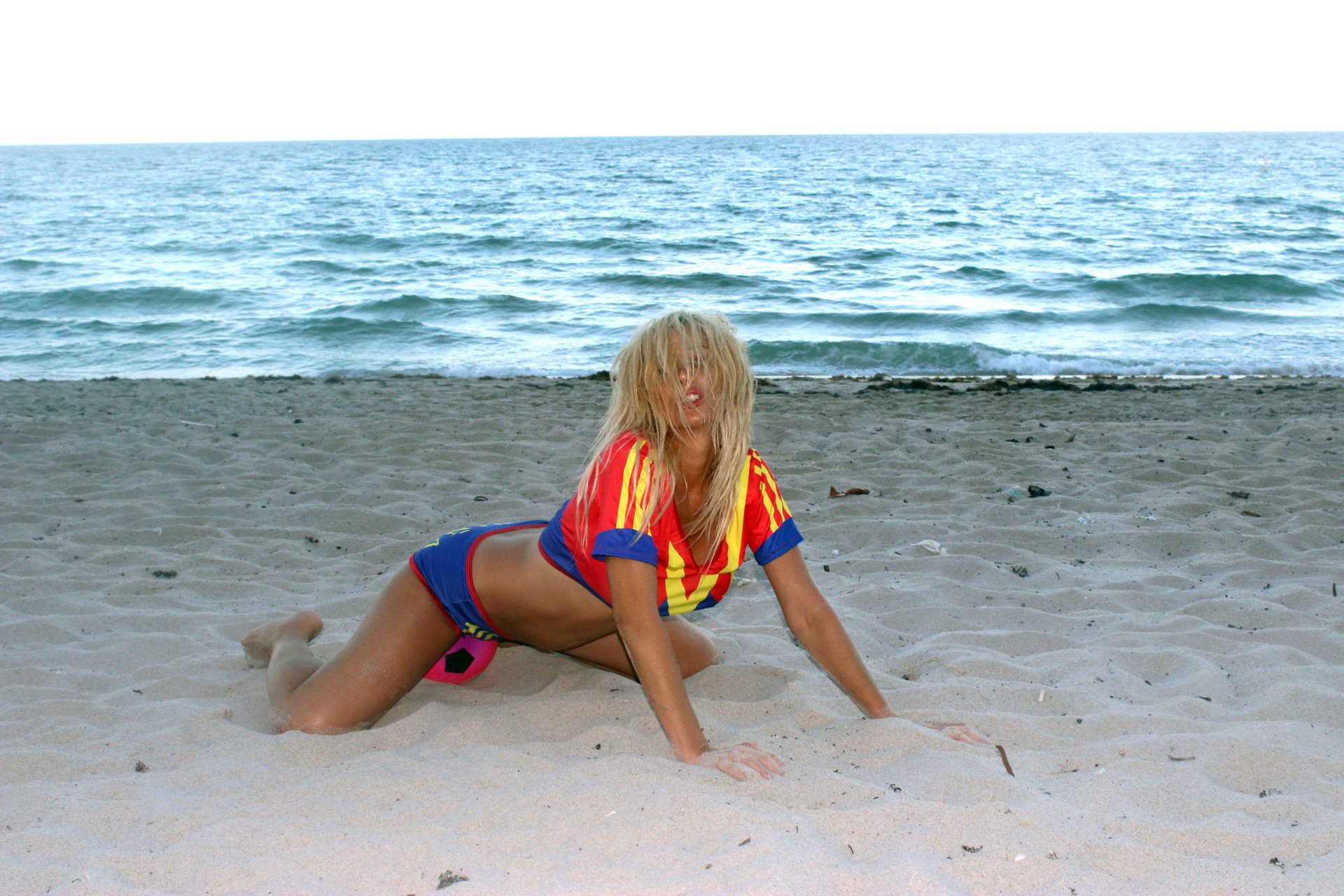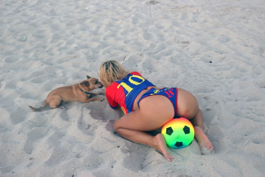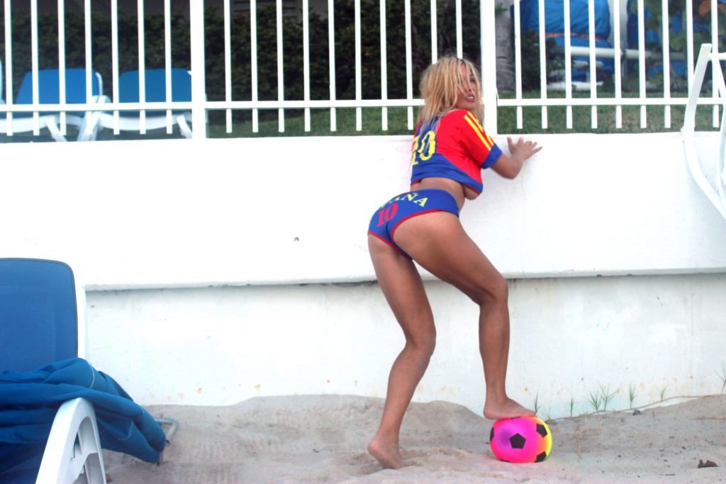 La chanteuse pop Nadeea Volianova célèbre la victoire de Barcelone lors du match de football Barcelone Madrid à Miami, le 30/07/2017.