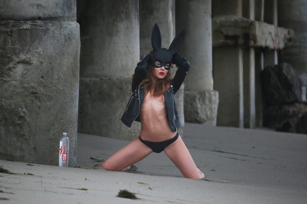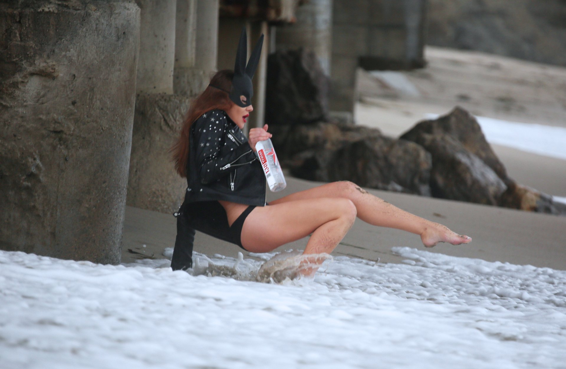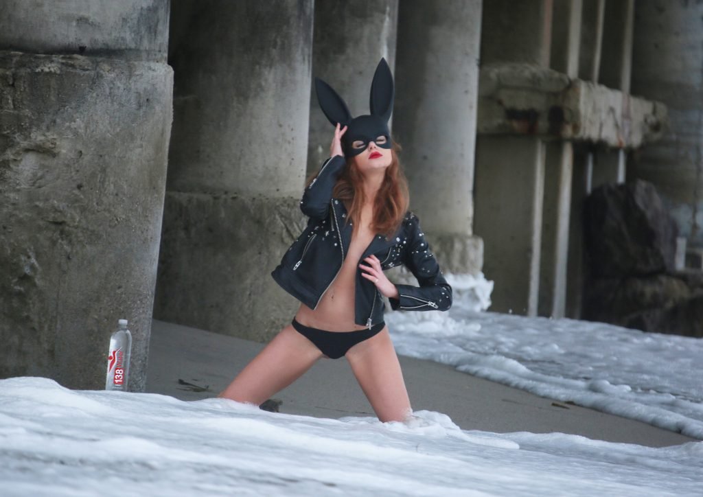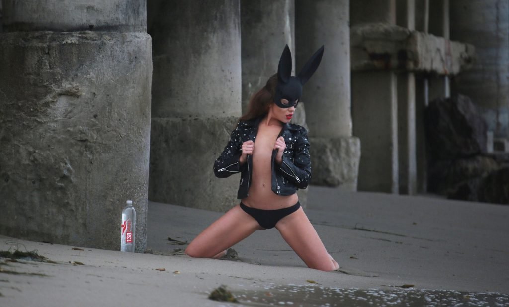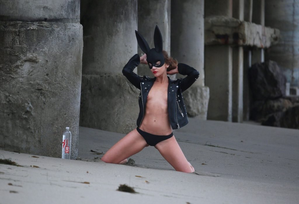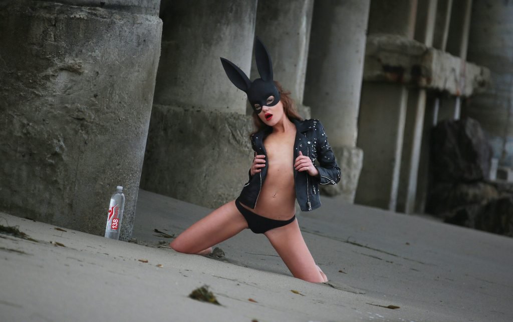 Le mannequin et actrice russe Natalia Borowsky porte des oreilles de lapin et une veste en cuir sexy avant de poser topless lors d’une séance photo 138 Water sur une plage privée en Californie du Sud, le 19/06/2018.