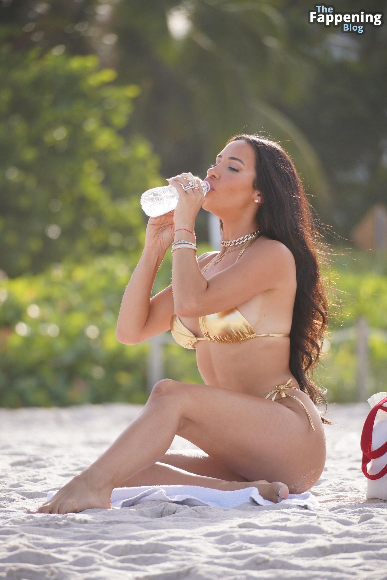 Life Coach et conférencière motivatrice Natasha Graziano est vue sur la plage en bikini doré, 16/07/2023.
