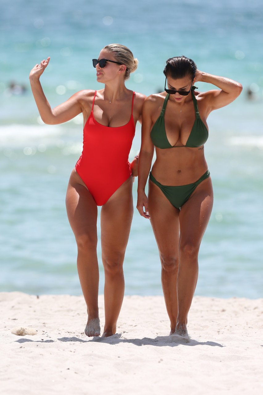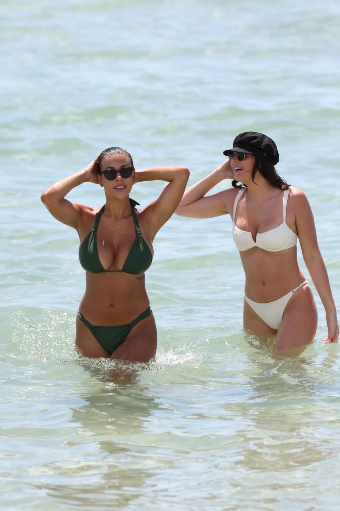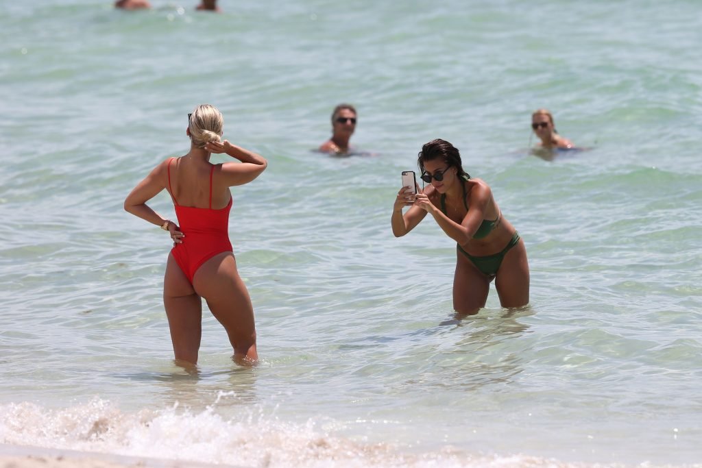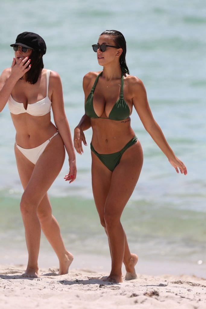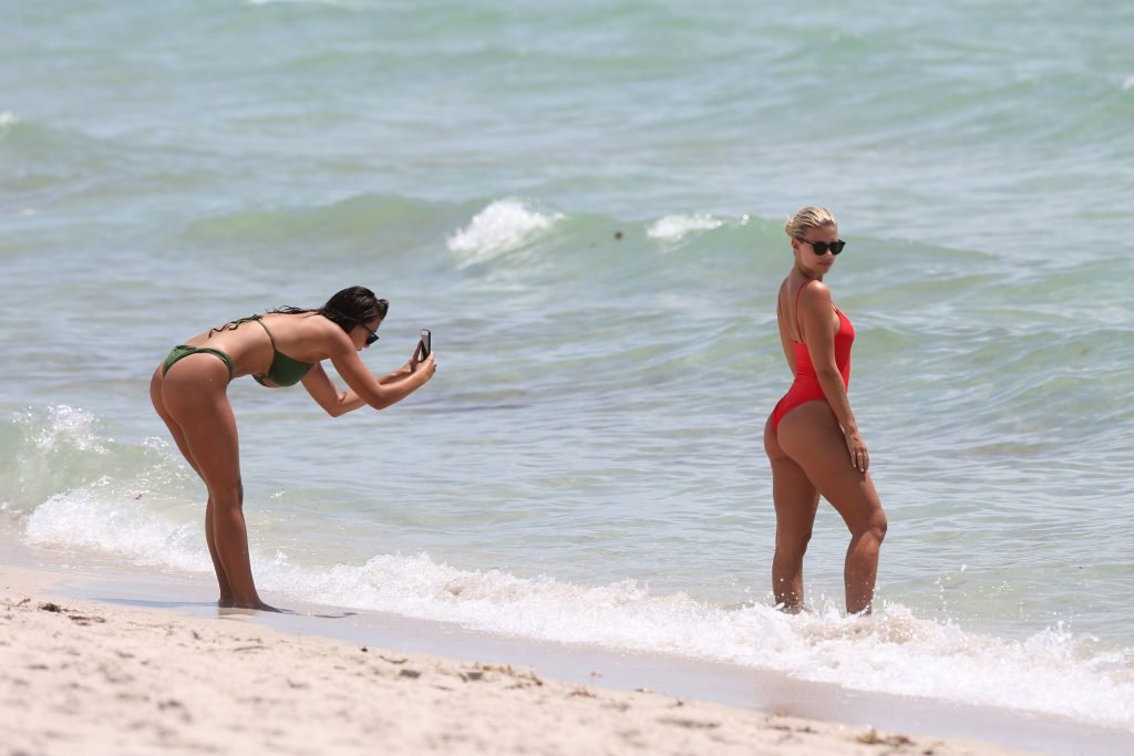 Les mannequins Natasha Oakley et Devin Brugman exhibent leurs corps sexy alors qu’elles se rendent à la plage à Miami, 19/07/2017.