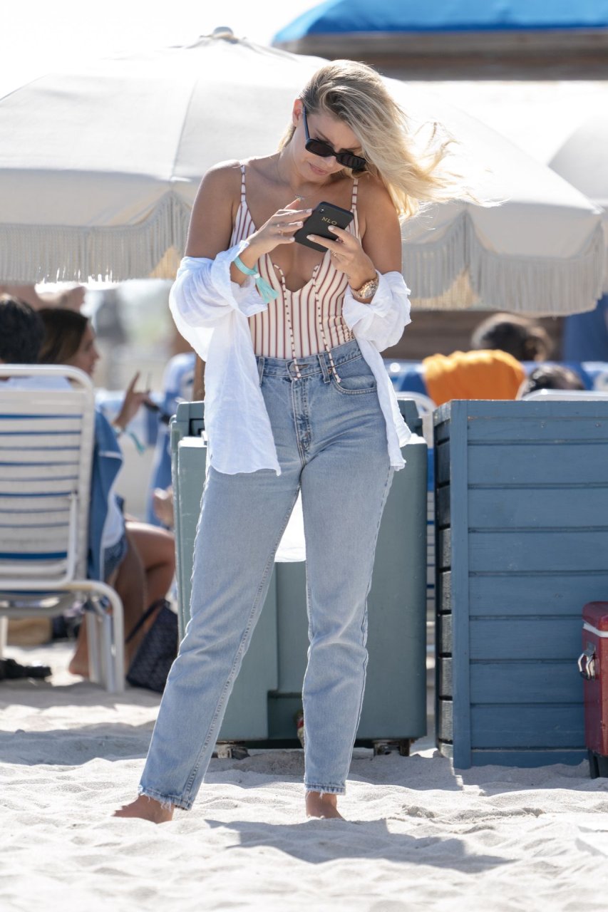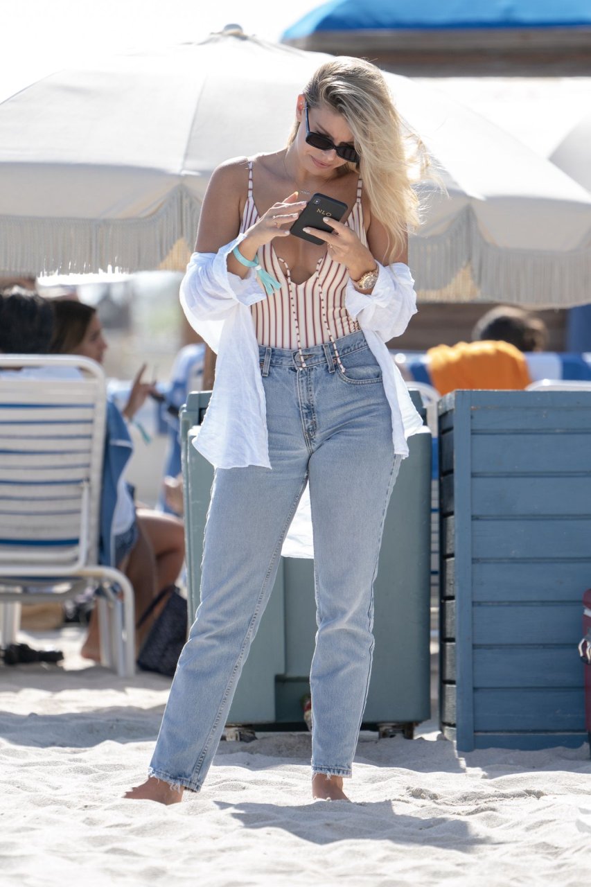 Le mannequin Natasha Oakley (28 ans) met en valeur son décolleté en portant un maillot de bain rayé tout en profitant d’une journée à la plage à Miami, le 12/08/2018.