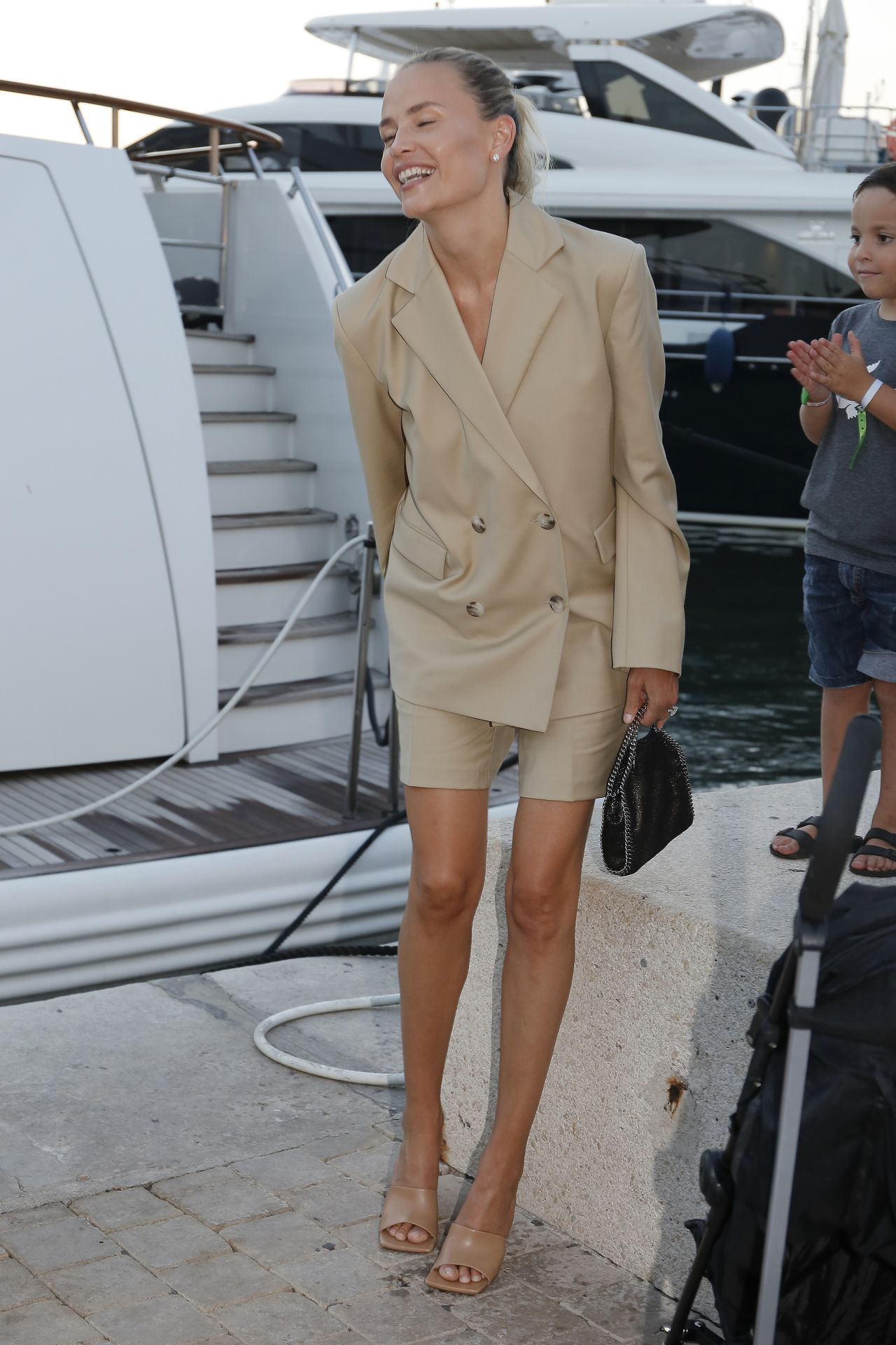 Le mannequin Natasha Poly (34 ans) descend de son yacht vêtue d’un blazer lumineux et d’un short assorti pour dîner à Saint-Tropez, 28/06/2020.