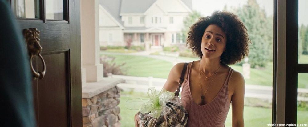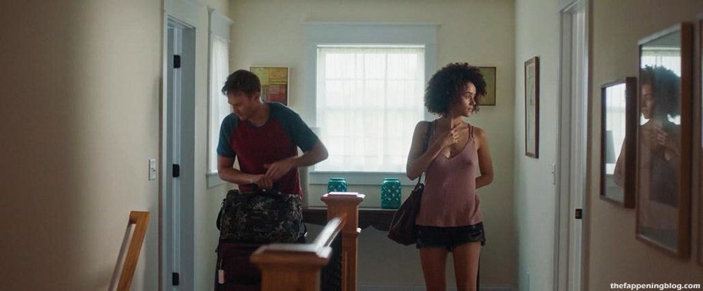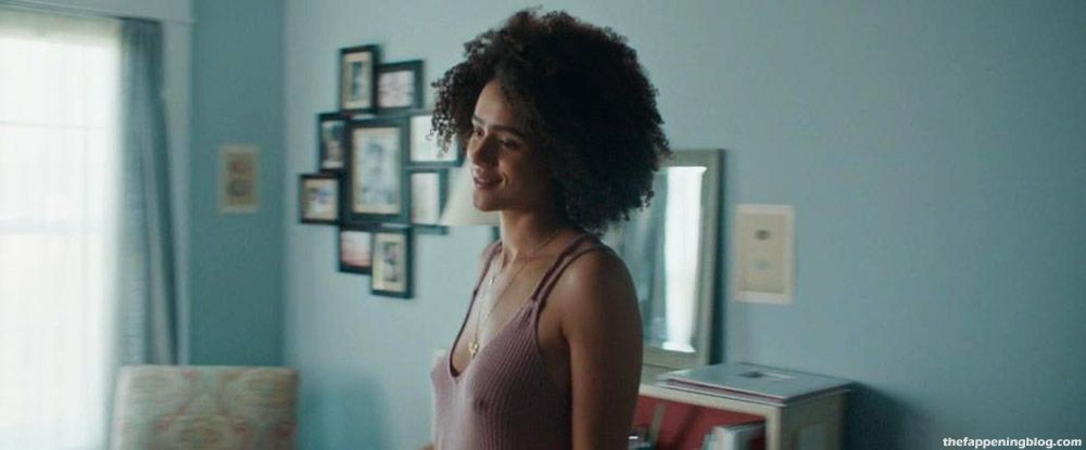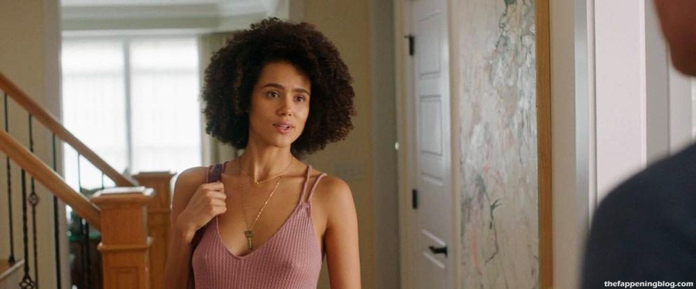 Sexy ebony Nathalie Emmanuel is standing at the front door of a house. The guy opens it up, revealing Nathalie wearing a thin tank top that shows pokey nipples. She continues to show pokies as she talks to the guy, leading him up a stairway and into a bedroom.