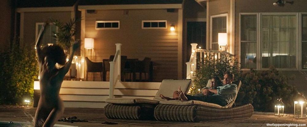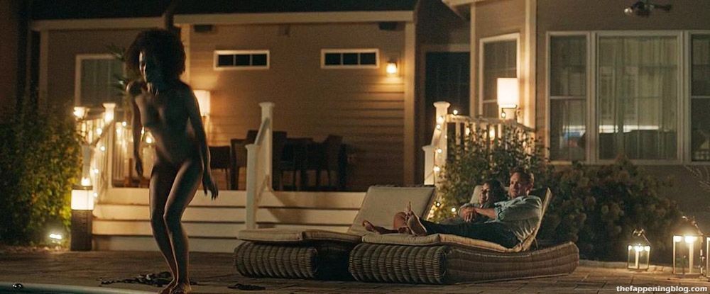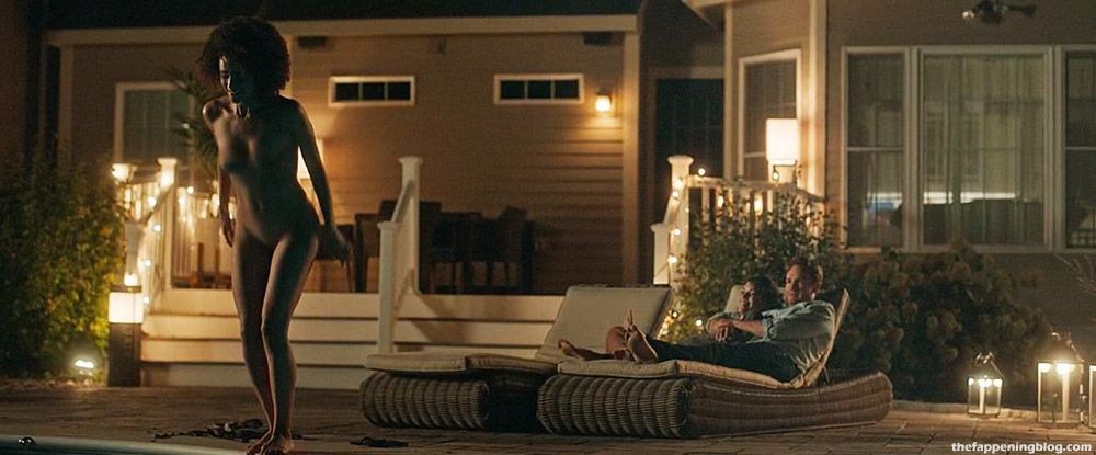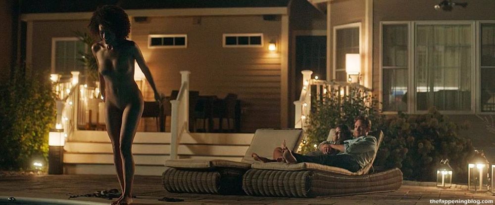 Nathalie Emmanuel is seen topless and with naked pussy, as she jumps into a swimming pool with no clothes on.