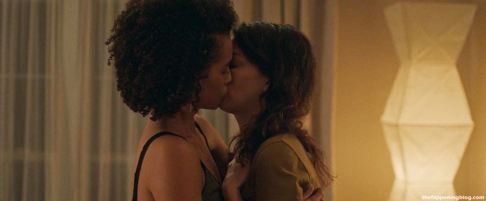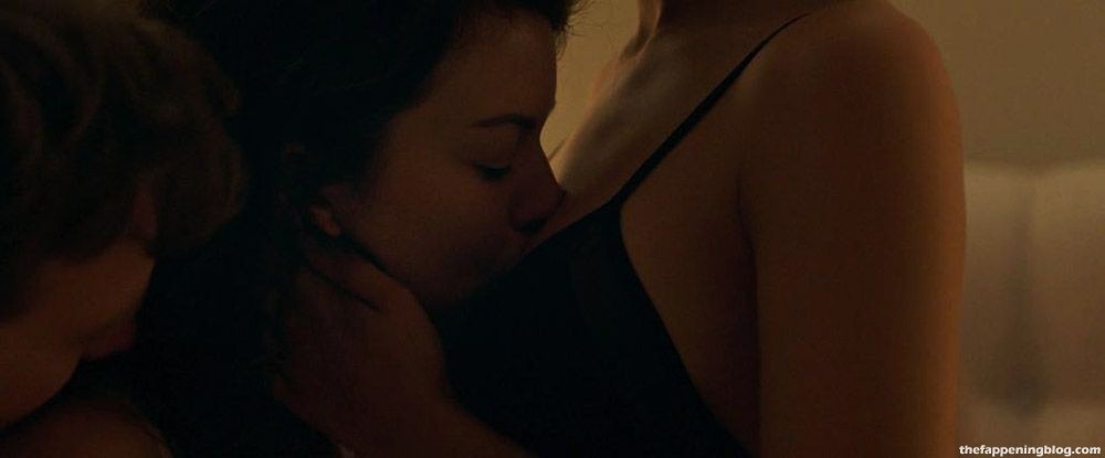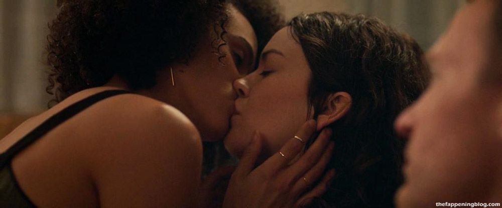 Then Nathalie Emmanuel and Britt Lower are making out as a guy watches. The girls join him on a bed for a threesome, both of them undressing to lingerie. The girls then kiss some more, and Britt kisses Nathalie’s cleavage before they lay down on either side of the guy.