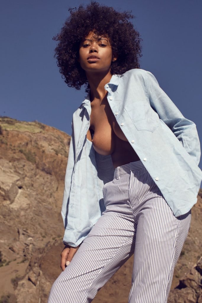 Nereyda Bird photographiée par Mitchell Tomlinson à West Hollywood (2018). Nereyda Bird est un mannequin américain de 20 ans. La beauté noire, élevée à Philly et basée à Miami, a exhibé ses gros seins naturels sous les cieux azurés et les collines couleur caramel de Bronson Canyon.