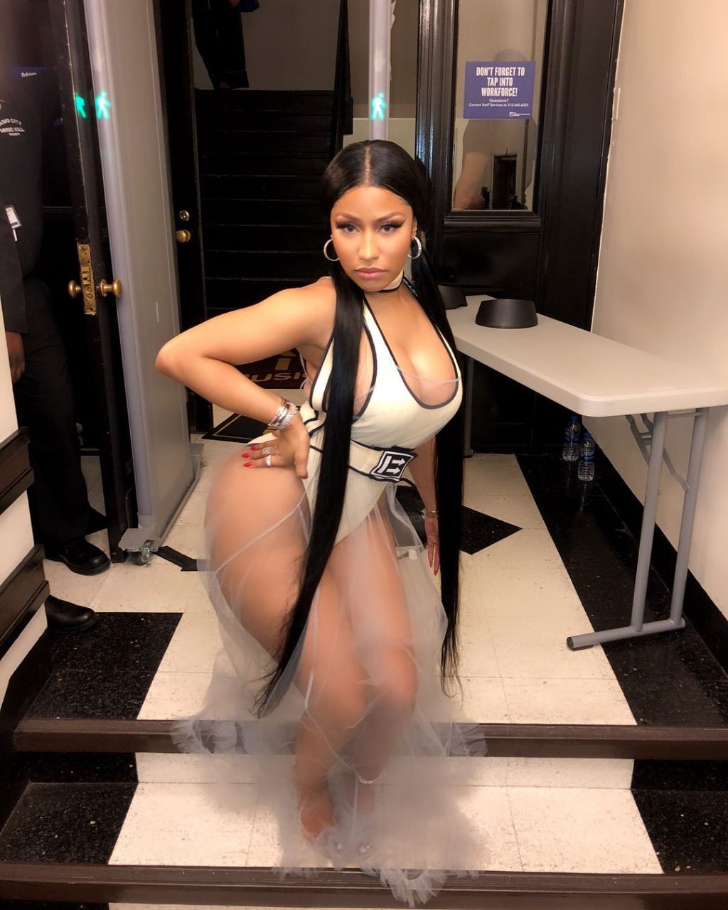 Brune Nicki Minaj exhibe ses courbes aux MTV VMA 2018 au Radio City Music Hall à New York, le 20/08/2018. La chanteuse de 35 ans a choisi pour l’événement un body moulant crème.