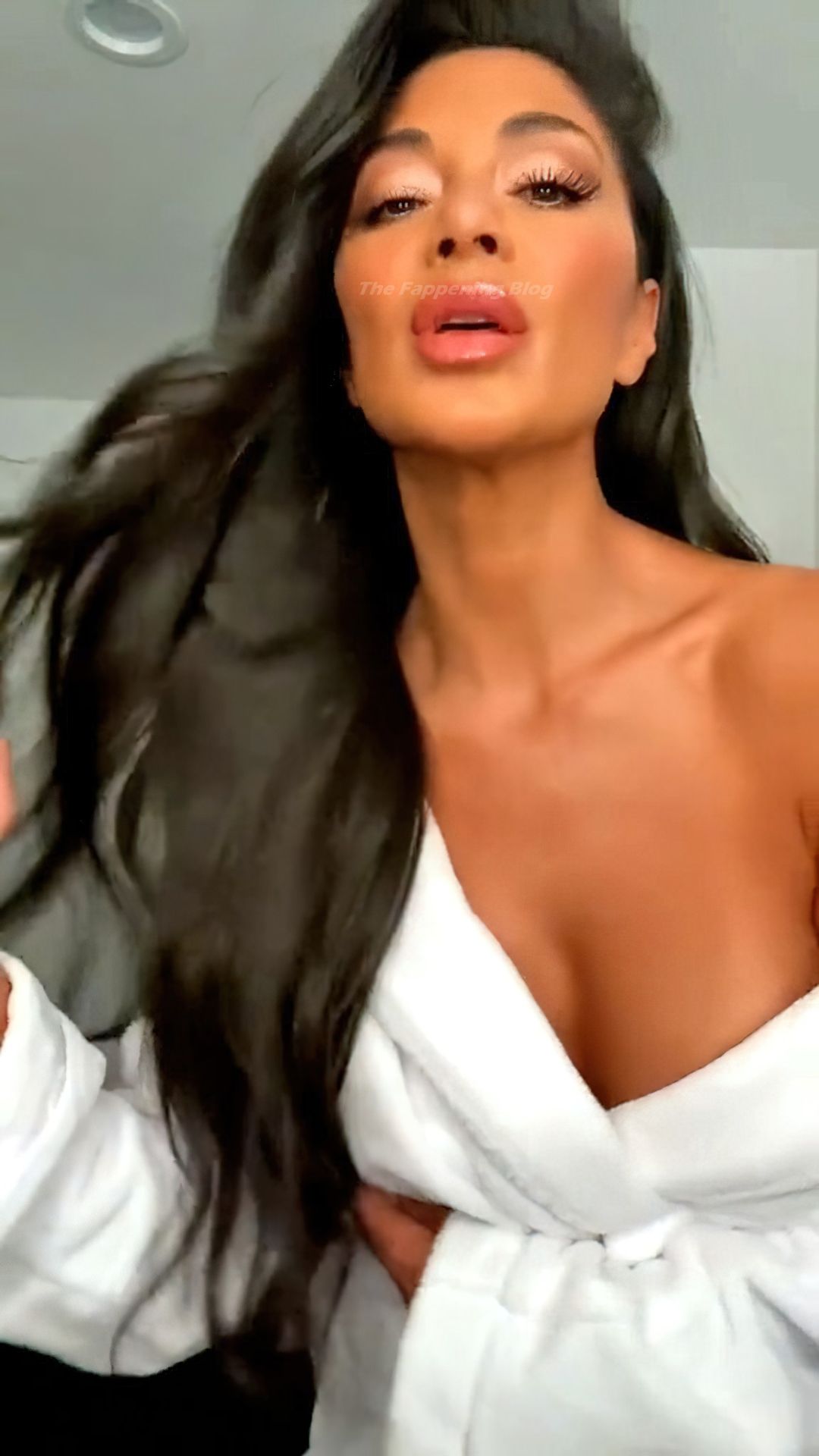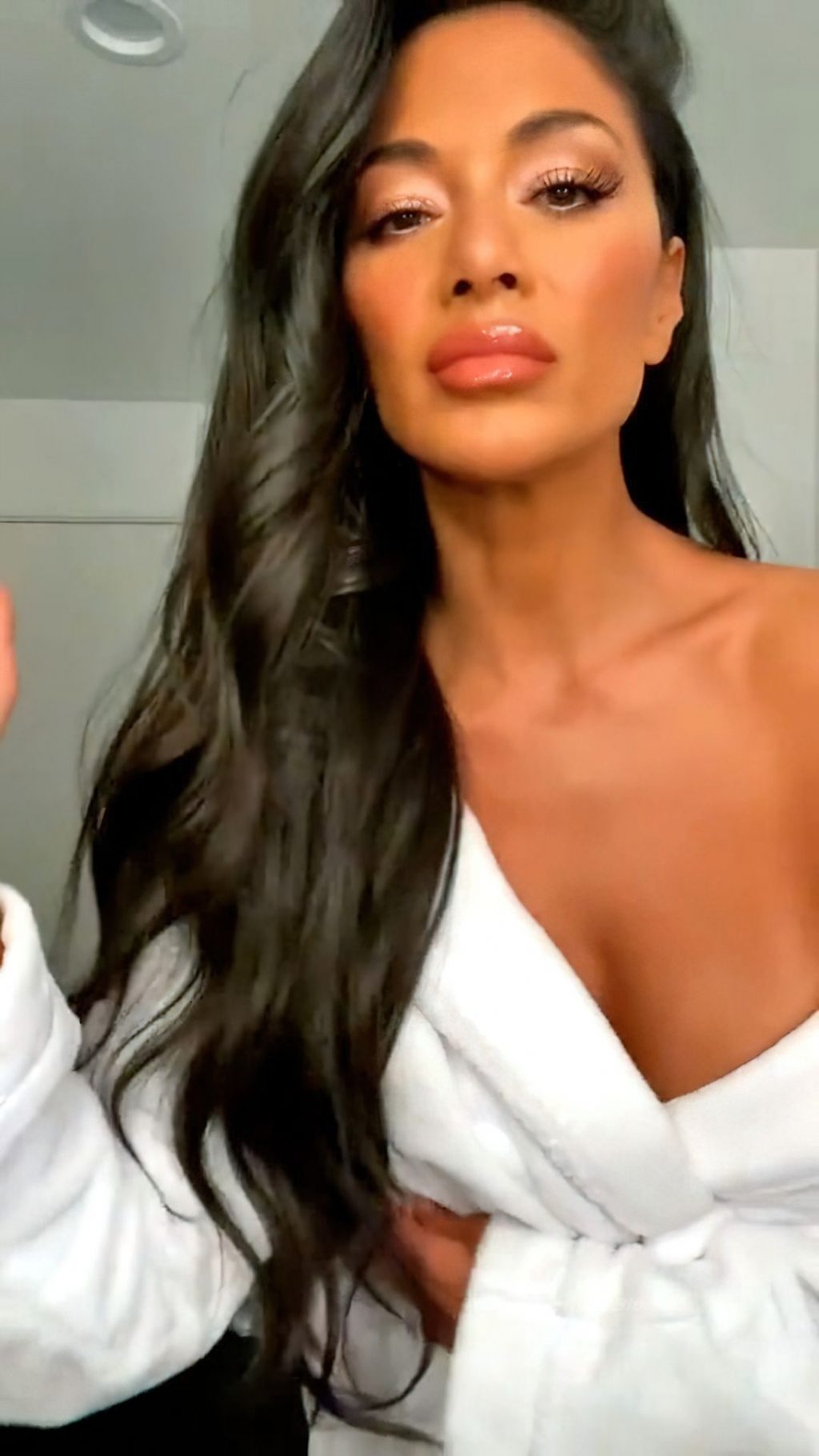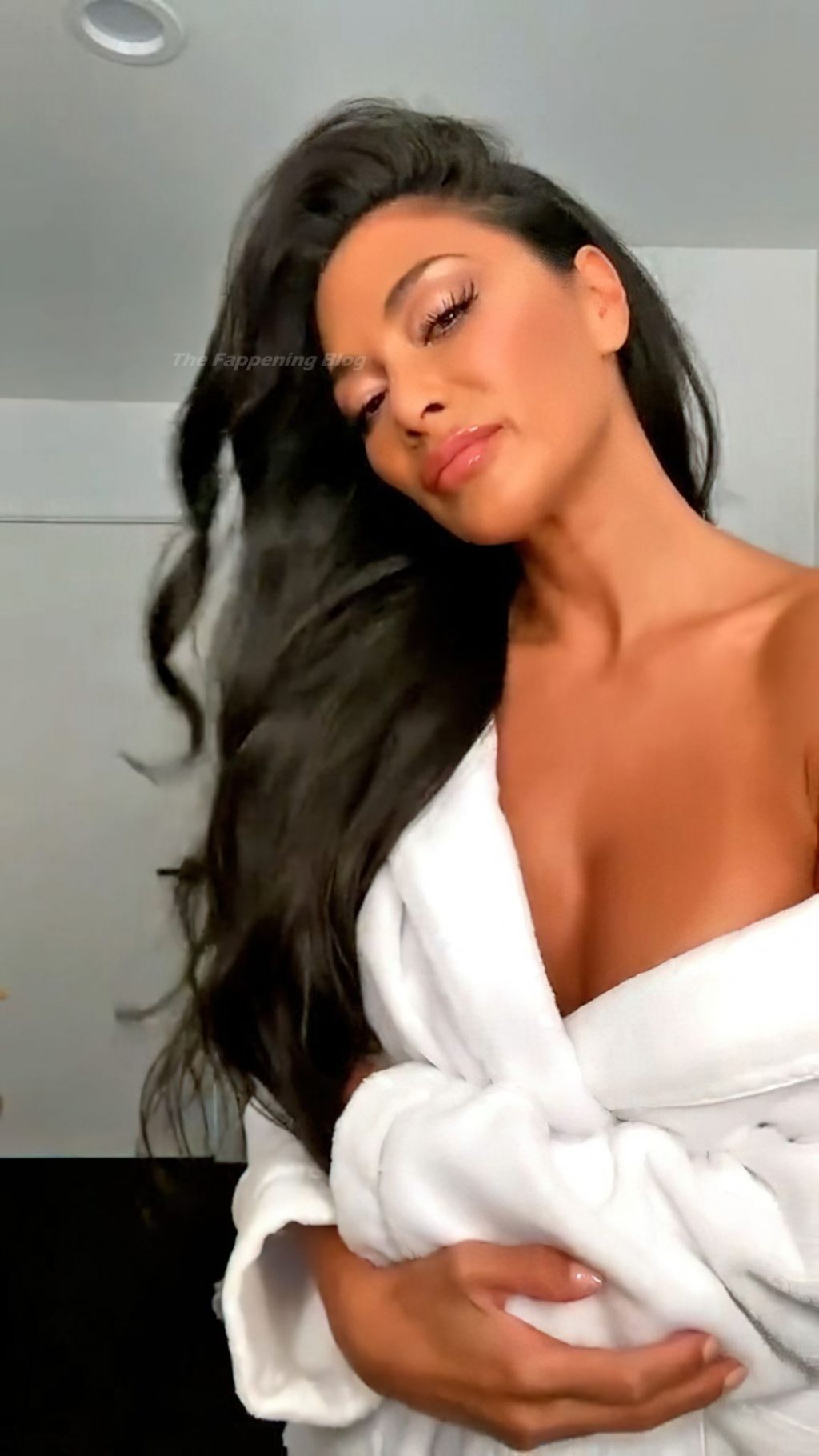 La star du Fappening Nicole Scherzinger exhibe son décolleté en posant dans un peignoir blanc ouvert dans une vidéo sexy pour Instagram/TikTok, 02/10/2021.