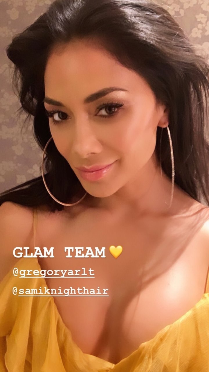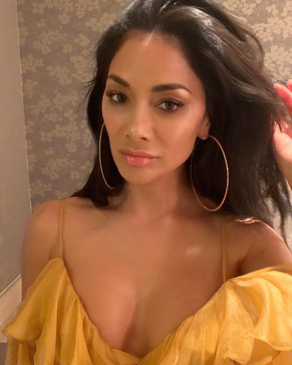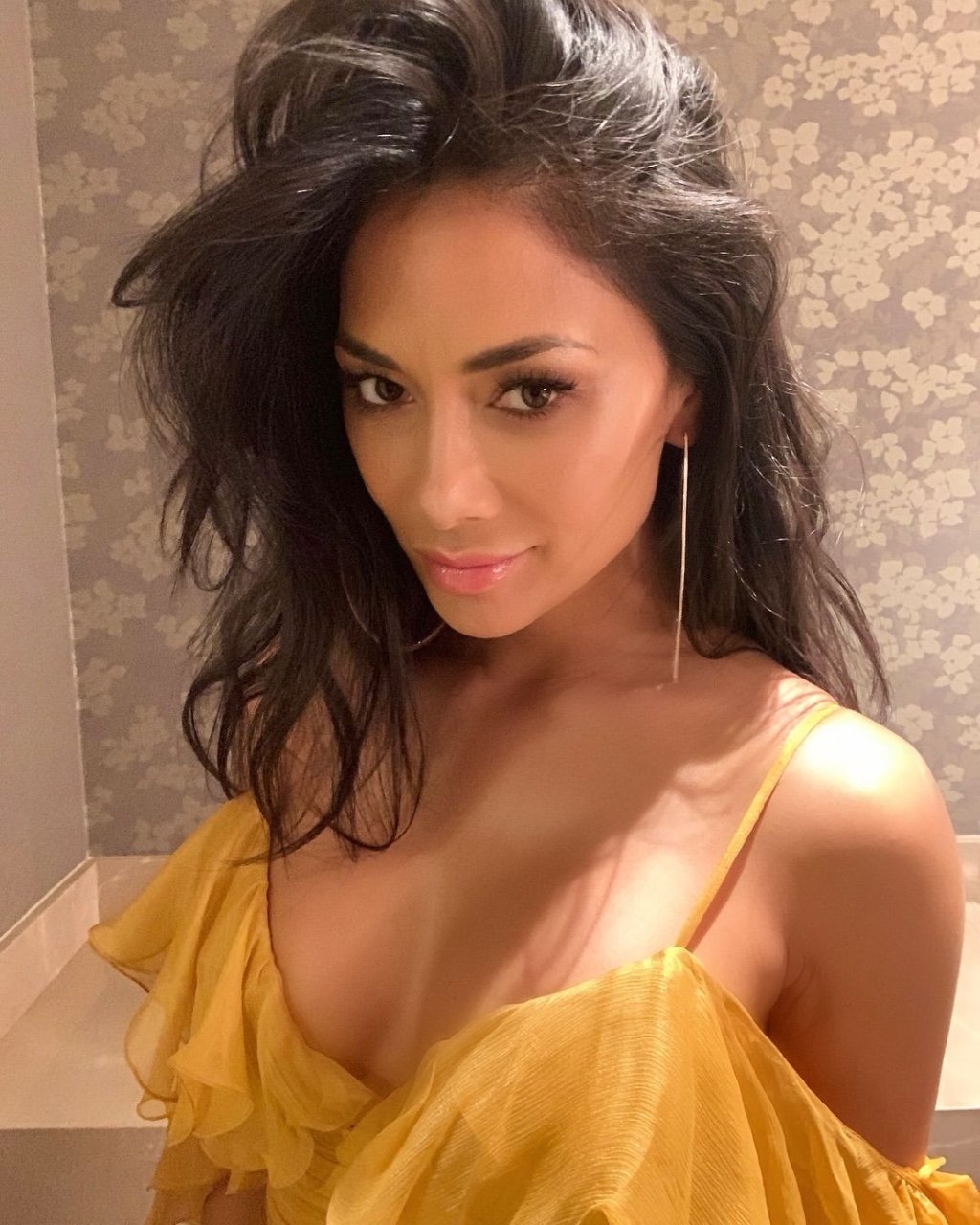 Chanteuse, star de la télévision et The Fappening, la brune pulpeuse Nicole Scherzinger montre son décolleté en portant une robe jaune – Instagram, 03/03/2019.