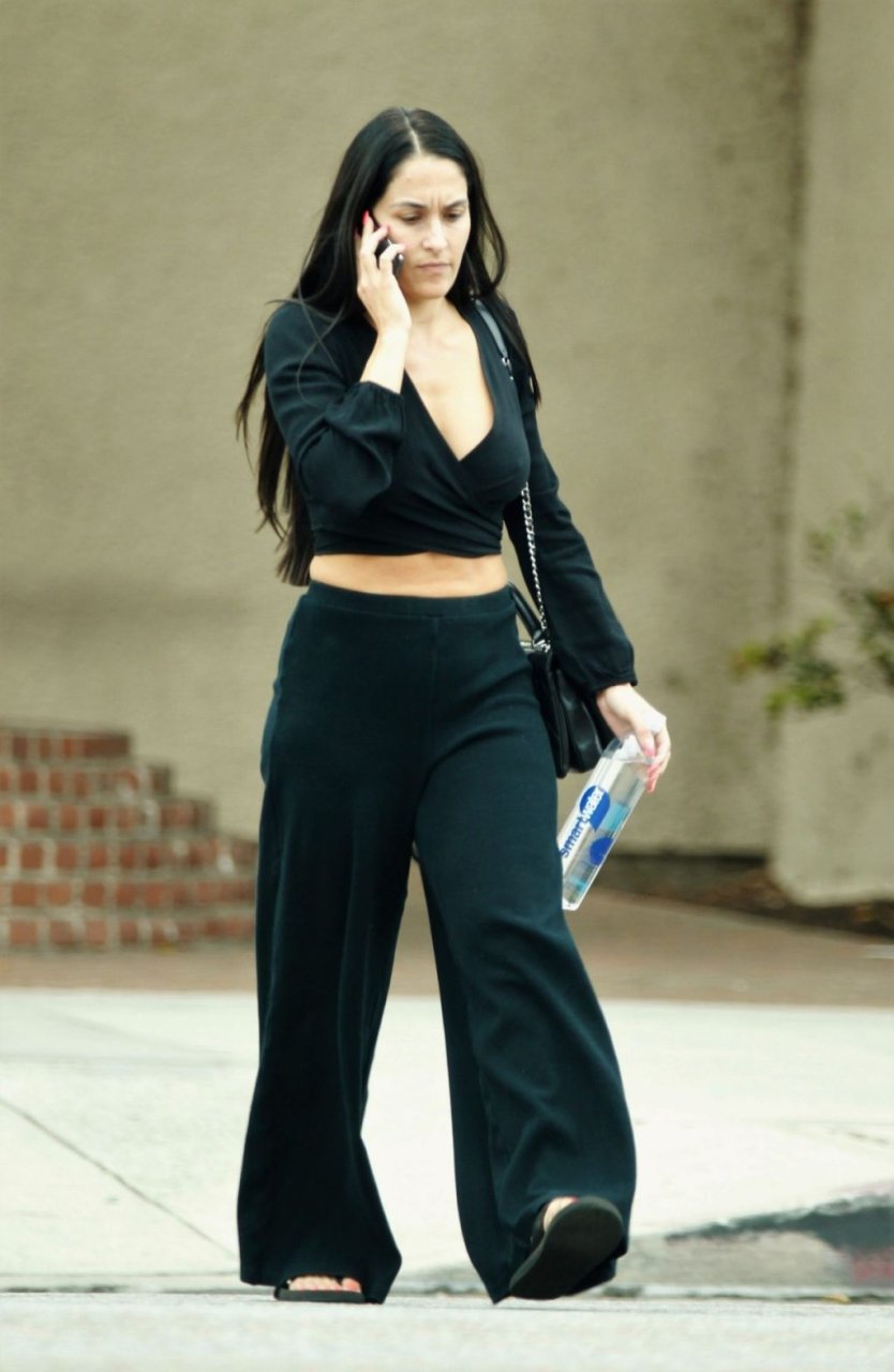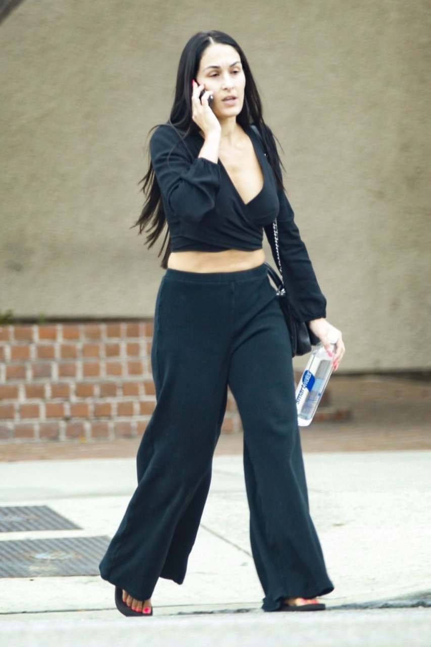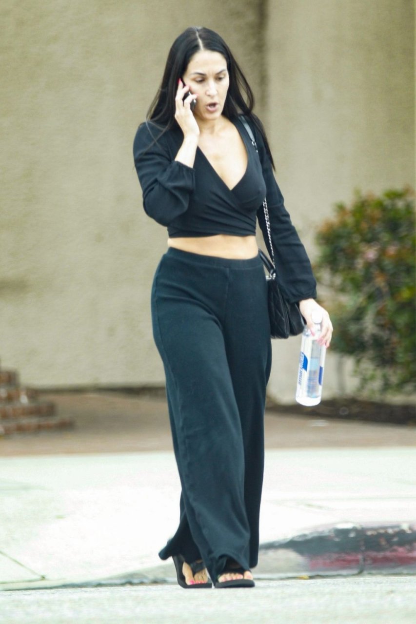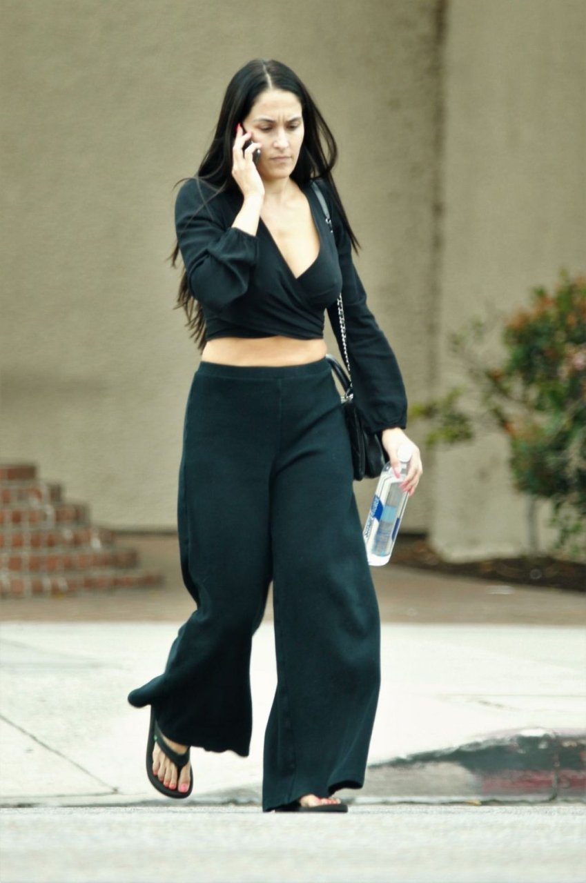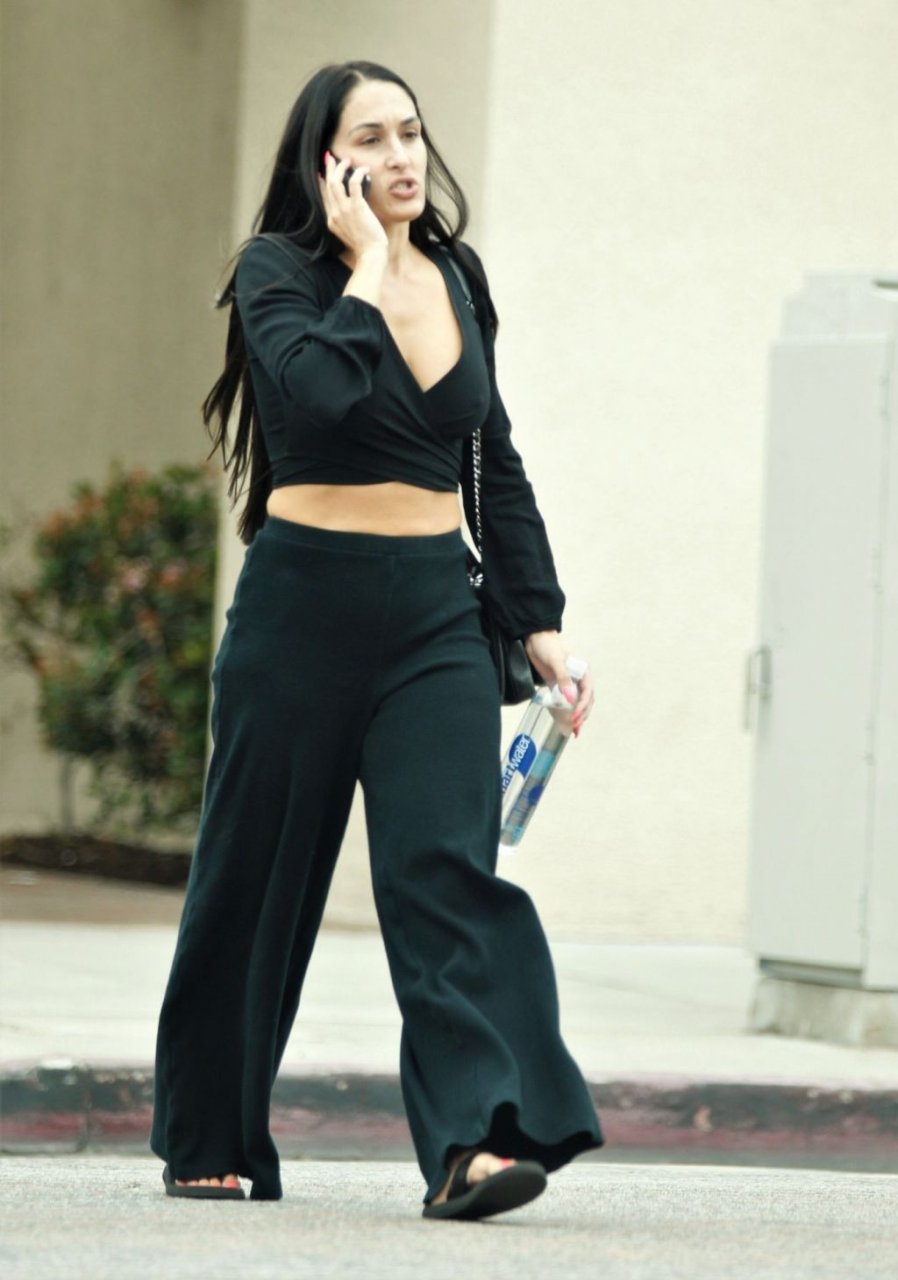 Nikki Bella sort en pantalon de survêtement évasé décontracté et un chemisier noir enveloppé à Studio City, le 08/05/2019. La lutteuse retraitée de 35 ans répond à un appel téléphonique en se promenant.
