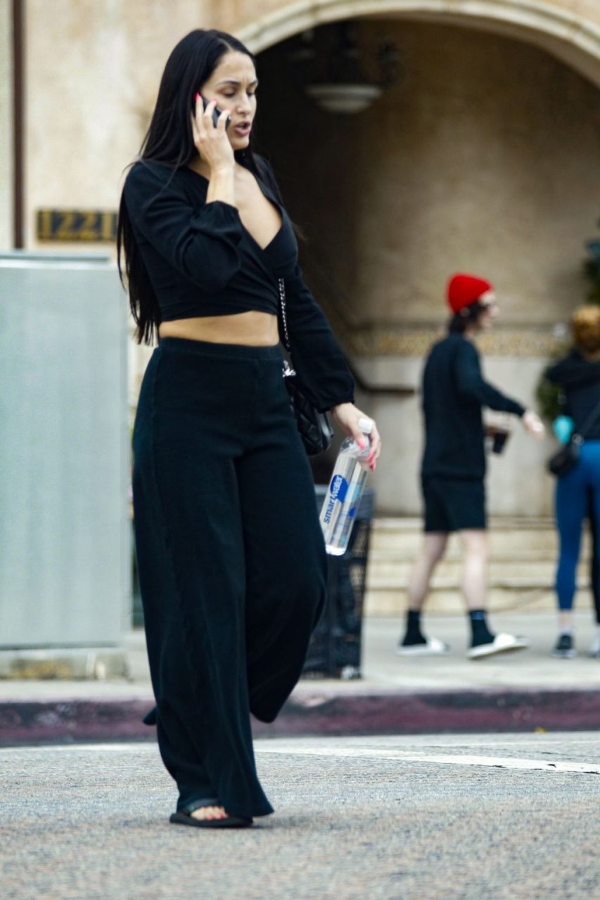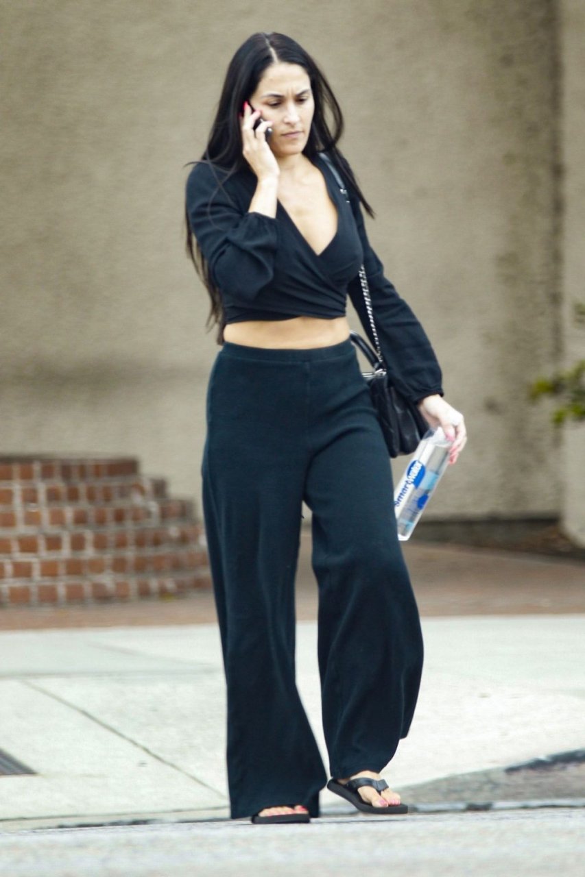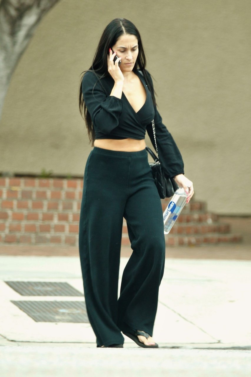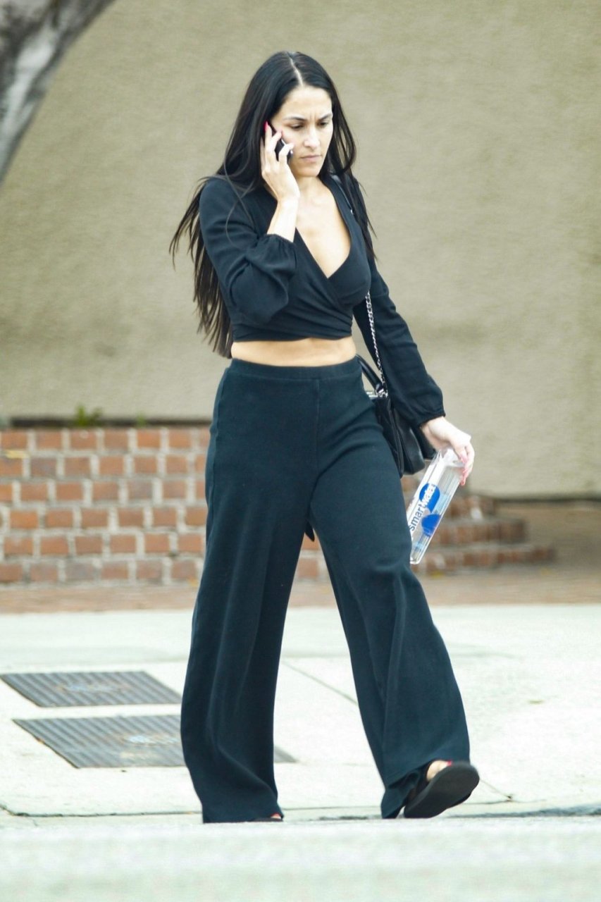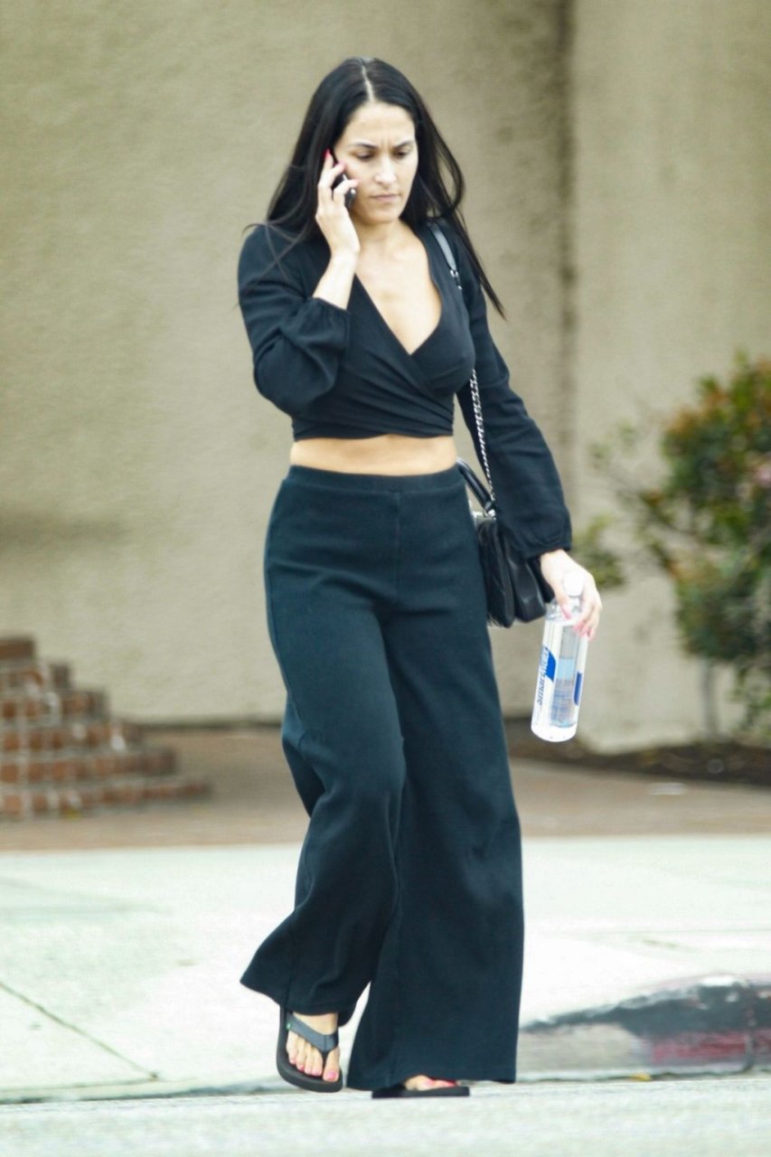 Nikki Bella sort en pantalon de survêtement évasé décontracté et un chemisier noir enveloppé à Studio City, le 08/05/2019. La lutteuse retraitée de 35 ans répond à un appel téléphonique en se promenant.