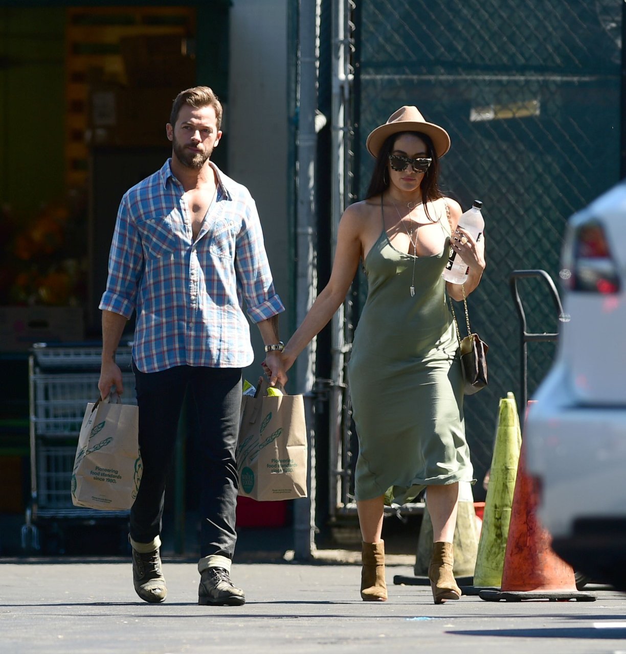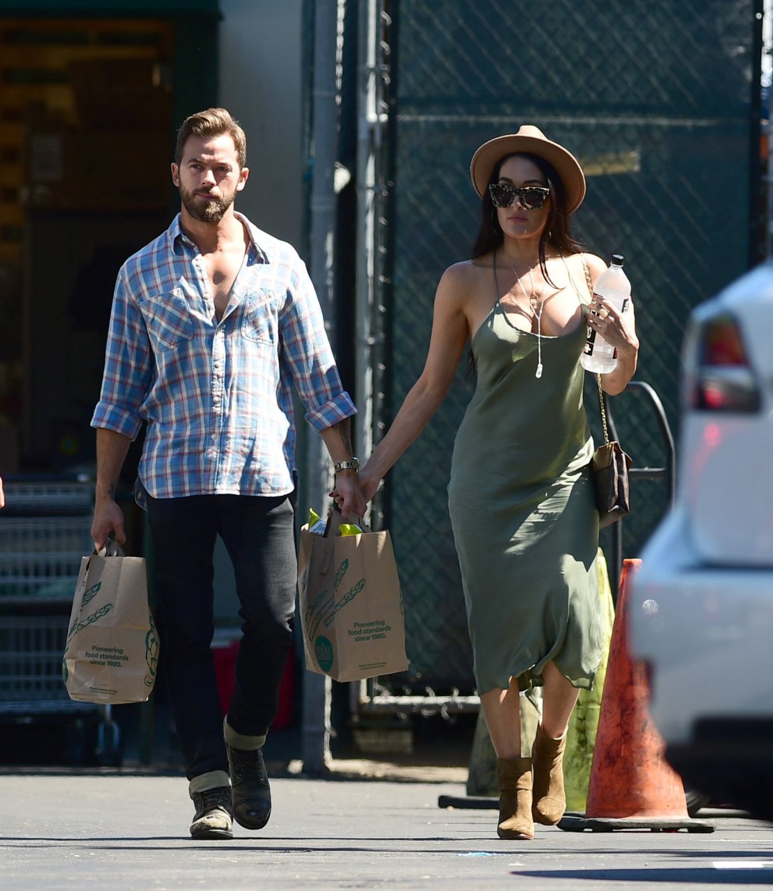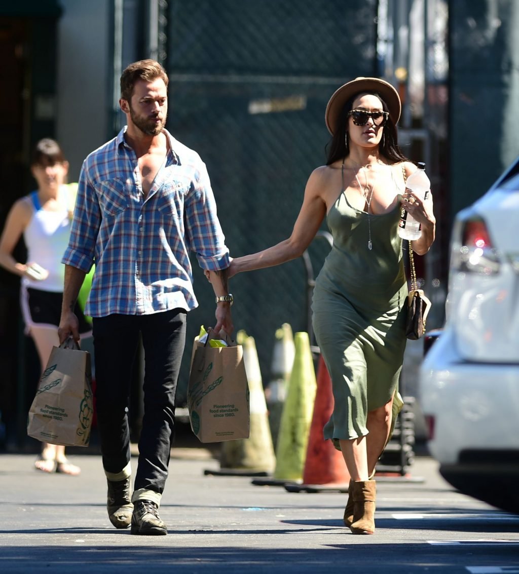 Nikki Bella tient le bras d’Artem Chigvintsev pendant qu’il porte des courses à Los Angeles, le 30/06/2019. La lutteuse professionnelle de 35 ans portait un fedora, une robe verte et des bottes marron.