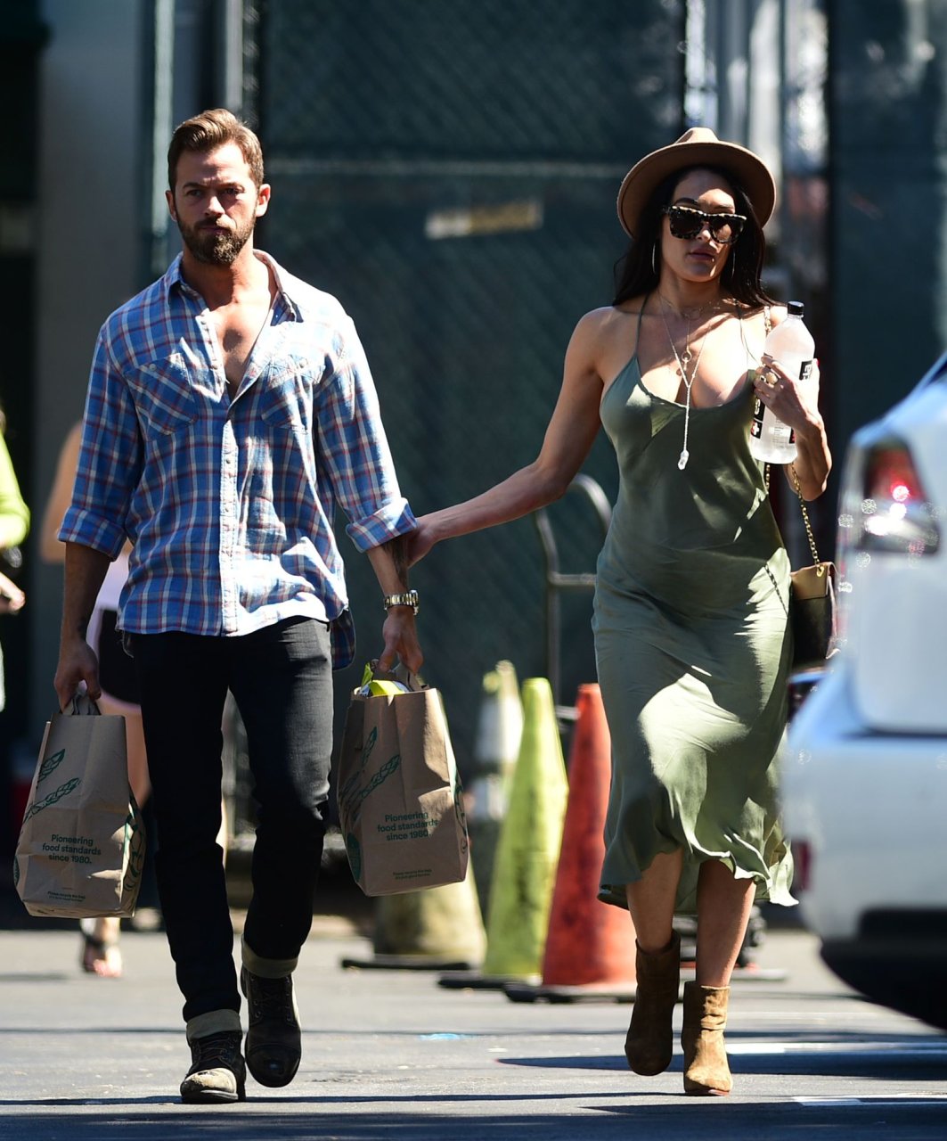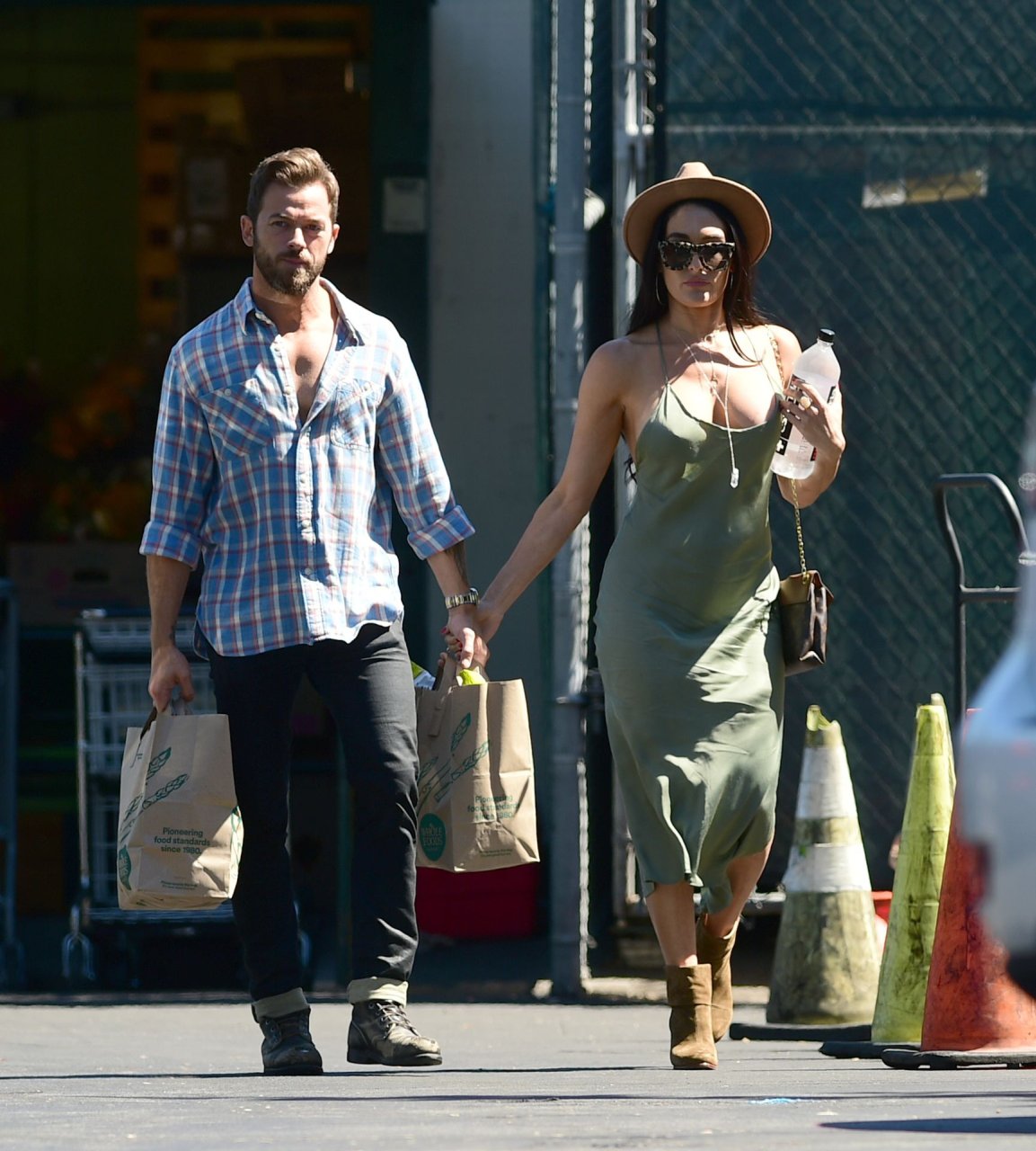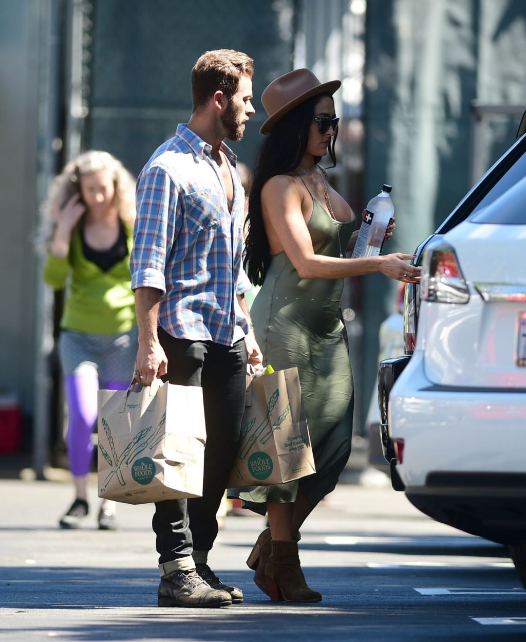 Nikki Bella tient le bras d’Artem Chigvintsev pendant qu’il porte des courses à Los Angeles, le 30/06/2019. La lutteuse professionnelle de 35 ans portait un fedora, une robe verte et des bottes marron.