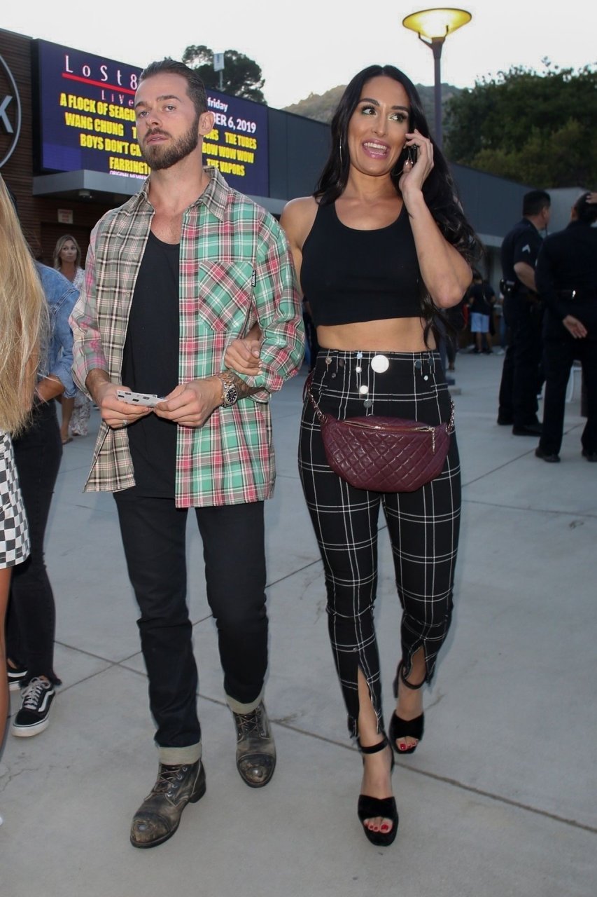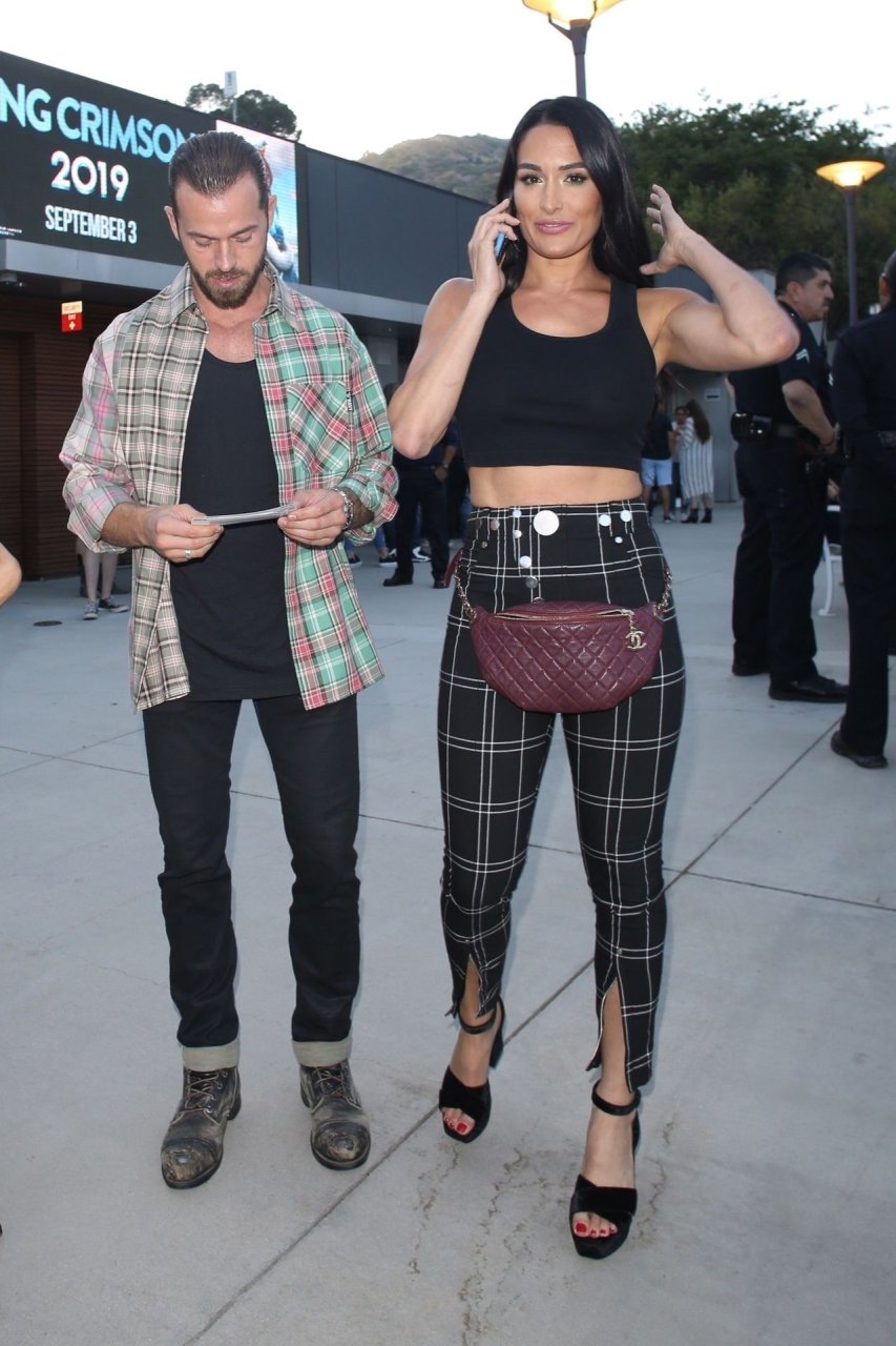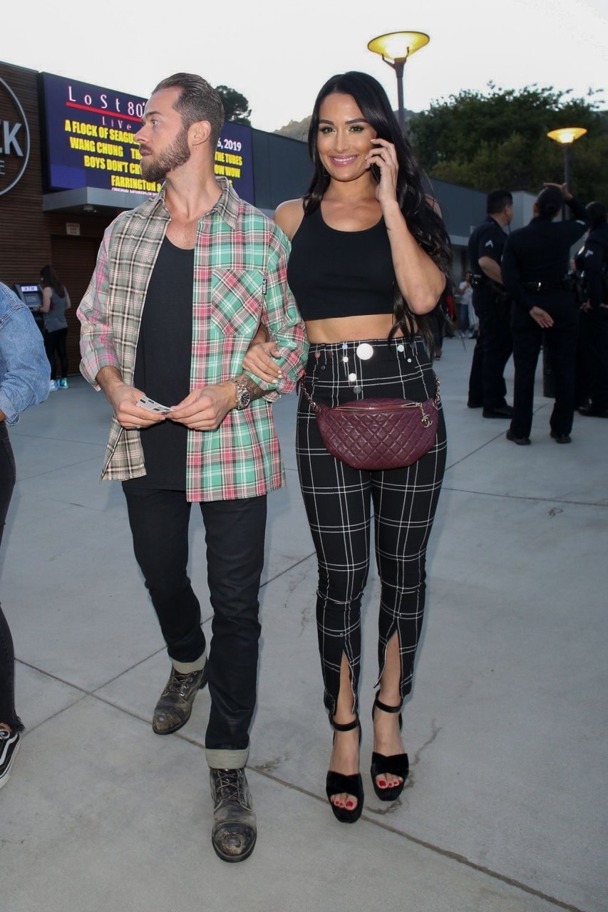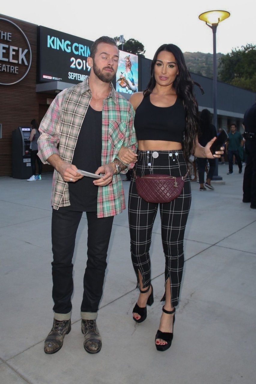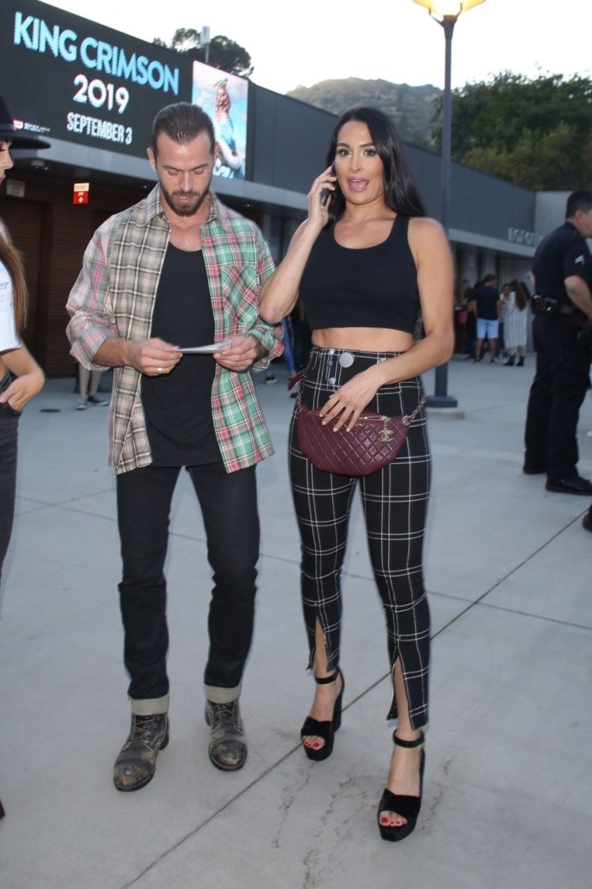 Nikki Bella et Artem Chigvintsev posent pour des photos alors qu’ils arrivent au Greek Theater pour le concert de Billie Eilish à Los Angeles, 11/07/2019.