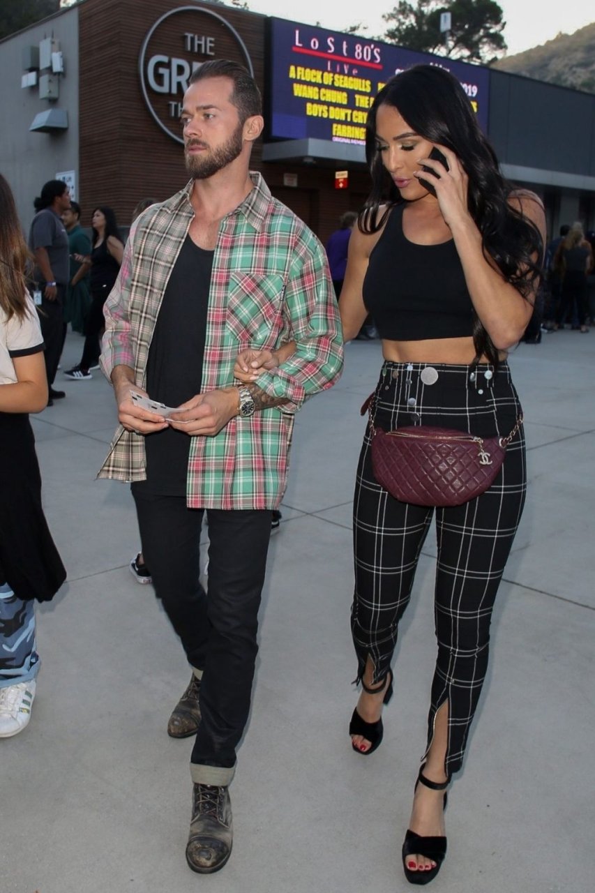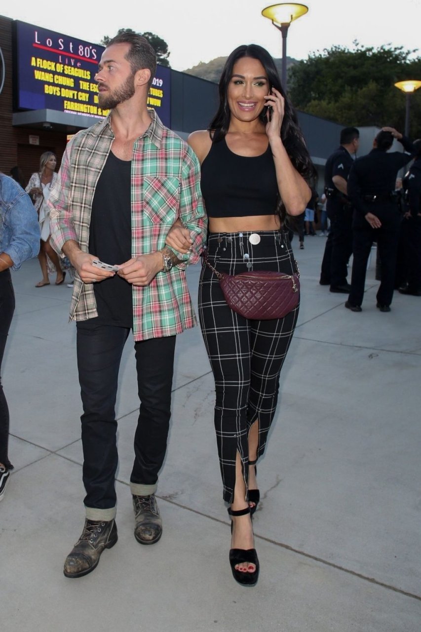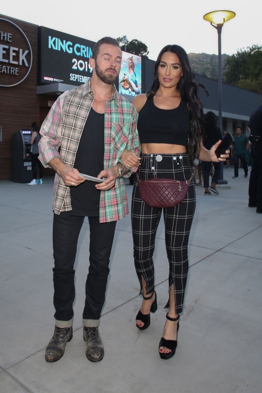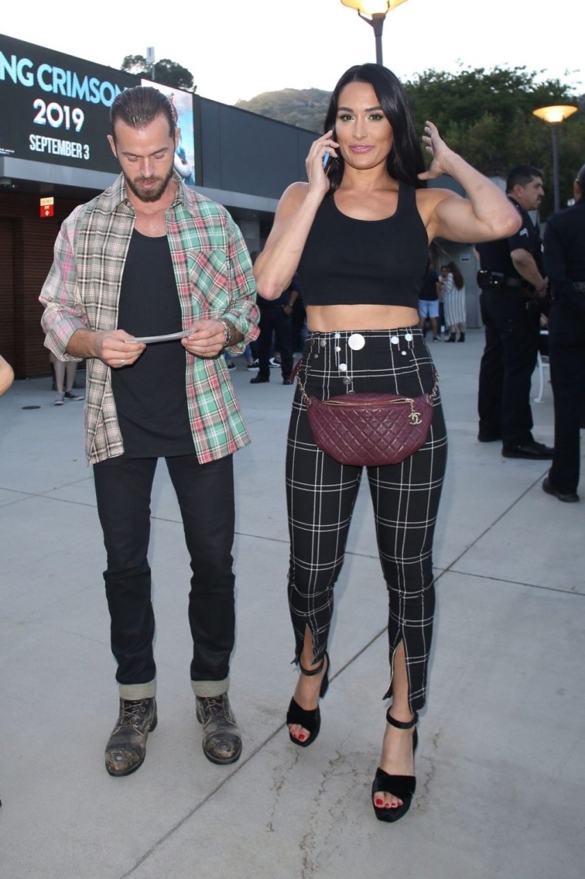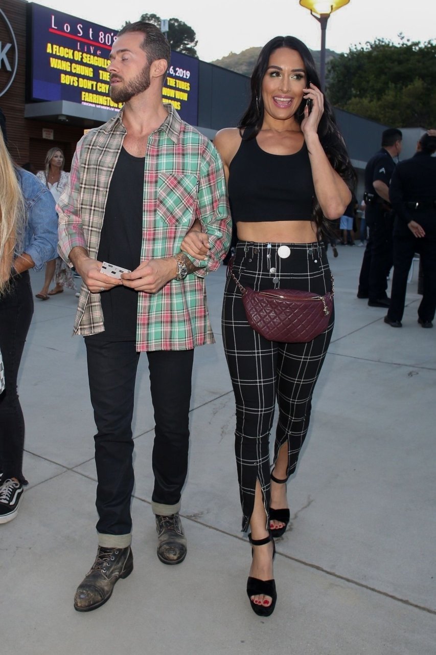 Nikki Bella et Artem Chigvintsev posent pour des photos alors qu’ils arrivent au Greek Theater pour le concert de Billie Eilish à Los Angeles, 11/07/2019.
