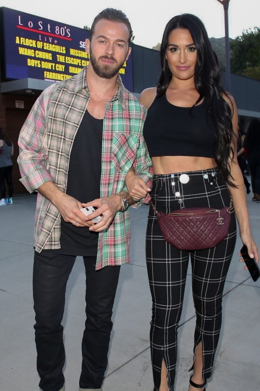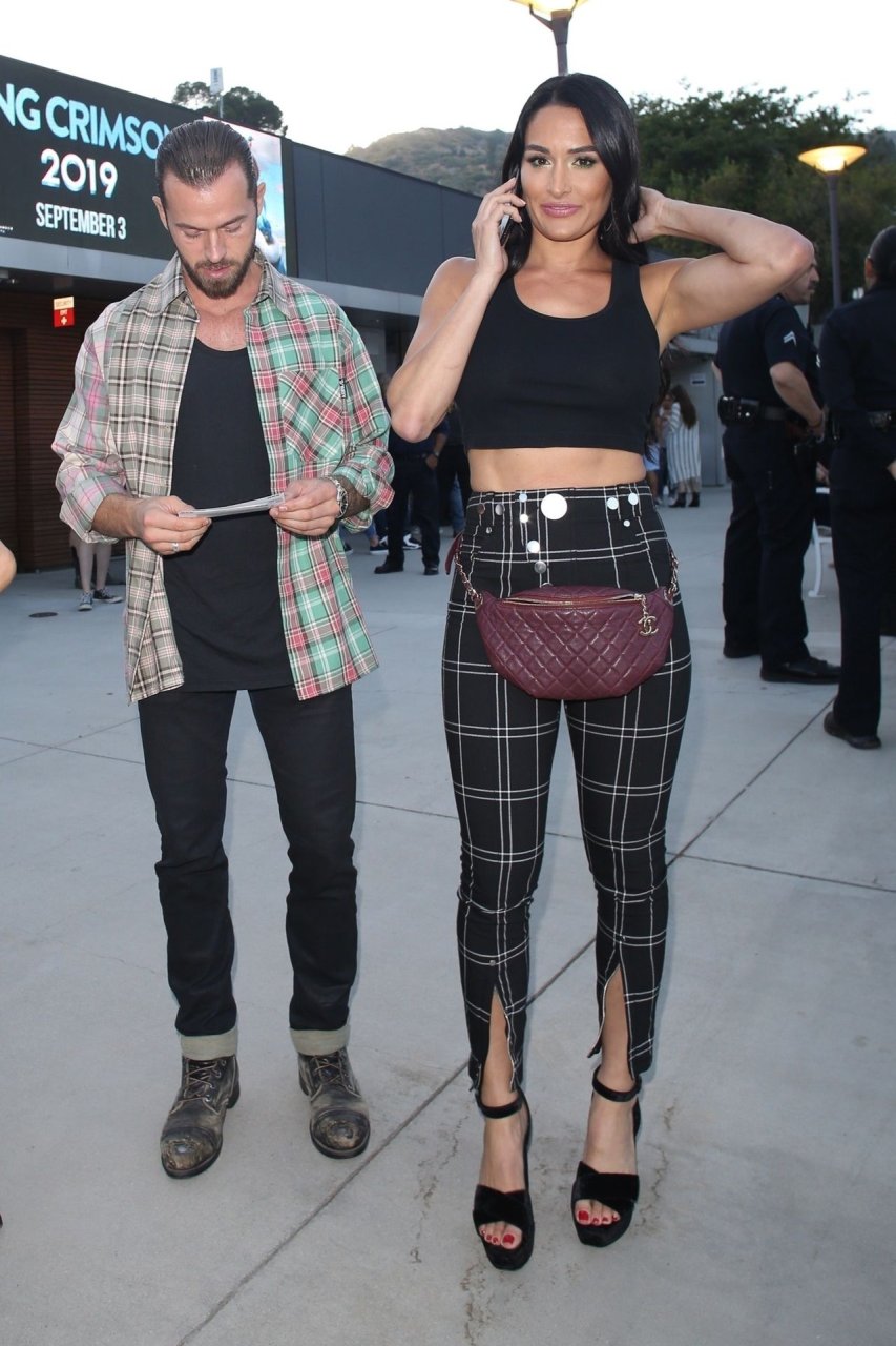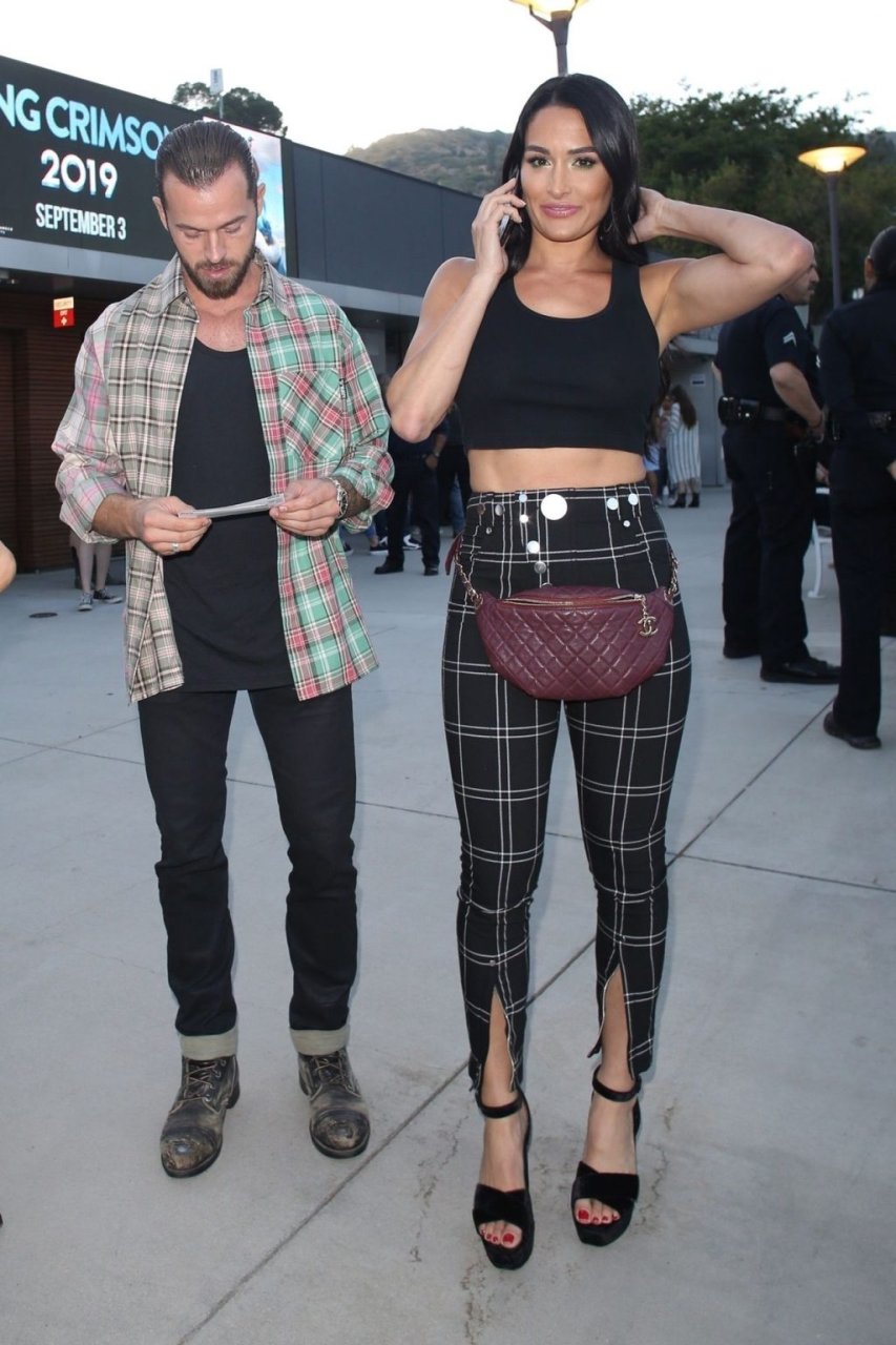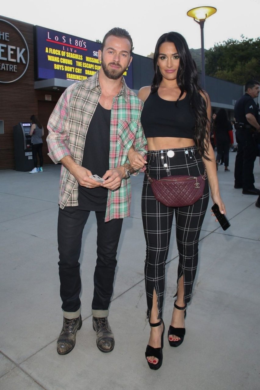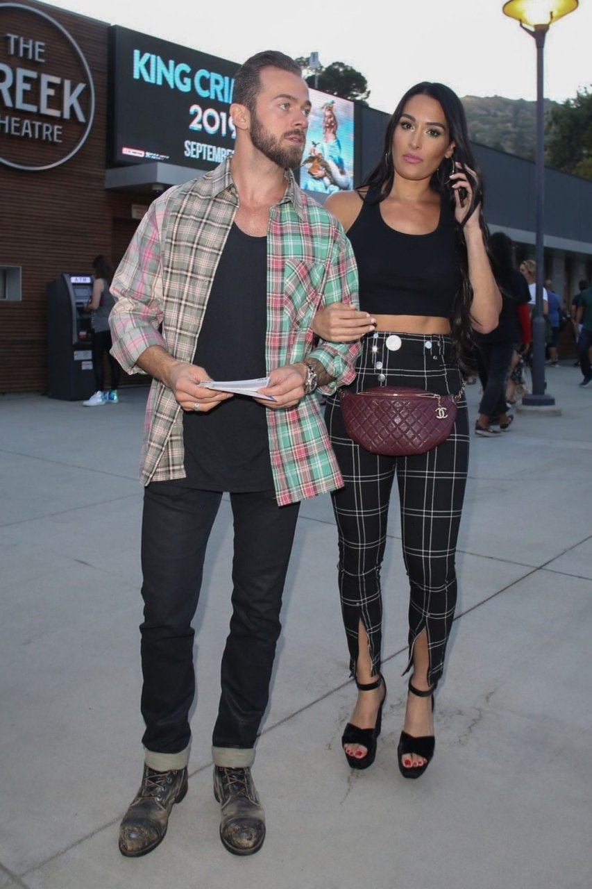 Nikki Bella et Artem Chigvintsev posent pour des photos alors qu’ils arrivent au Greek Theater pour le concert de Billie Eilish à Los Angeles, 11/07/2019.