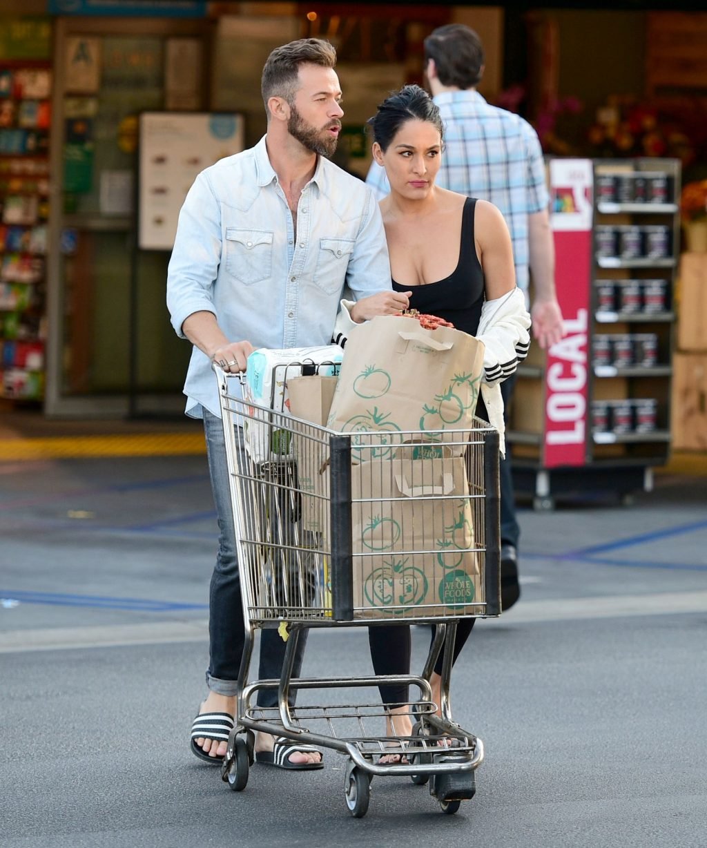 Nikki Bella et Artem Chigvintsev ont l’air d’un couple heureux en faisant leurs courses ensemble dans un Whole Foods à Los Angeles, le 07/10/2019. La lutteuse professionnelle américaine de 35 ans portait un débardeur noir court, un legging assorti, une veste Adidas et des sandales.