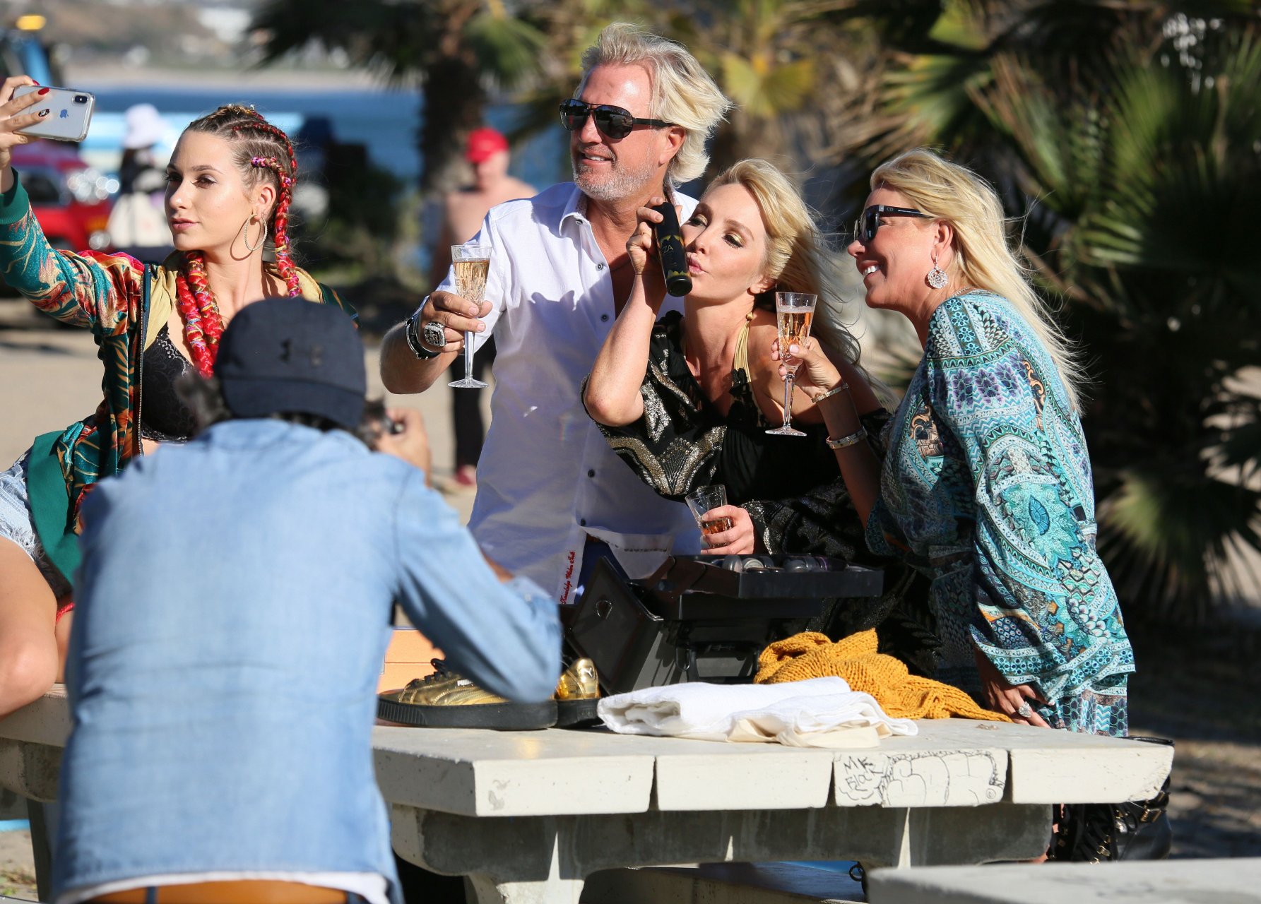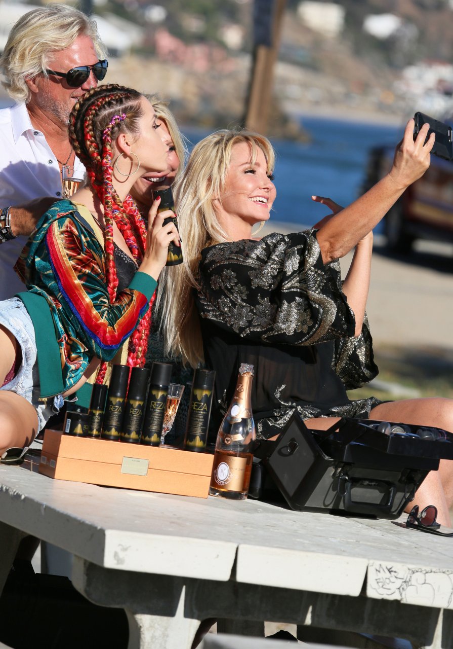 Chanteuse/créatrice de mode Nikki Lund (36 ans) passe du temps avec les magnats des cheveux et des parfums Sheree LaDove Funsch et Dan Funsch ainsi que leur fille Ashley Brighton sur le plateau d’une séance photo à la plage, où elle a exhibé son corps sexy en bikini lors du shooting pour la ligne de cheveux “Be Obsessed” de Reza Farahan de “Shahs of Sunset” – Malibu, 16/10/2018.