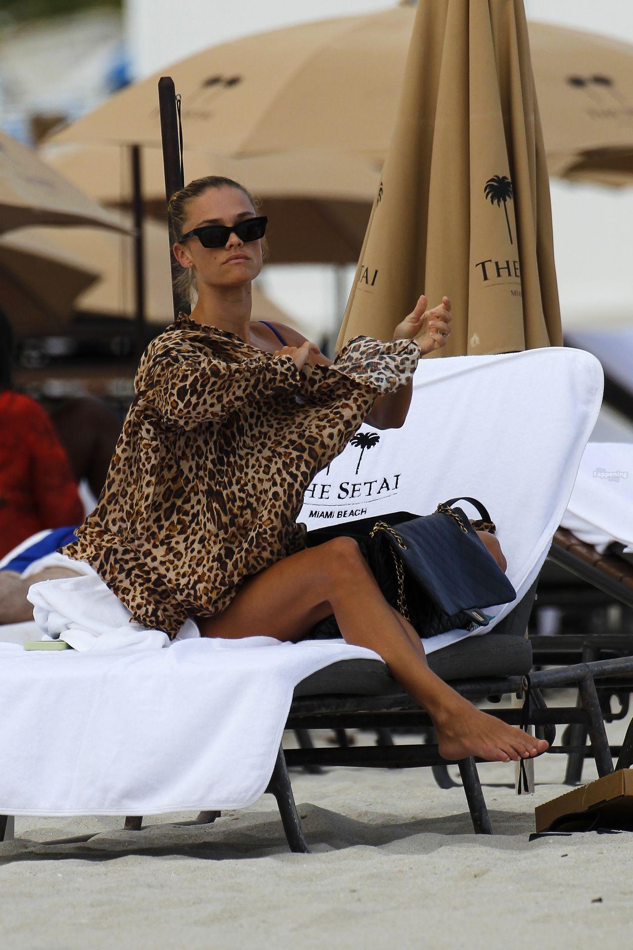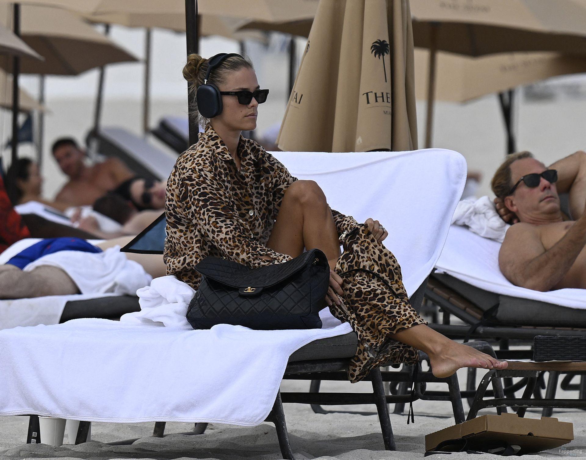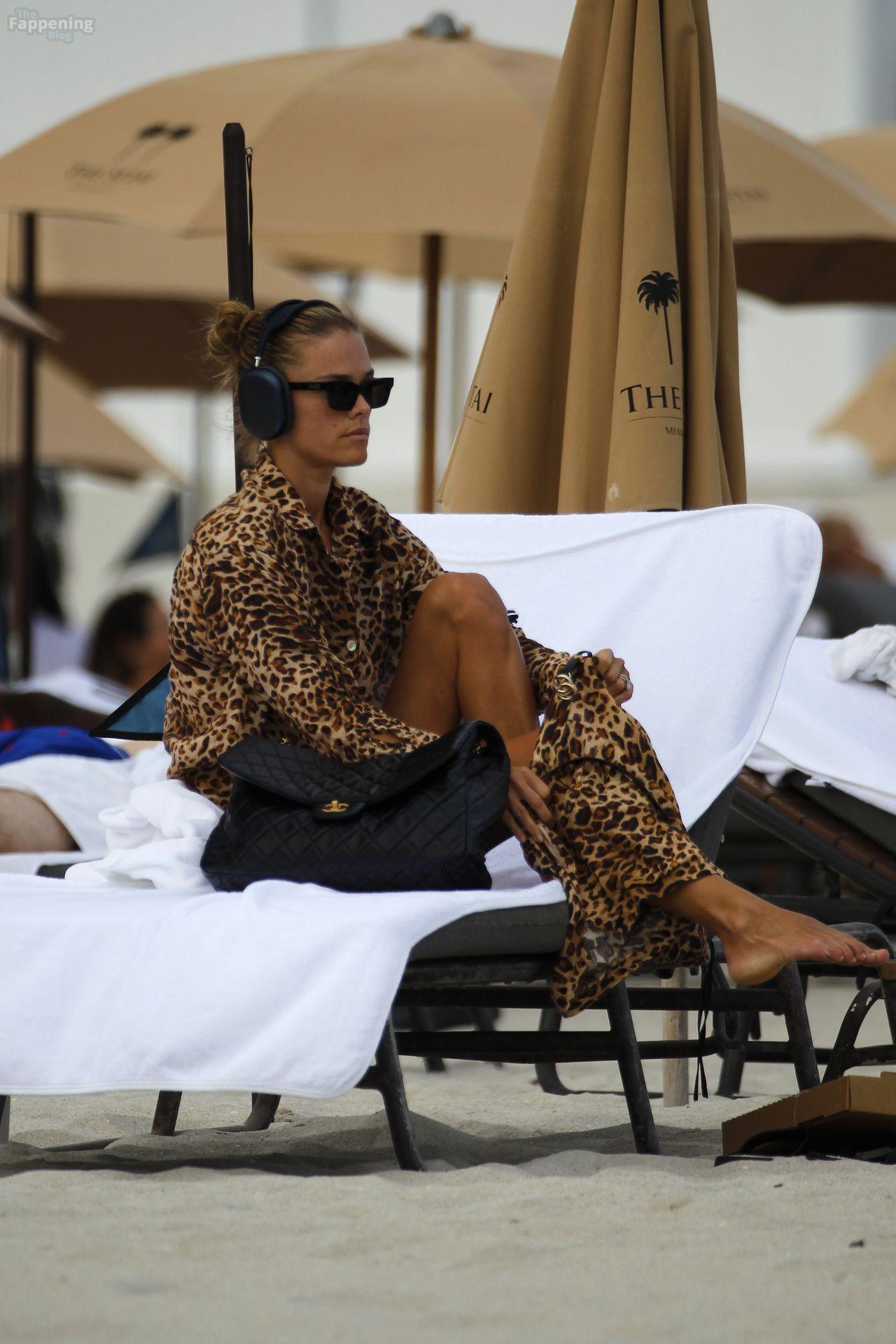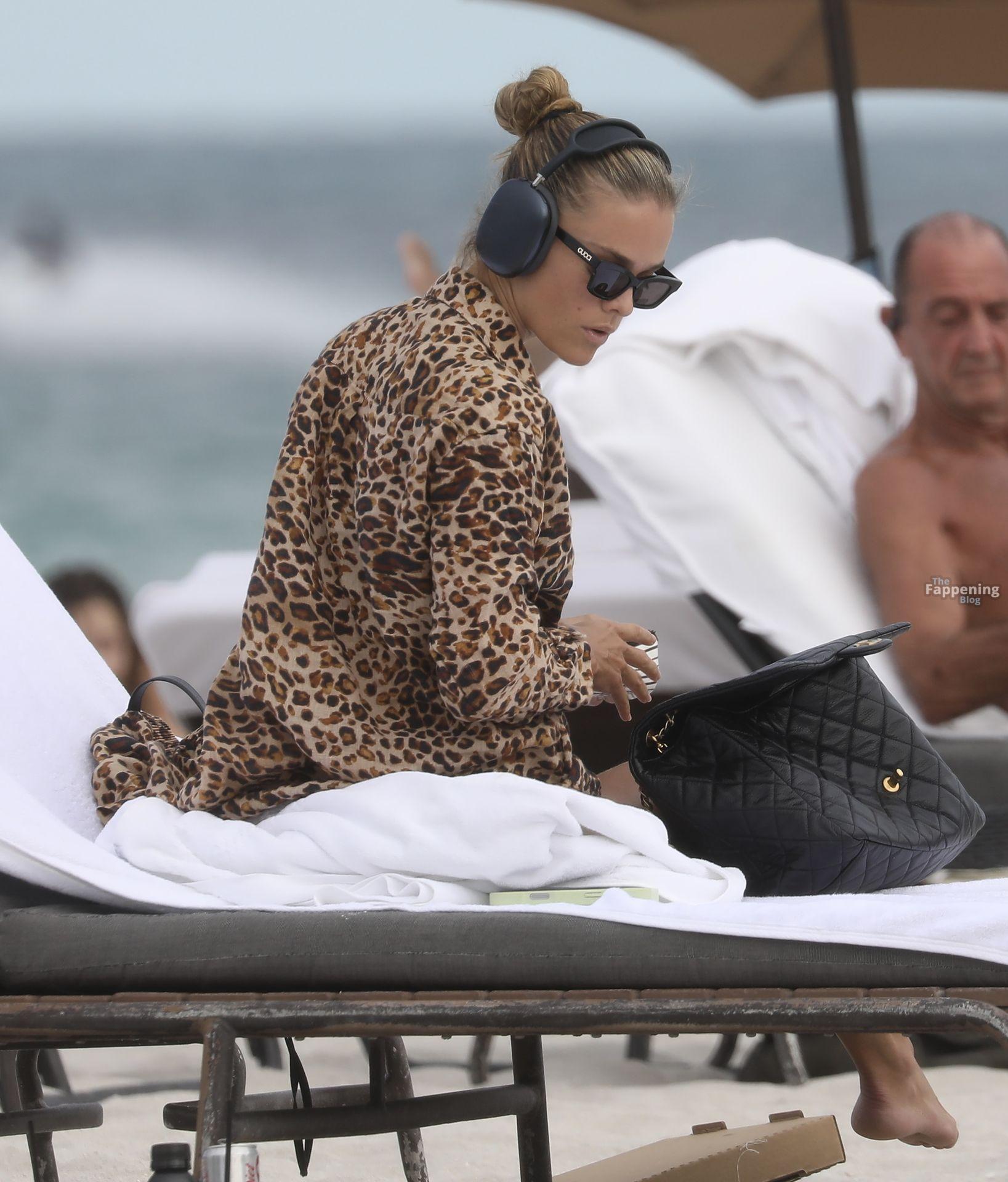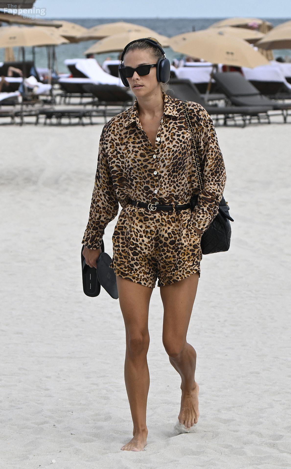 Le mannequin danois Nina Agdal a été aperçue en train de profiter du soleil sur Miami Beach, portant un bikini bleu avant de changer pour une tenue chic à imprimé léopard.