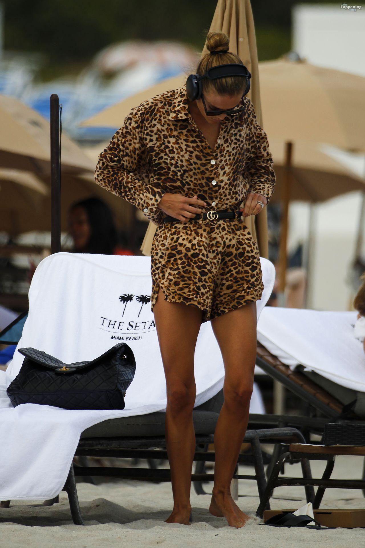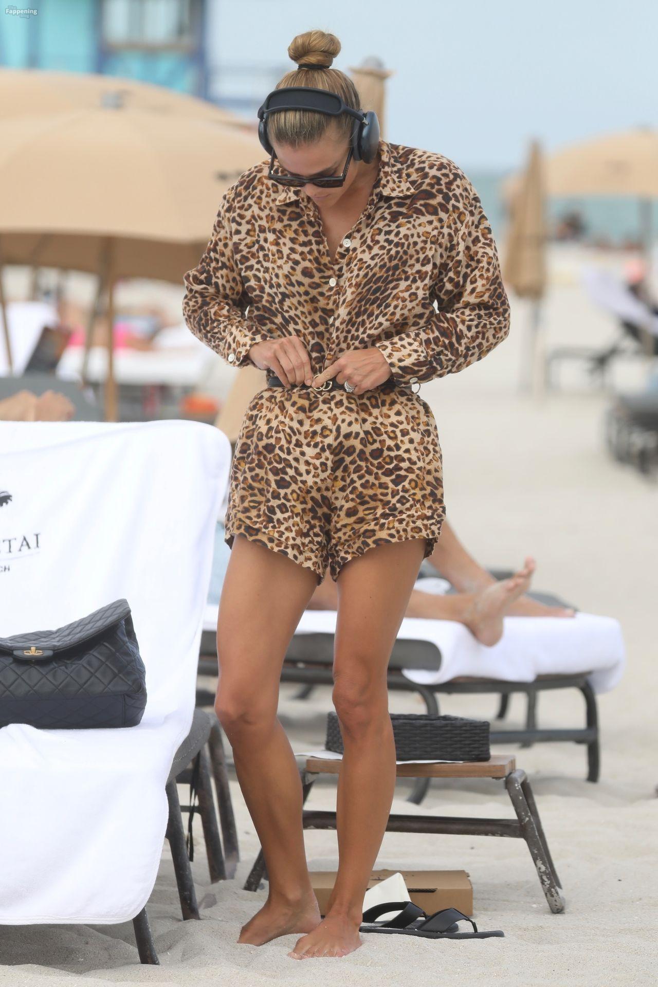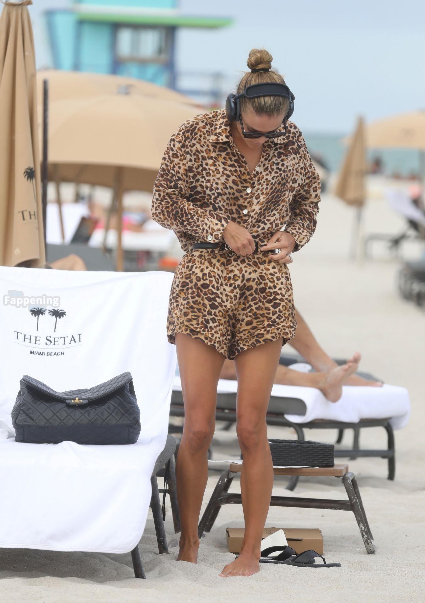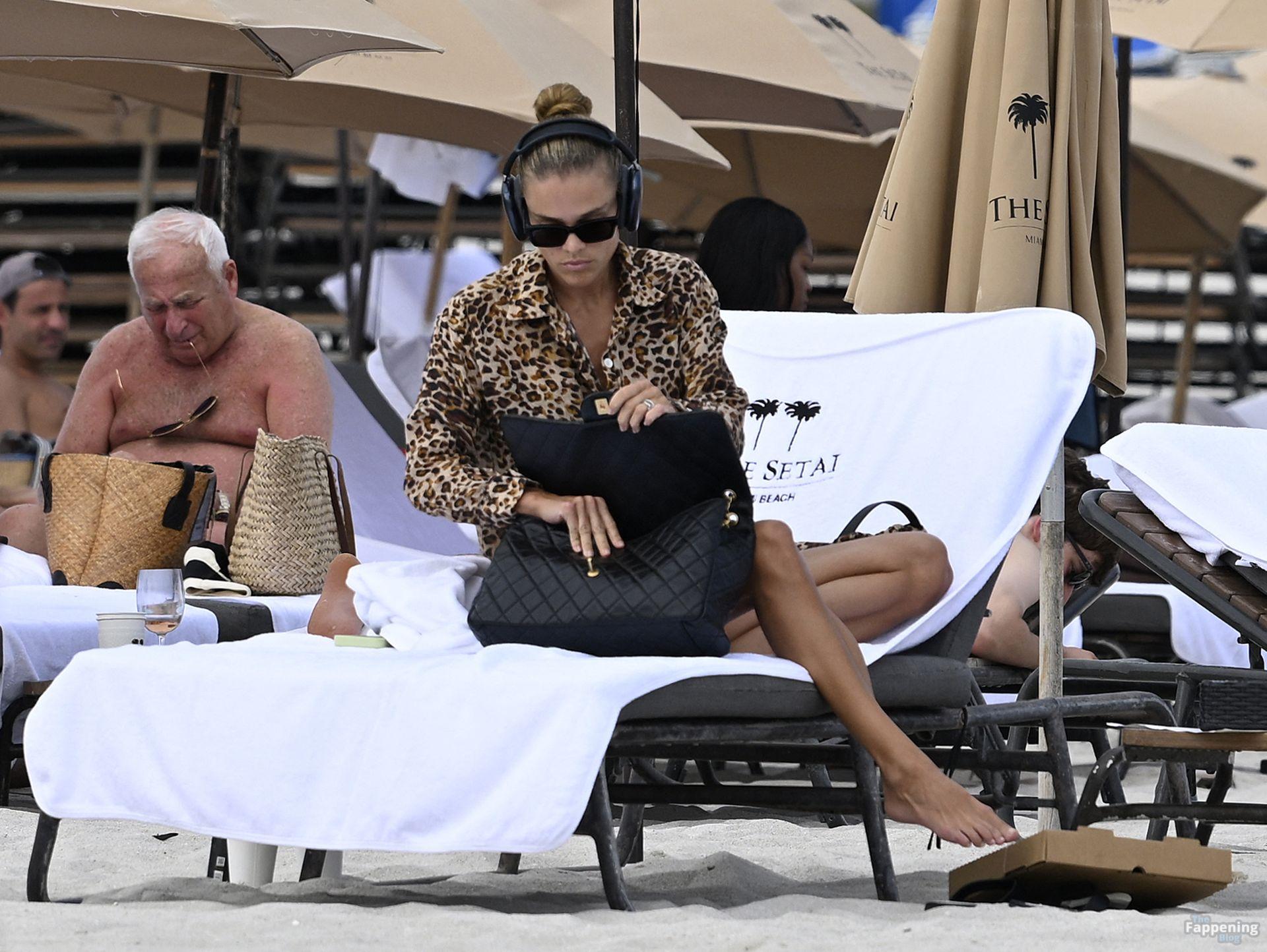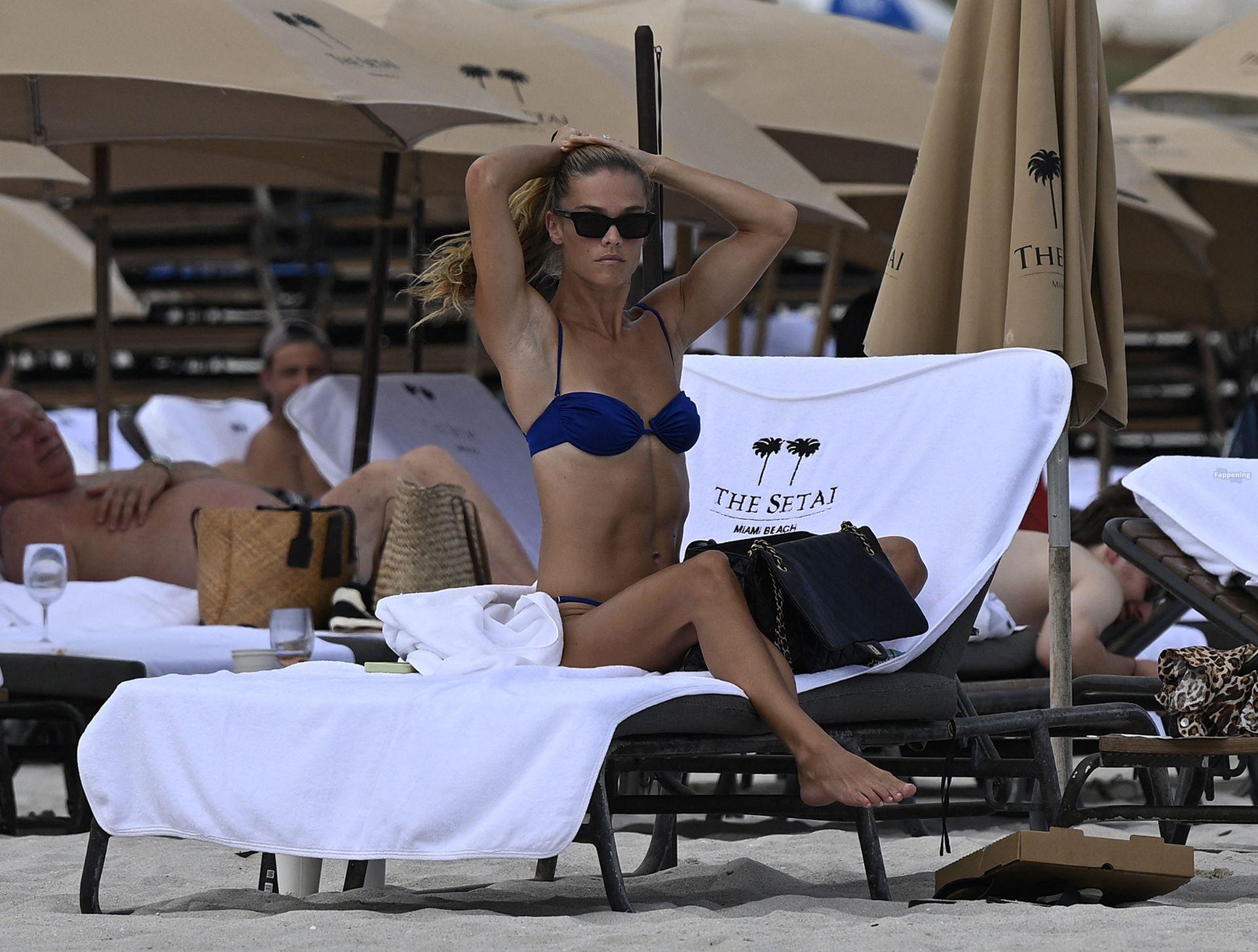 Le mannequin danois Nina Agdal a été aperçue en train de profiter du soleil sur Miami Beach, portant un bikini bleu avant de changer pour une tenue chic à imprimé léopard.