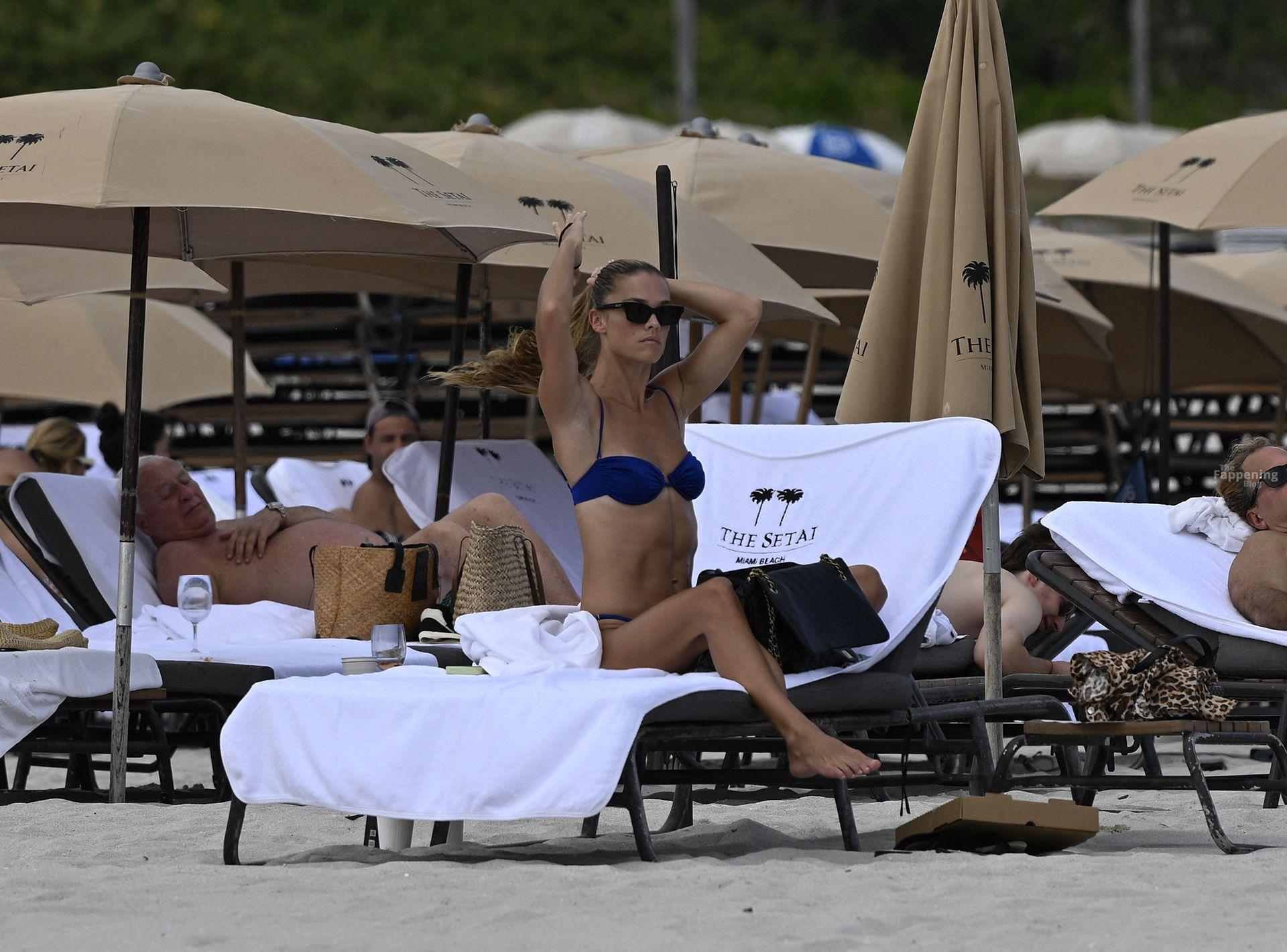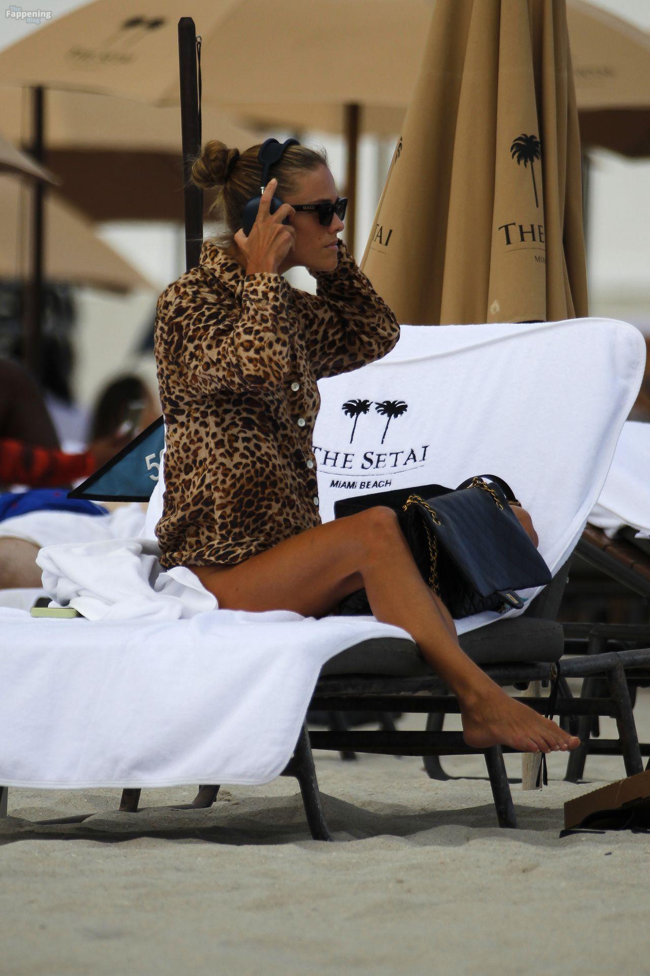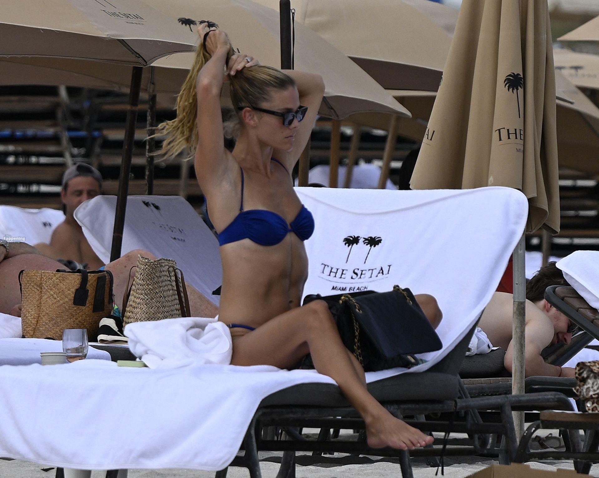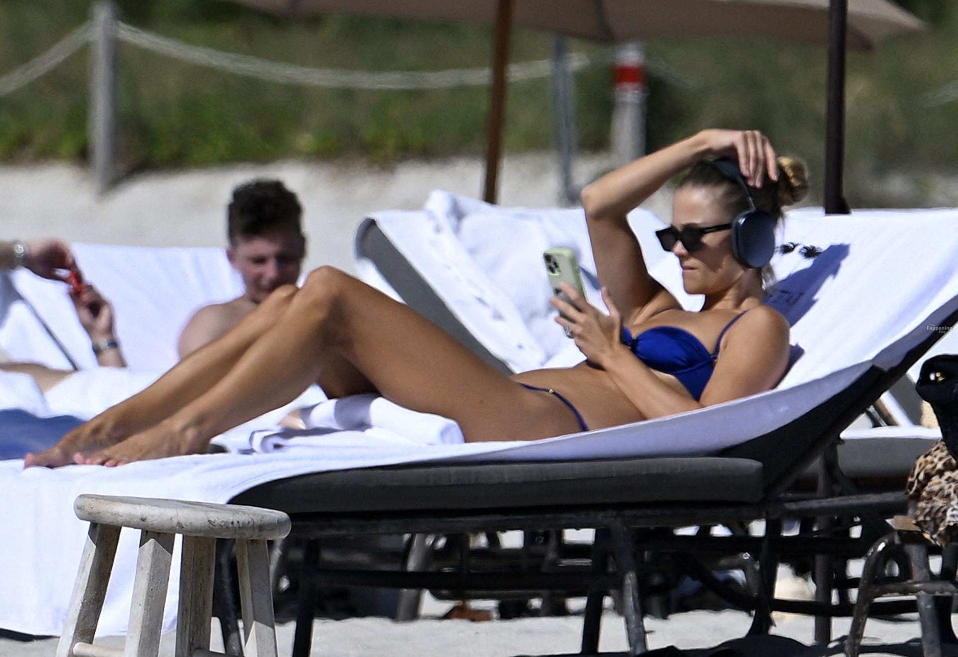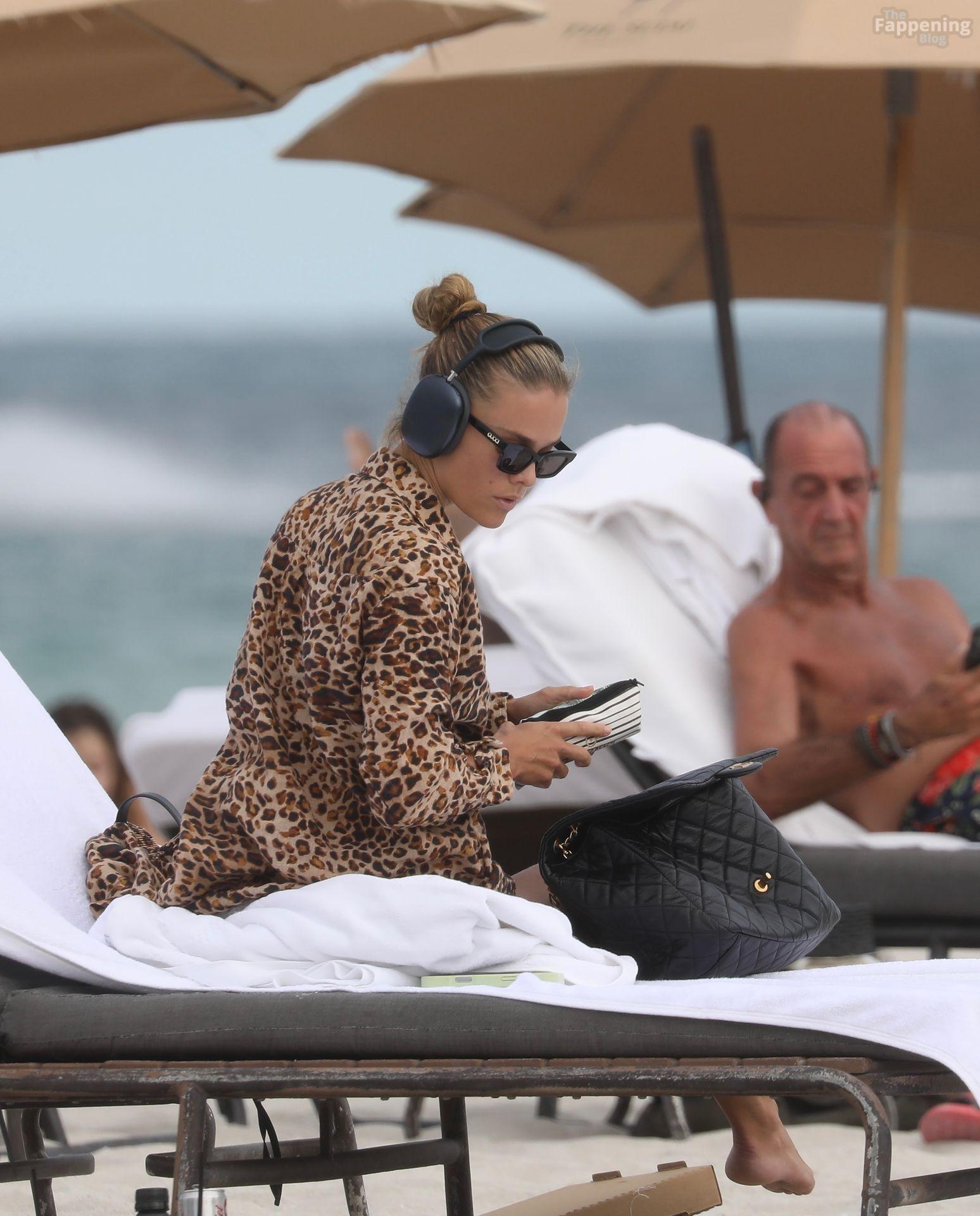 Le mannequin danois Nina Agdal a été aperçue en train de profiter du soleil sur Miami Beach, portant un bikini bleu avant de changer pour une tenue chic à imprimé léopard.