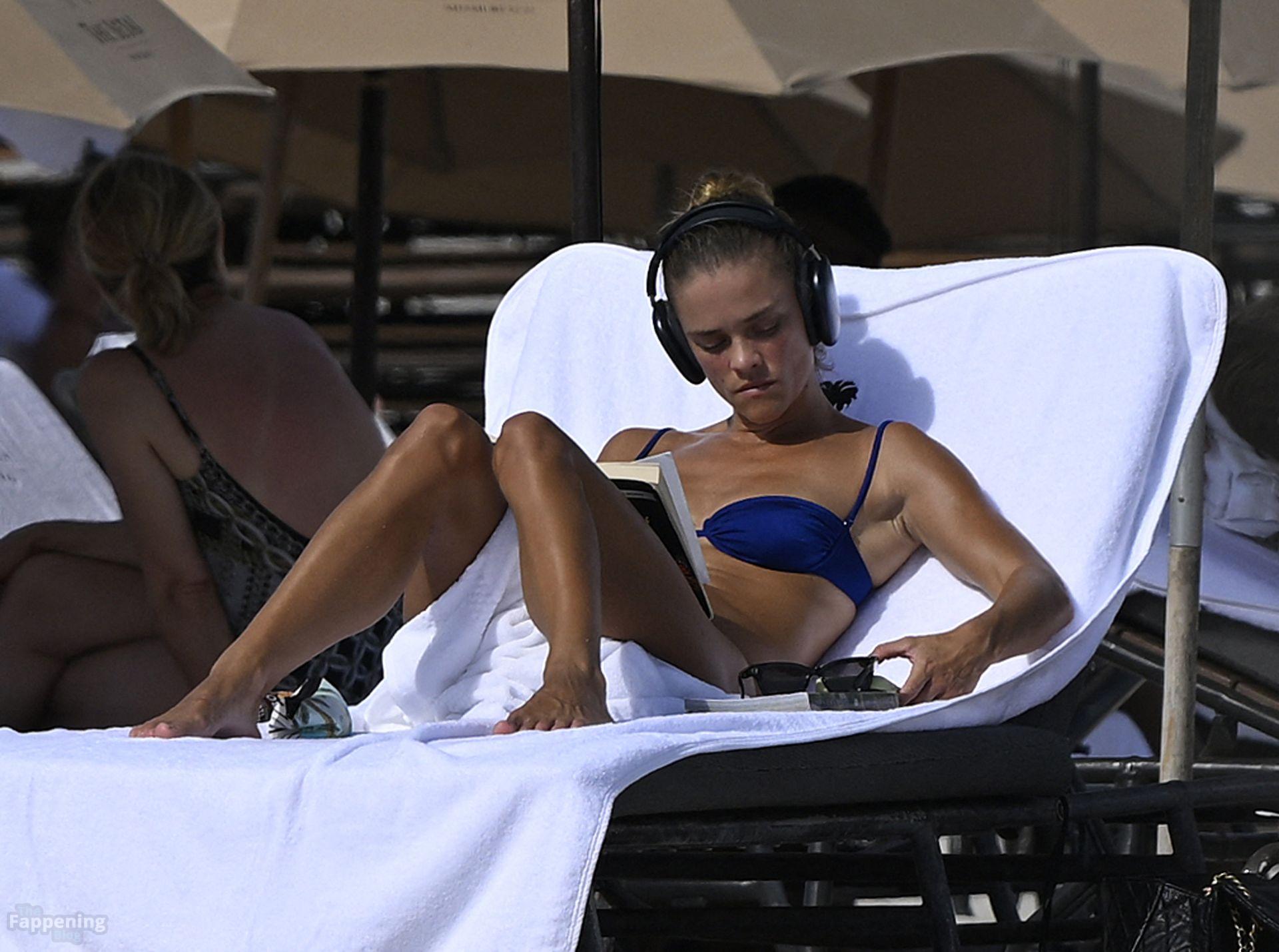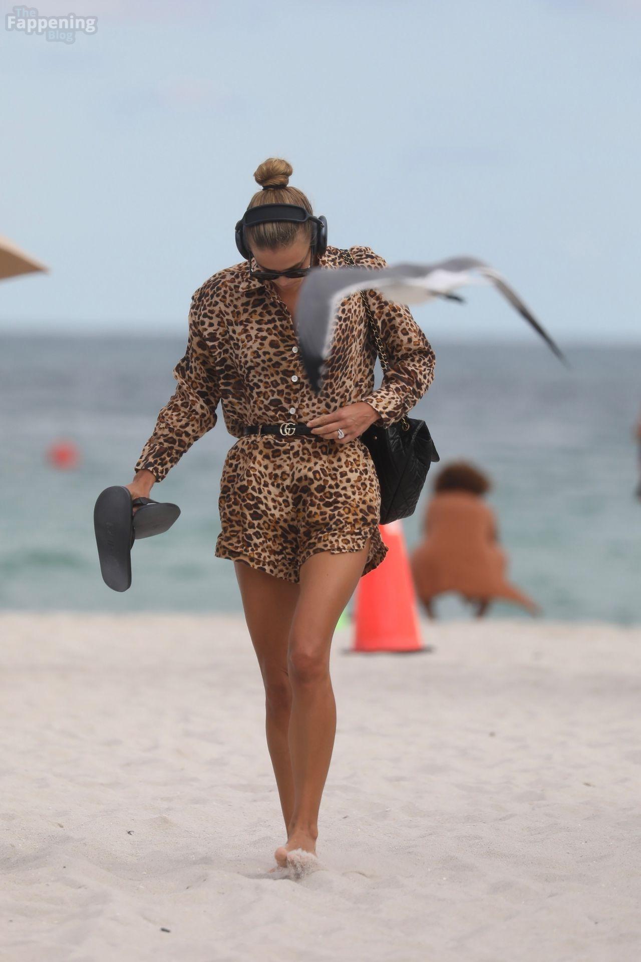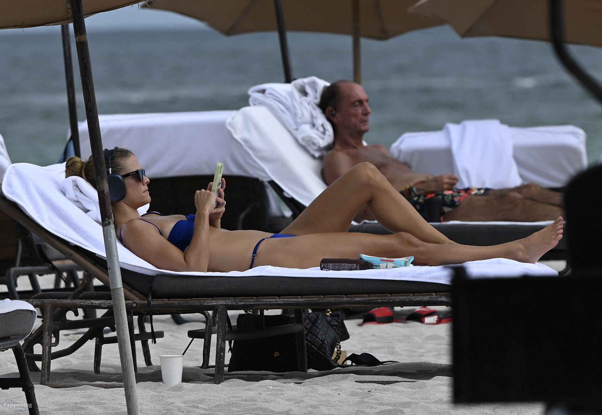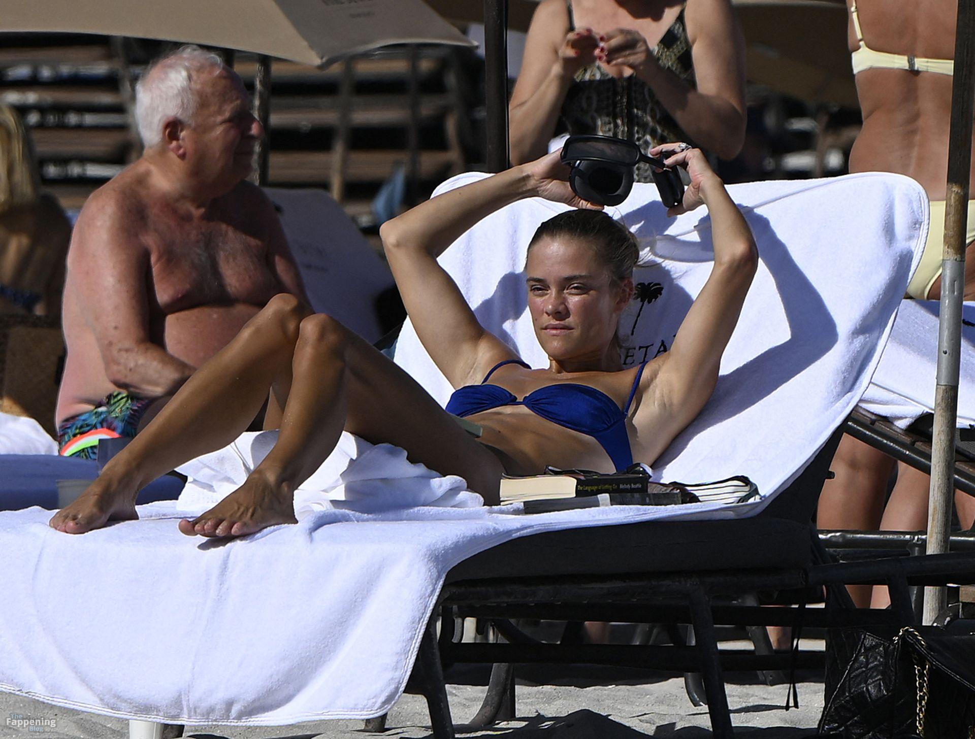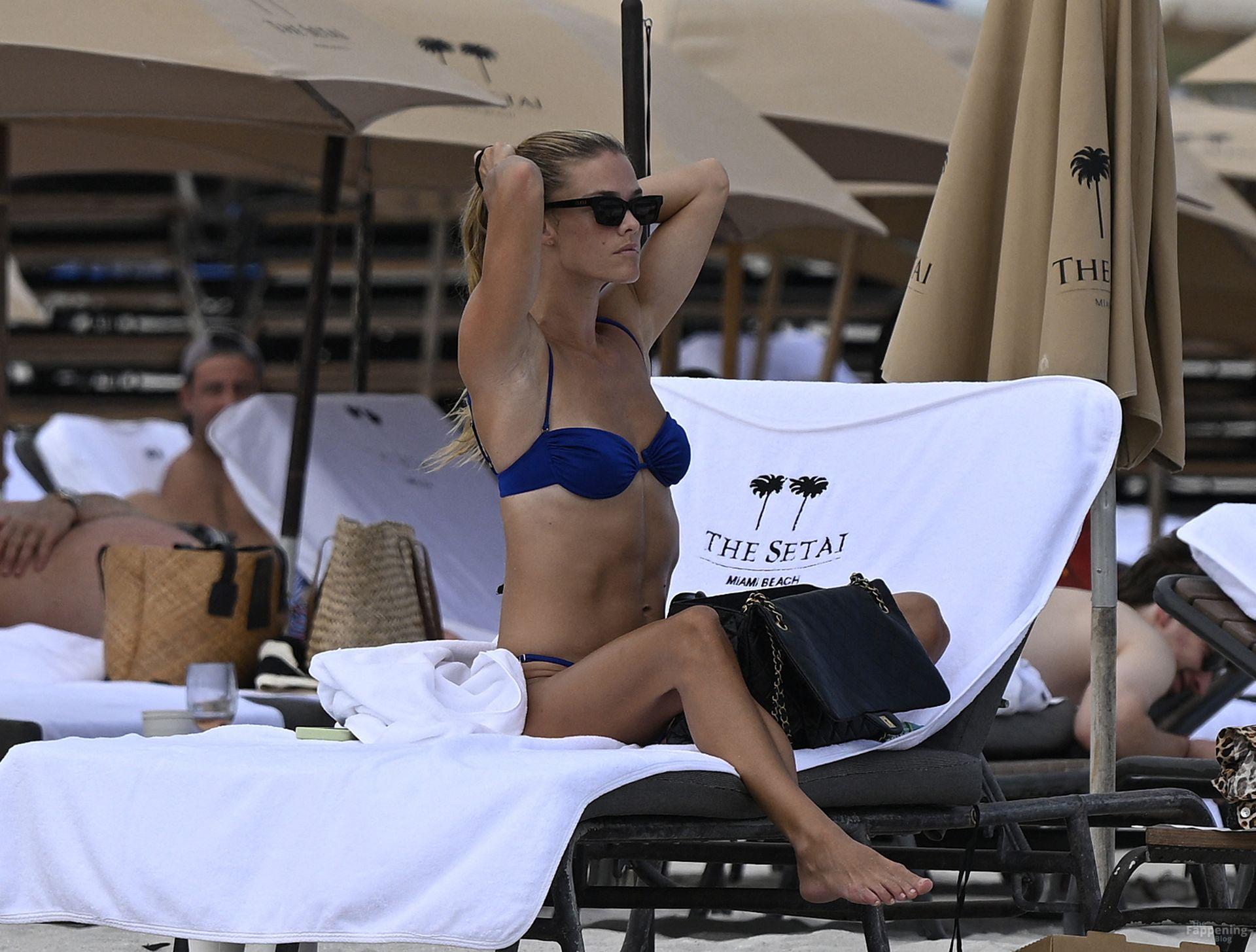 Le mannequin danois Nina Agdal a été aperçue en train de profiter du soleil sur Miami Beach, portant un bikini bleu avant de changer pour une tenue chic à imprimé léopard.