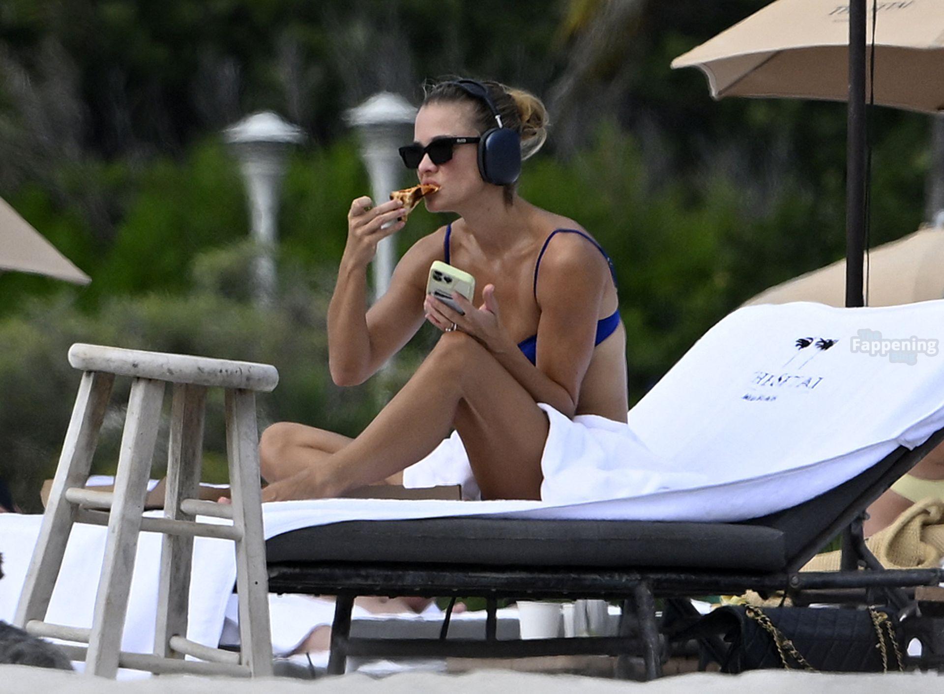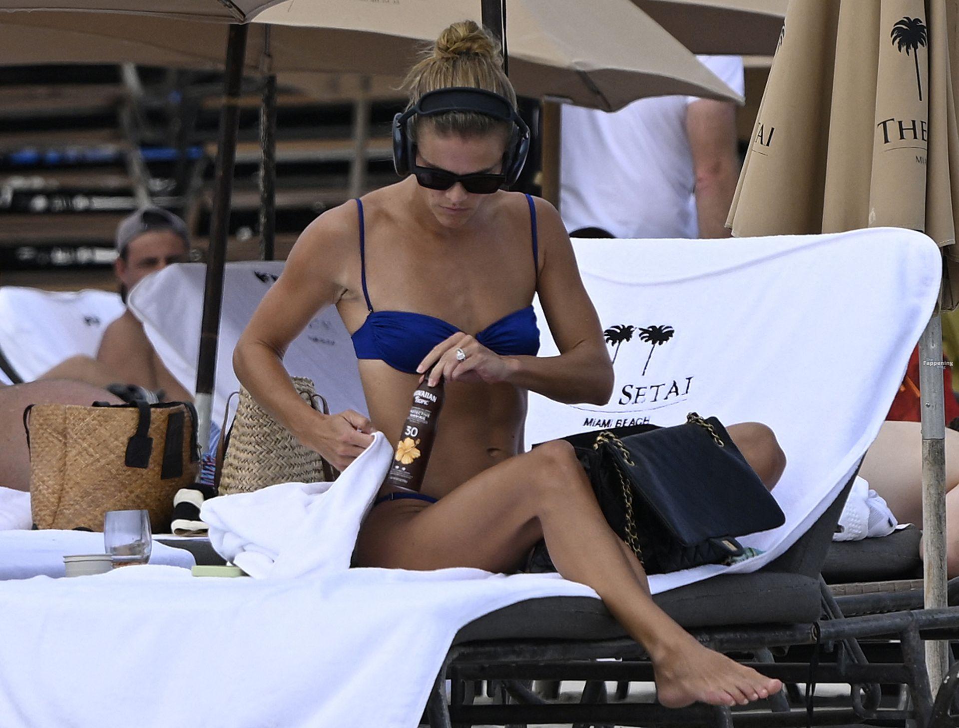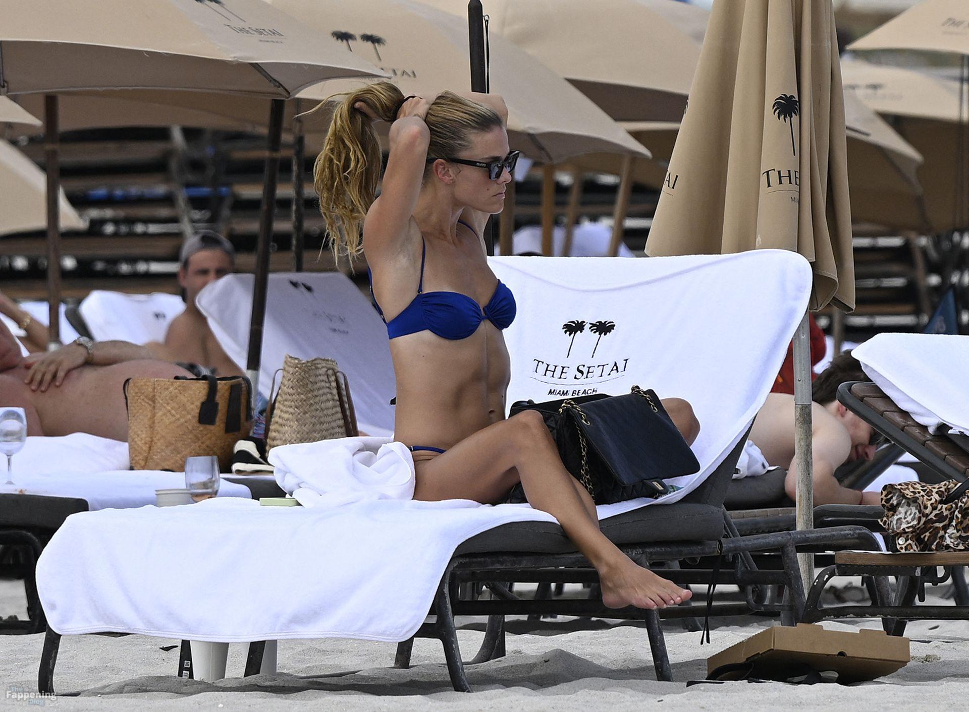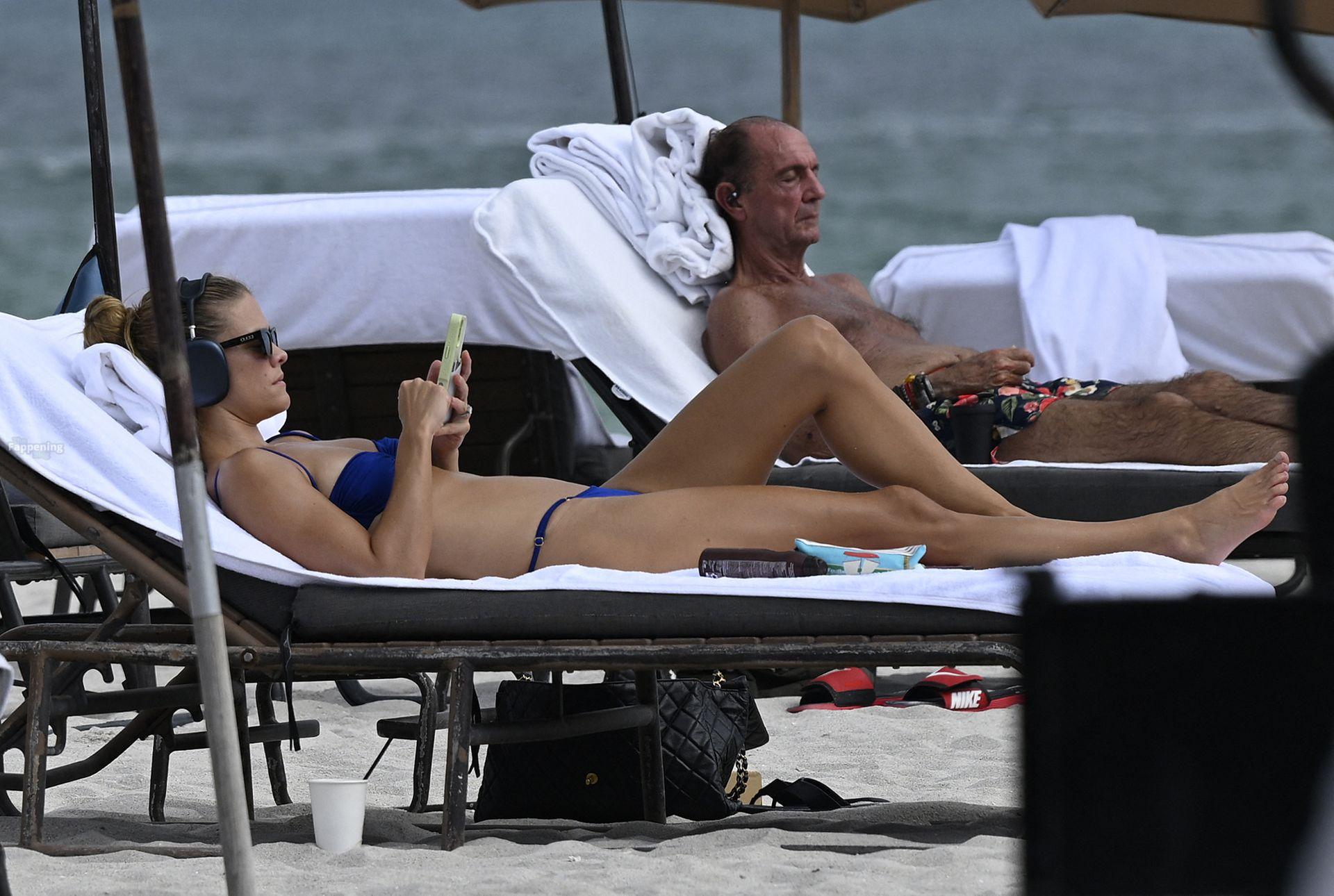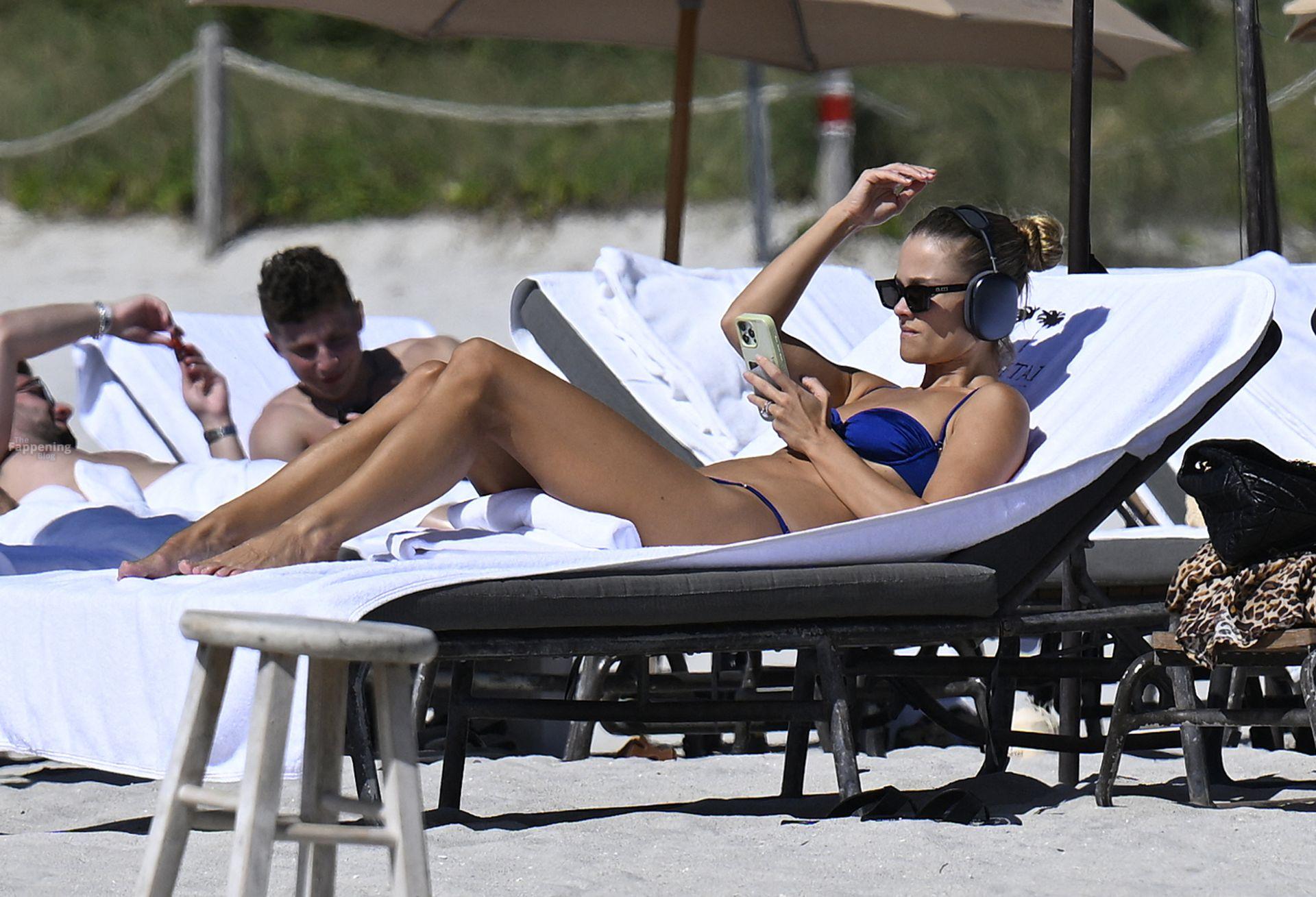 Le mannequin danois Nina Agdal a été aperçue en train de profiter du soleil sur Miami Beach, portant un bikini bleu avant de changer pour une tenue chic à imprimé léopard.