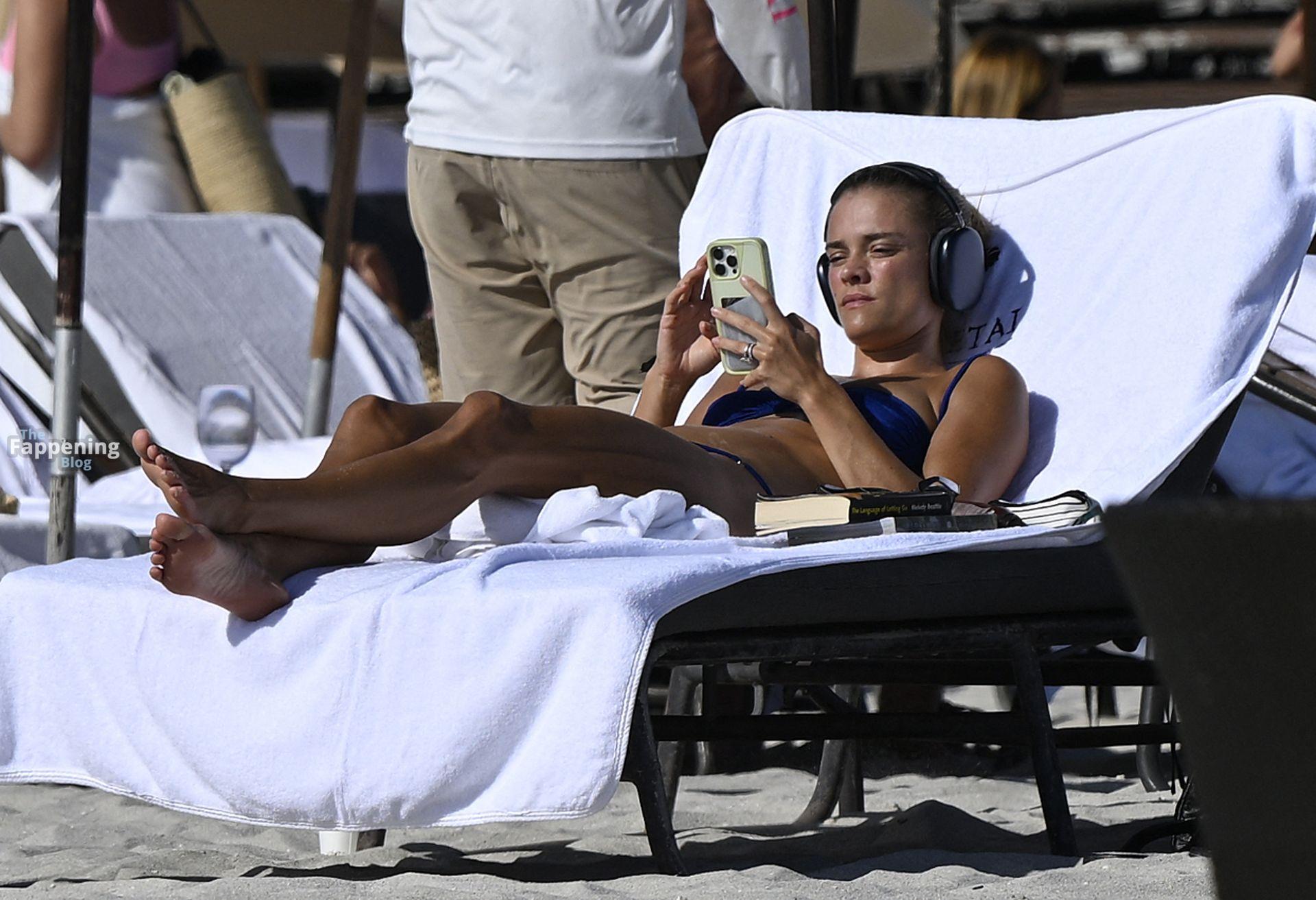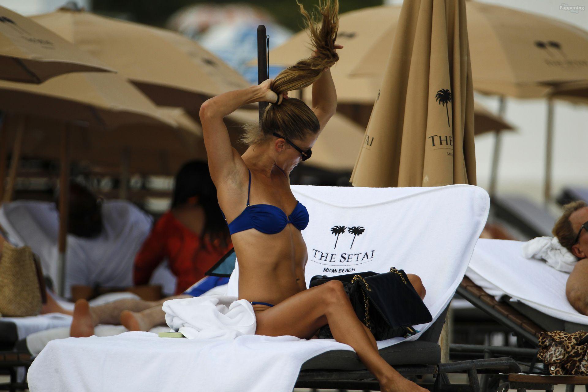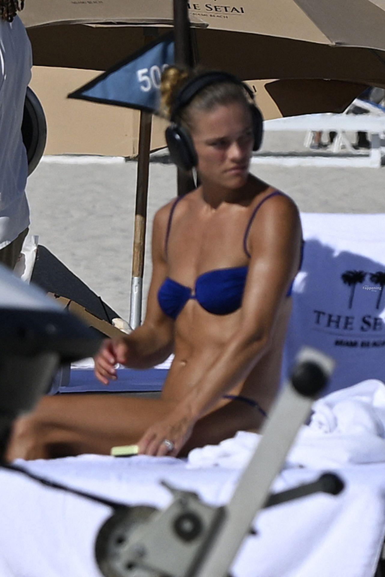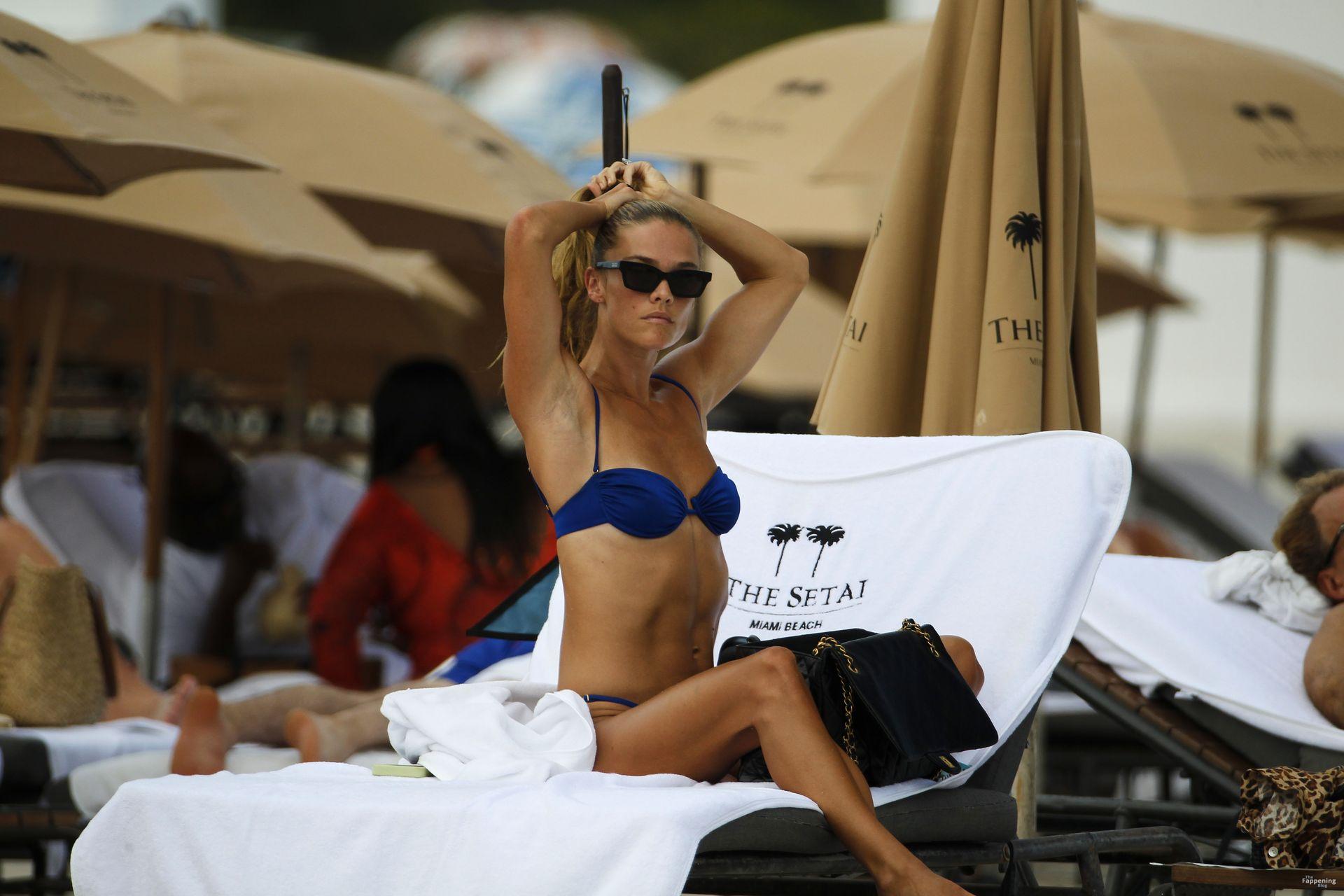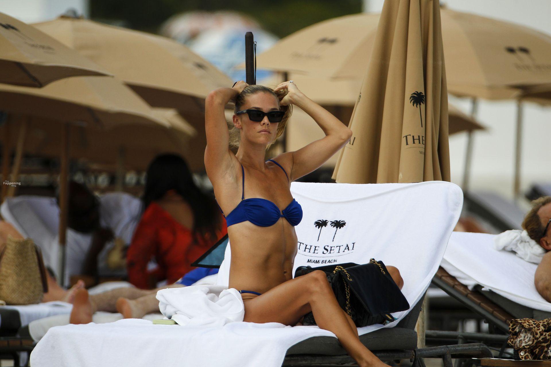 Le mannequin danois Nina Agdal a été aperçue en train de profiter du soleil sur Miami Beach, portant un bikini bleu avant de changer pour une tenue chic à imprimé léopard.