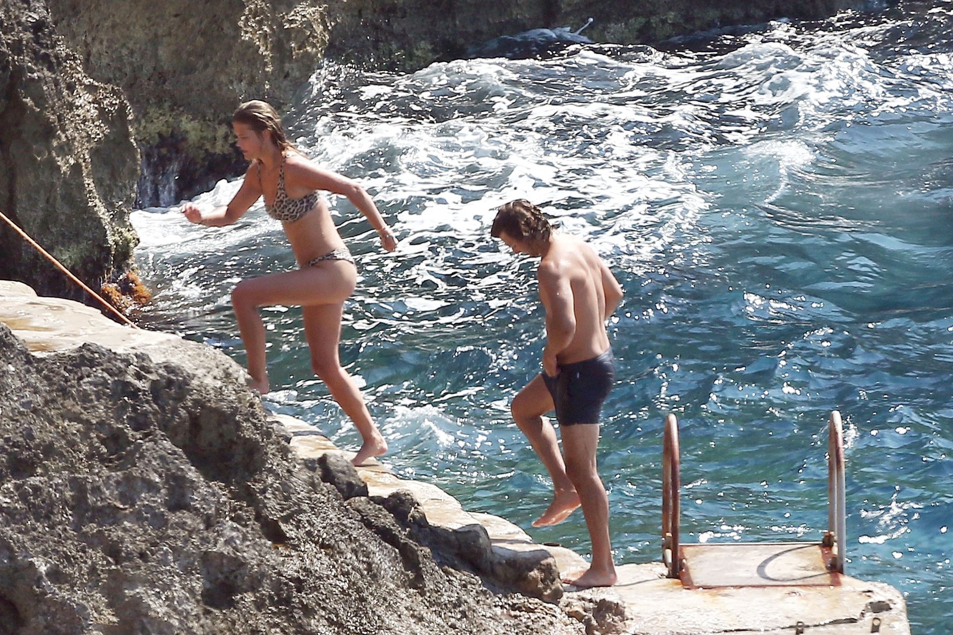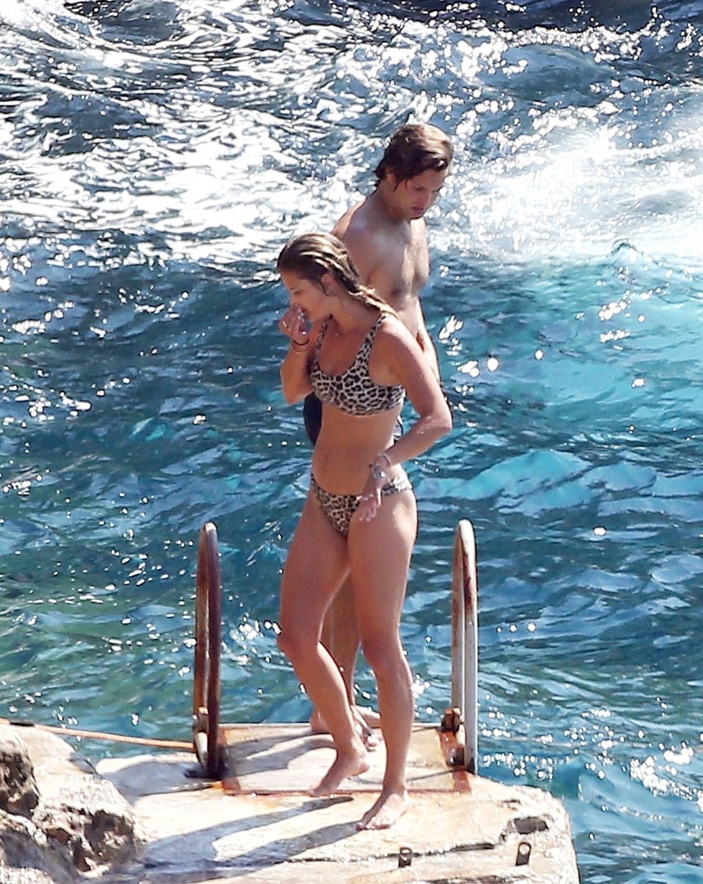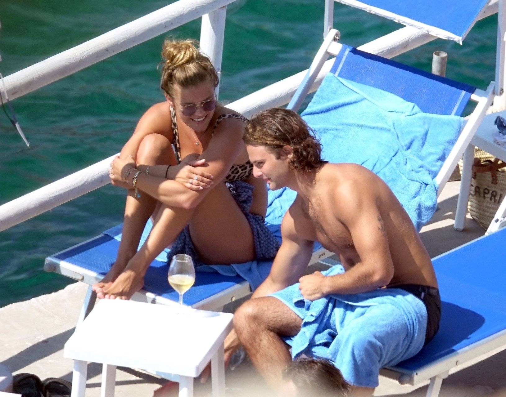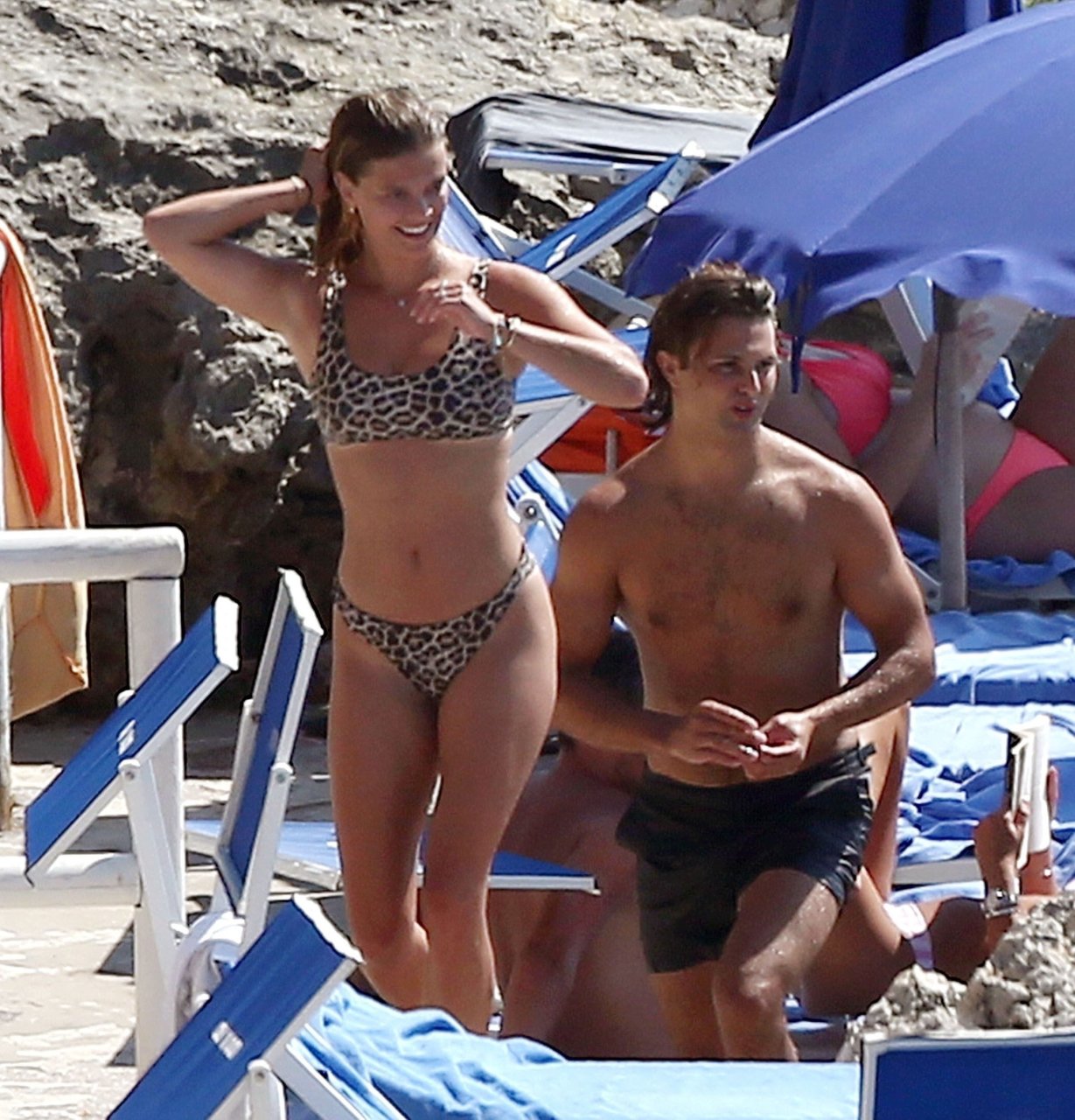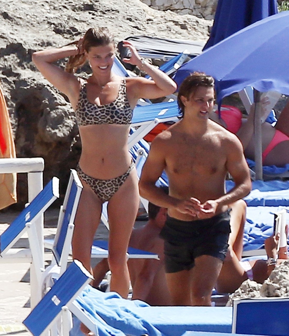 Le mannequin danois Nina Agdal (26 ans) et son petit ami Jack Brinkley-Cook (23 ans) profitent de leurs vacances à Capri, en Italie, le 31/07/2018. Nina portait un bikini imprimé léopard en prenant le soleil et a été photographiée en train d’avoir une séance de démonstration d’affection publique avec Jack. Nina et Jack ont été vus sur les rochers avant de sauter dans la mer pour nager.