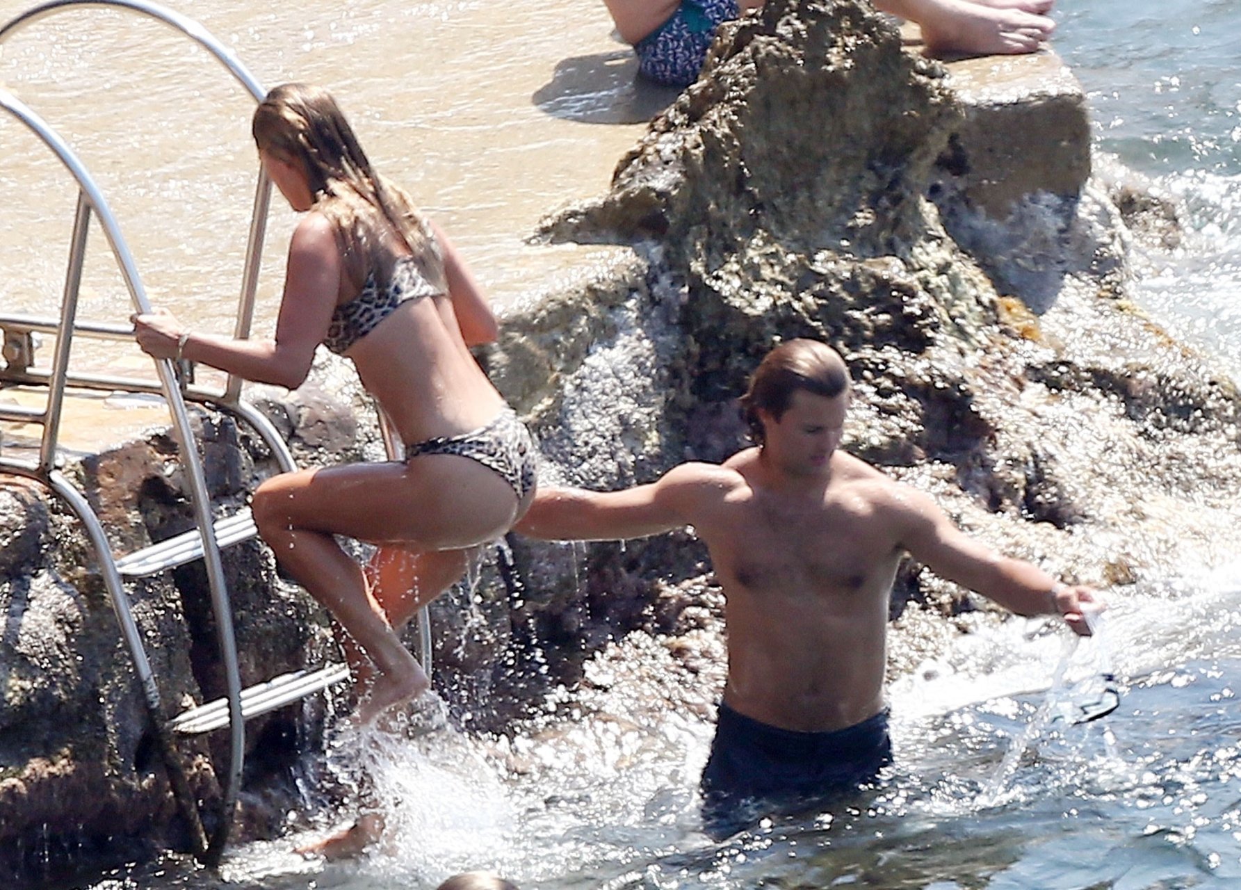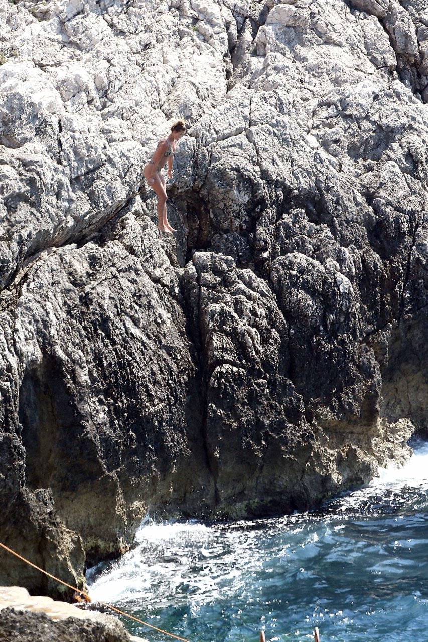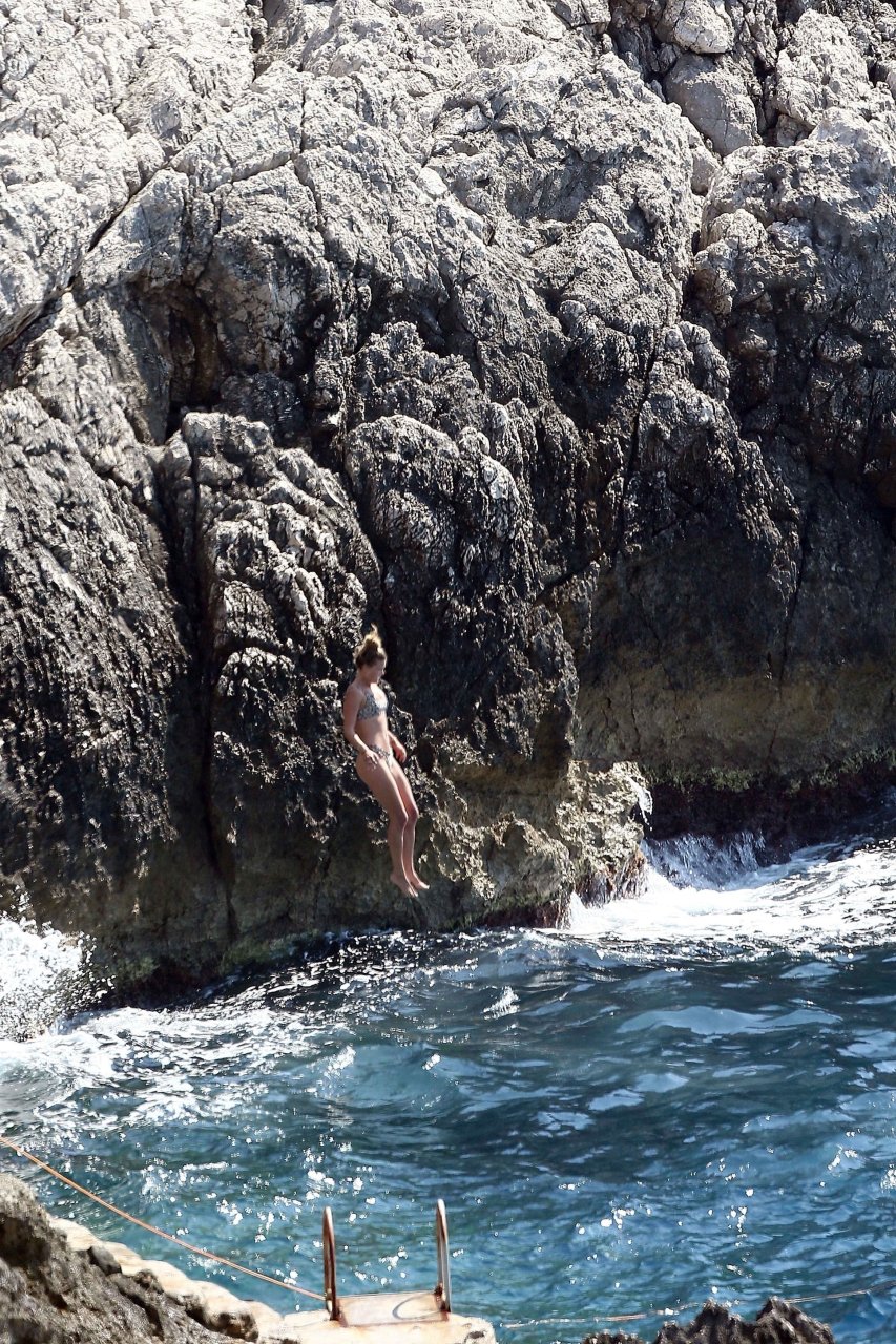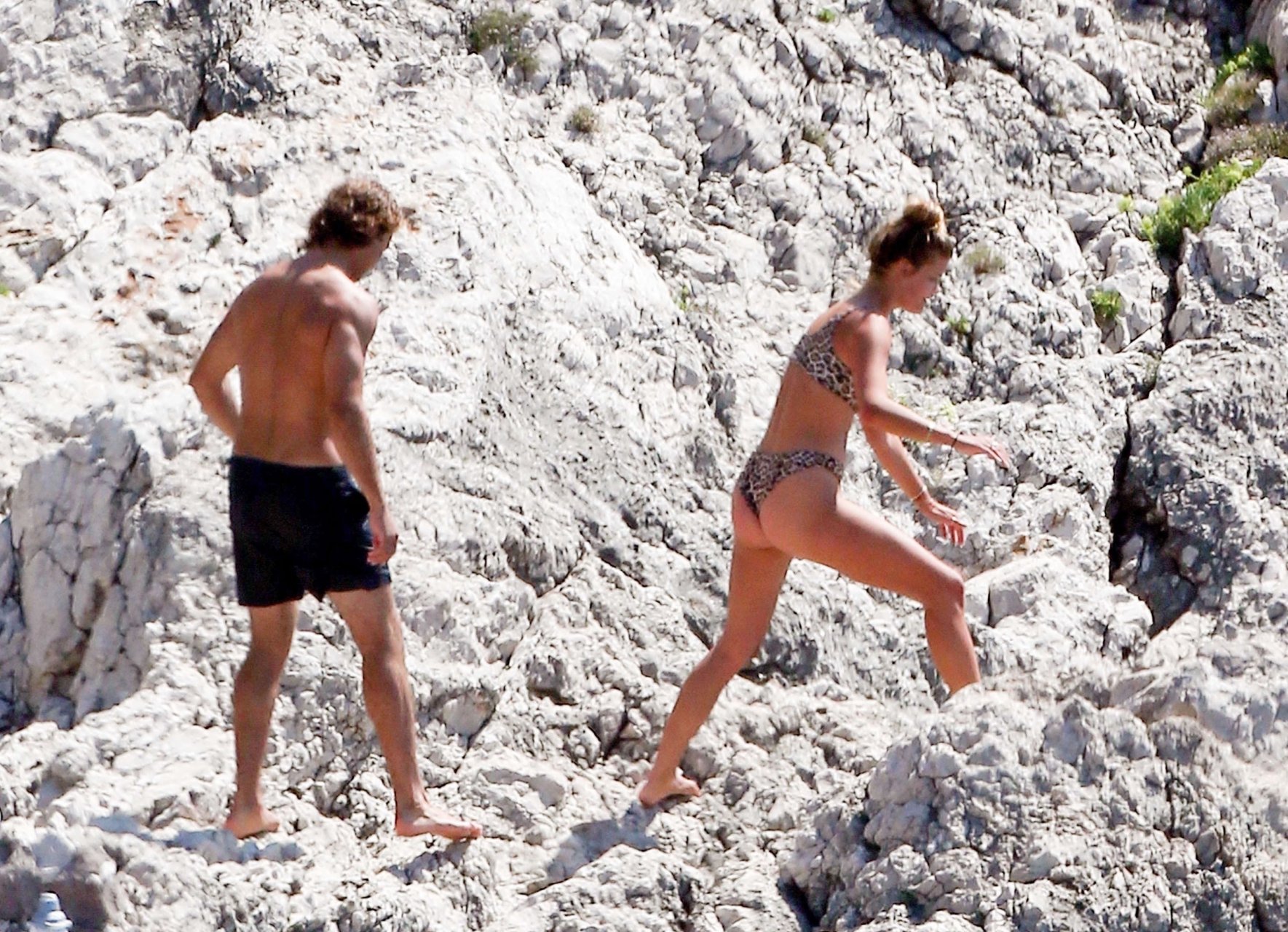 Le mannequin danois Nina Agdal (26 ans) et son petit ami Jack Brinkley-Cook (23 ans) profitent de leurs vacances à Capri, en Italie, le 31/07/2018. Nina portait un bikini imprimé léopard en prenant le soleil et a été photographiée en train d’avoir une séance de démonstration d’affection publique avec Jack. Nina et Jack ont été vus sur les rochers avant de sauter dans la mer pour nager.