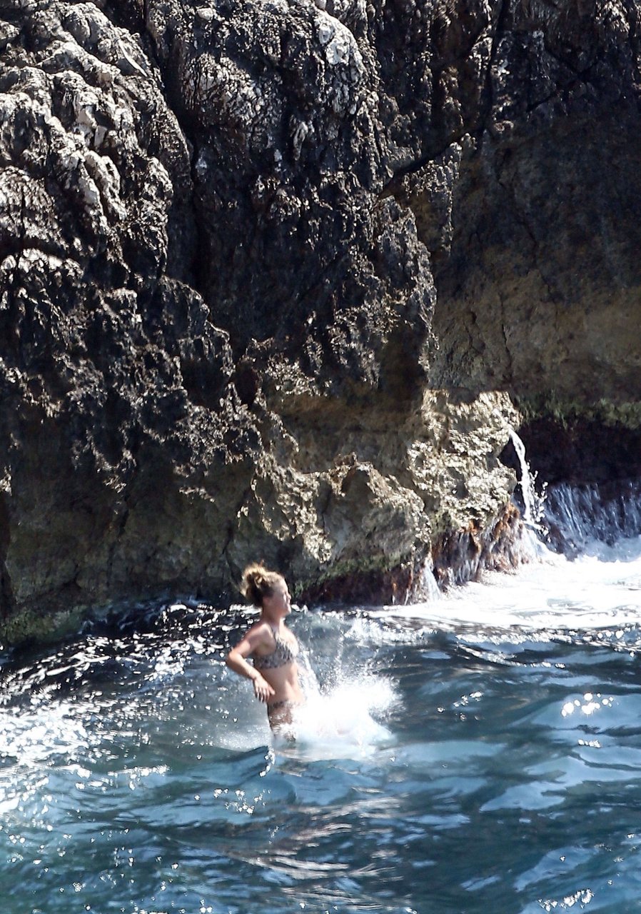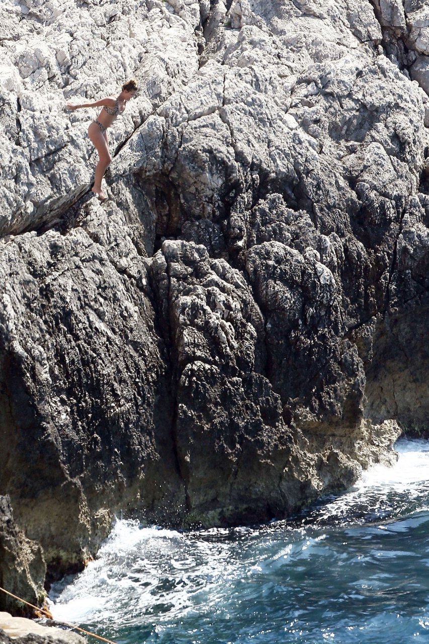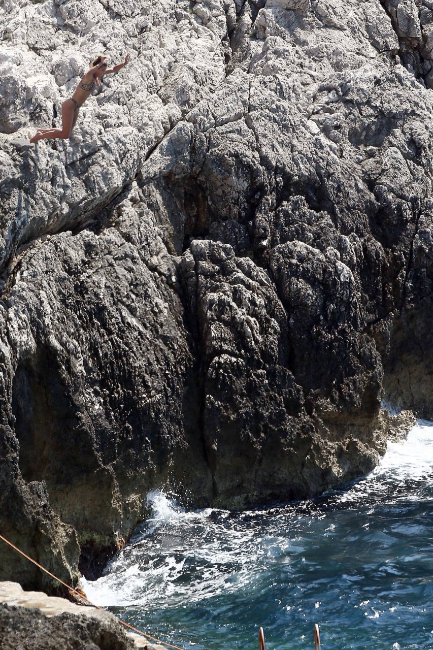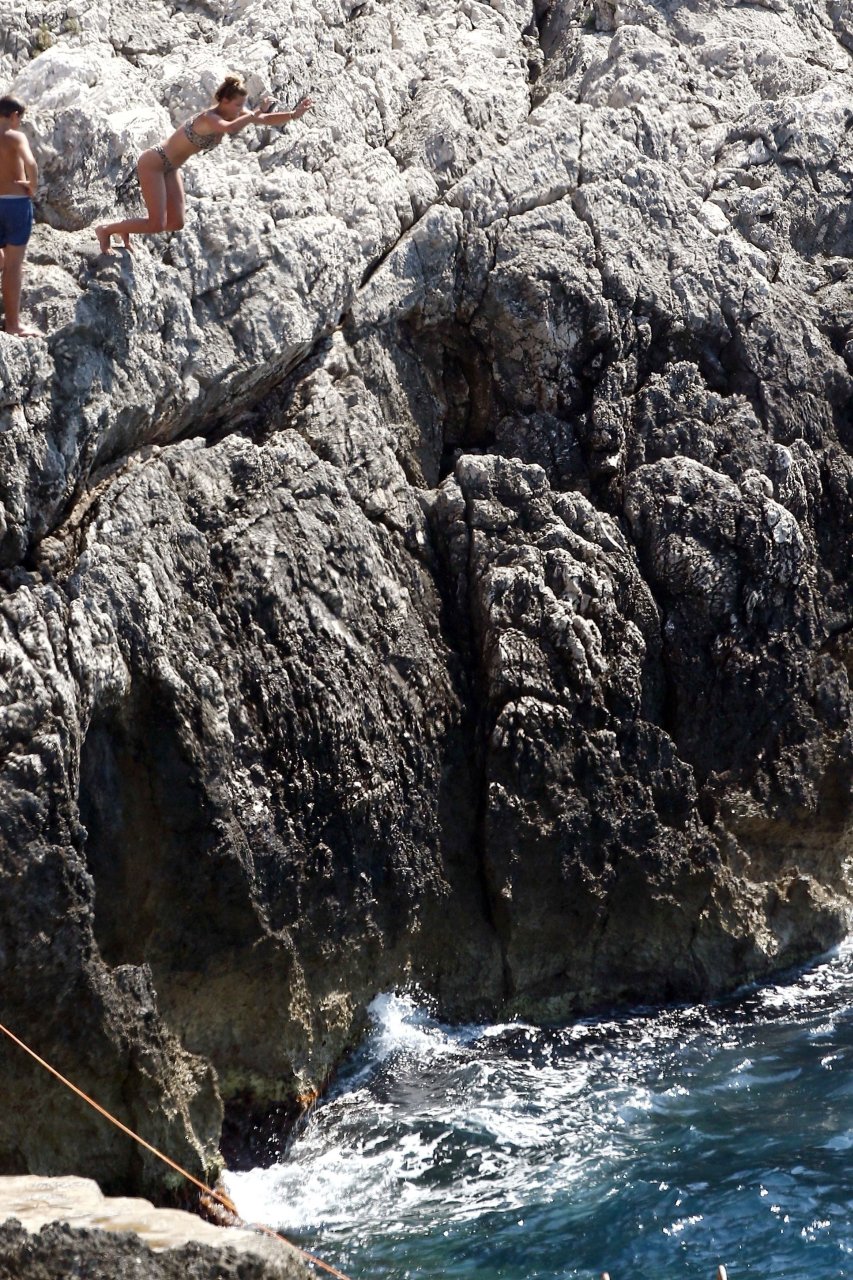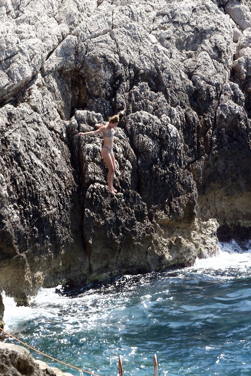 Le mannequin danois Nina Agdal (26 ans) et son petit ami Jack Brinkley-Cook (23 ans) profitent de leurs vacances à Capri, en Italie, le 31/07/2018. Nina portait un bikini imprimé léopard en prenant le soleil et a été photographiée en train d’avoir une séance de démonstration d’affection publique avec Jack. Nina et Jack ont été vus sur les rochers avant de sauter dans la mer pour nager.