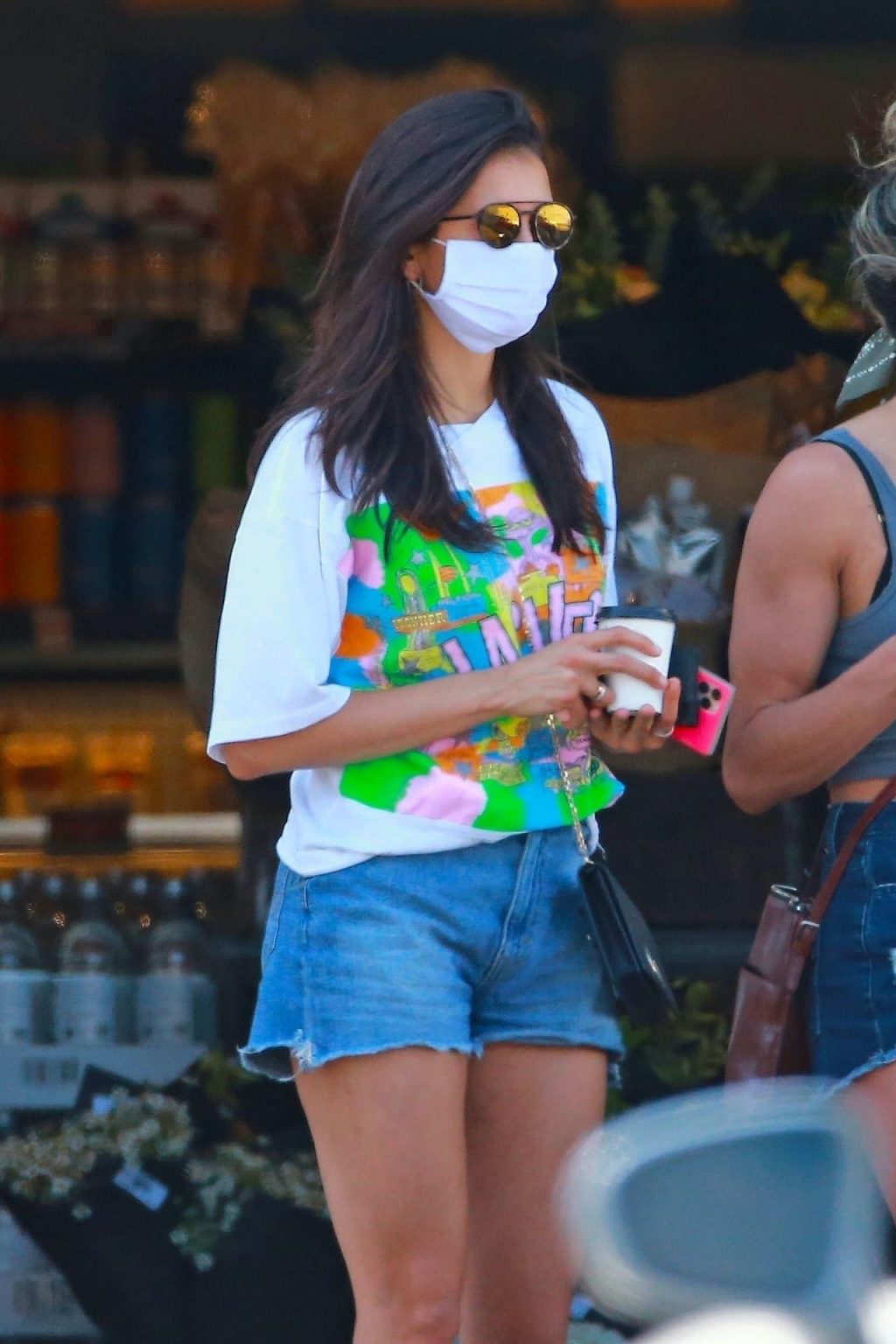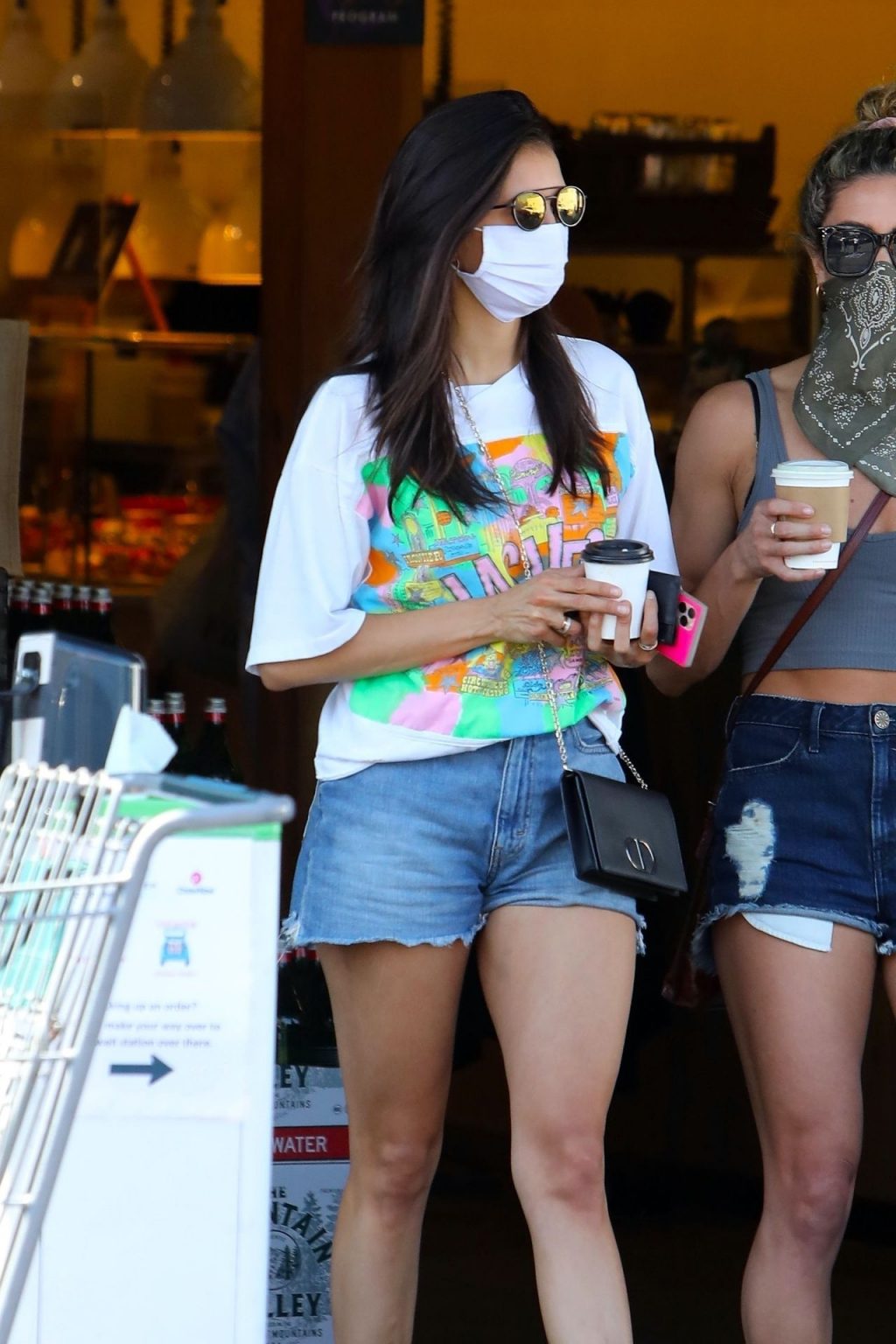 Nina Dobrev montre ses jambes fines lors d’un voyage au marché Erewhon à Venise avec une amie, 21/07/2020.