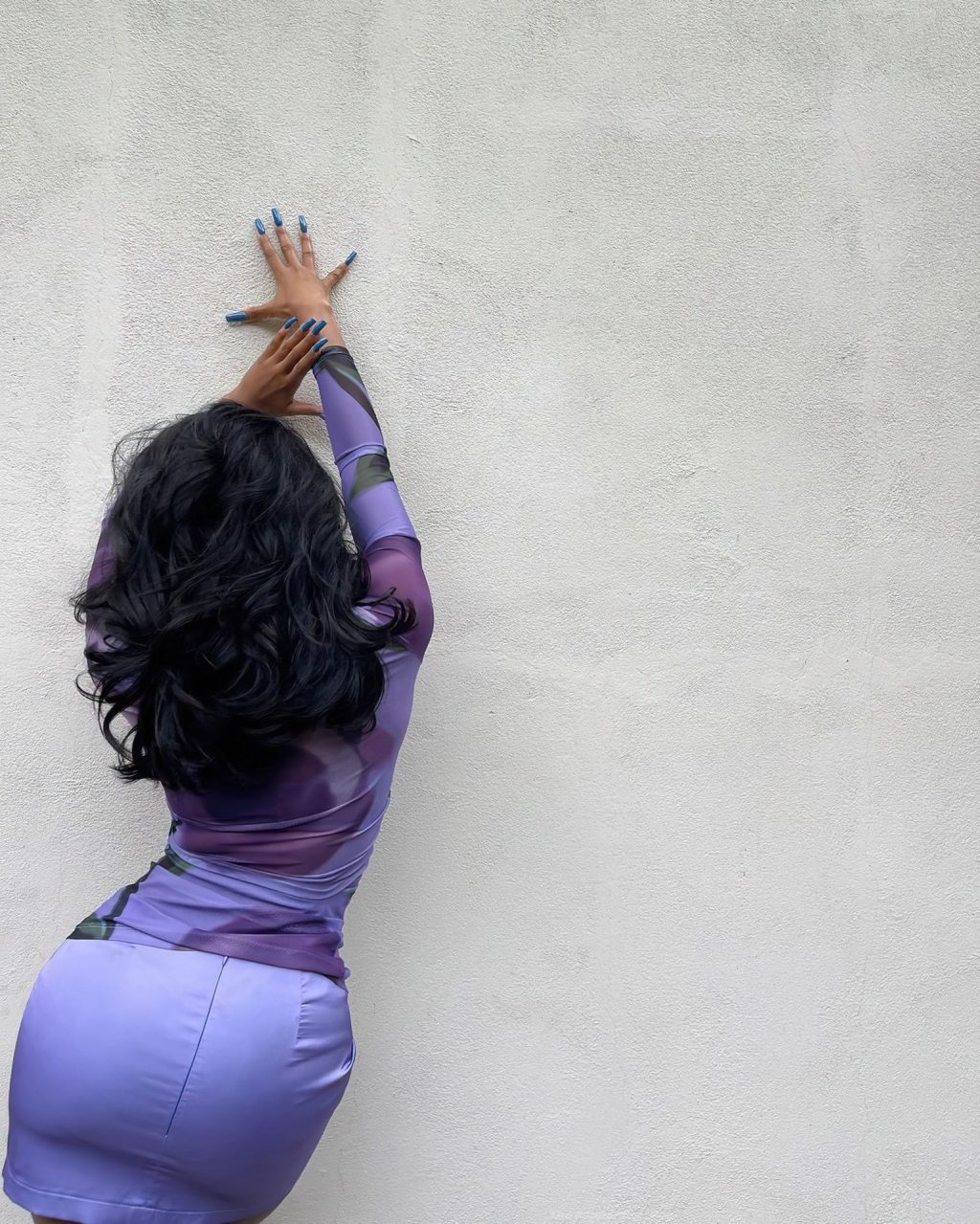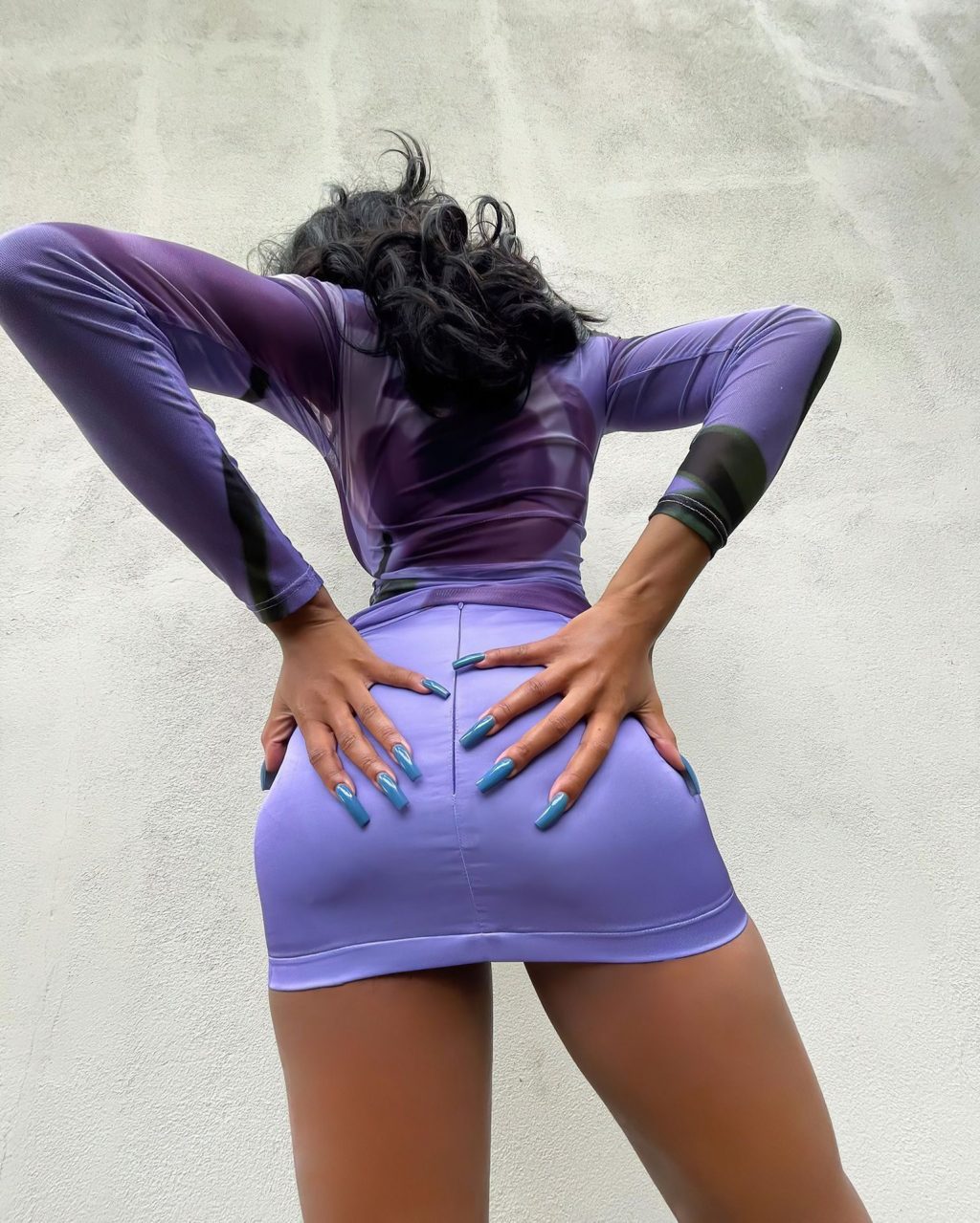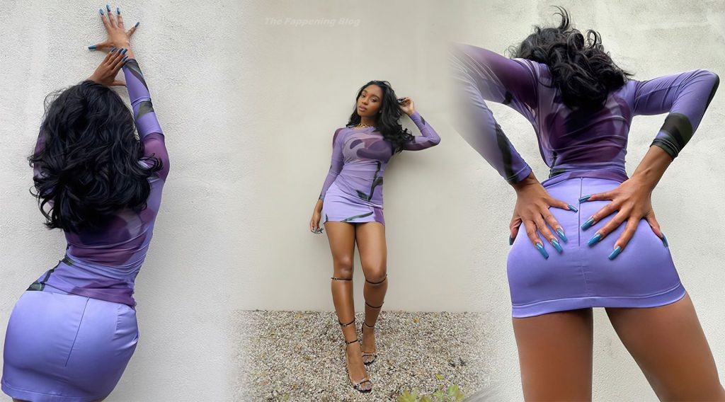 Normani Kordei montre sa belle silhouette et ses jambes en posant dans une mini-jupe violette et un chemisier transparent pour ses abonnés Instagram, 11/02/2021.