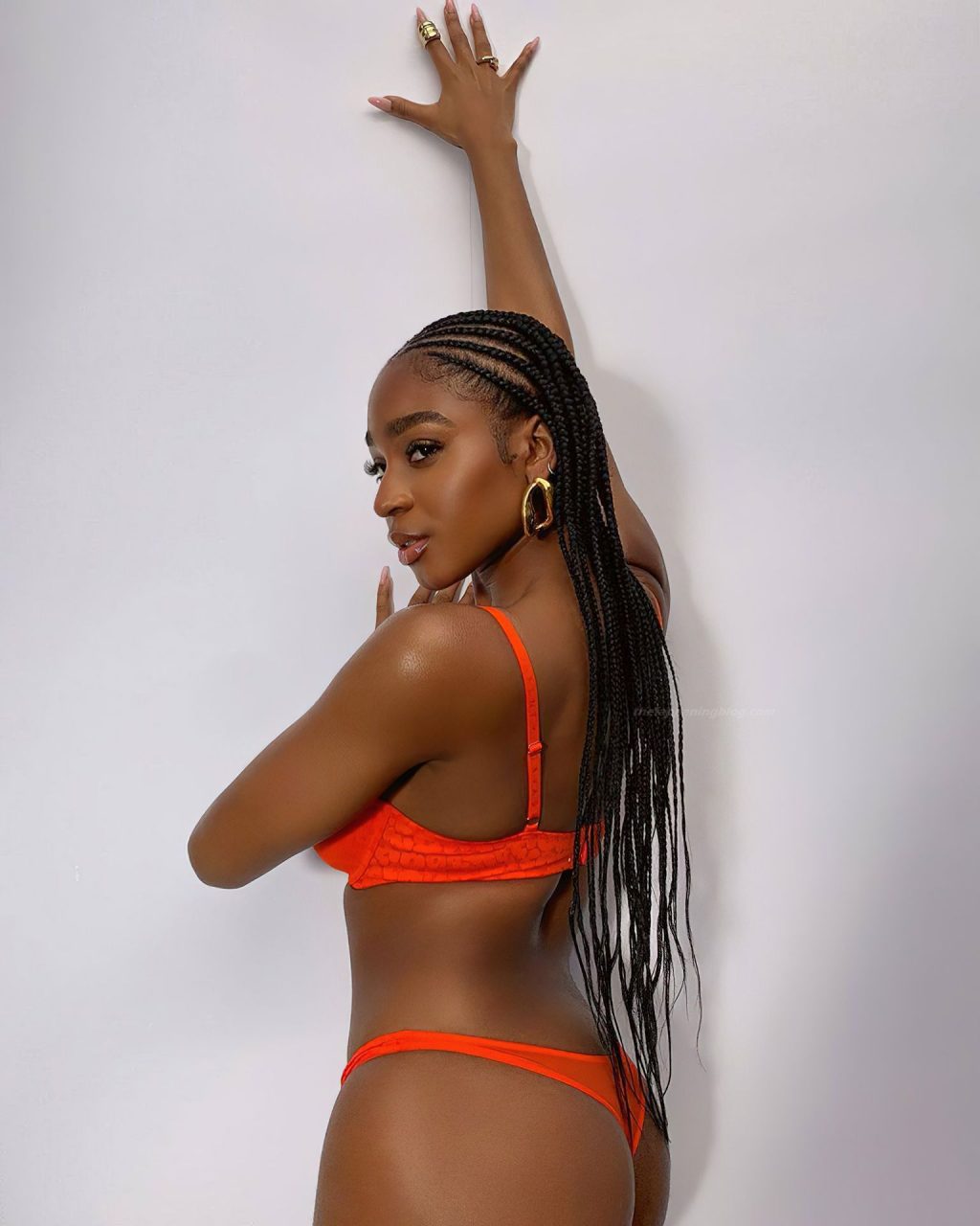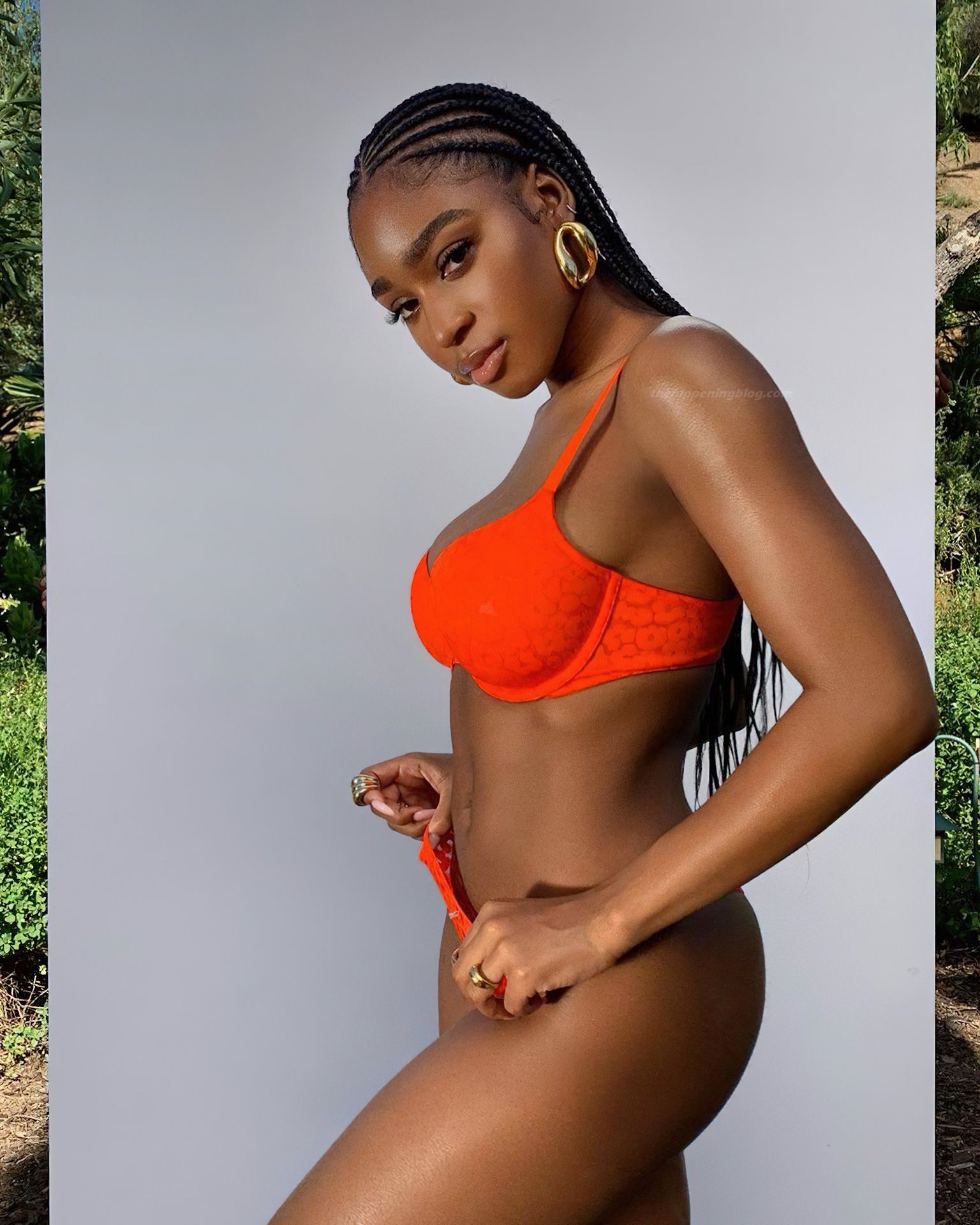 La chanteuse Normani Kordei affiche ses fesses fermes et son corps athlétique, posant en lingerie orange, promouvant la collection Savage X Fenty de Rihanna (2020).