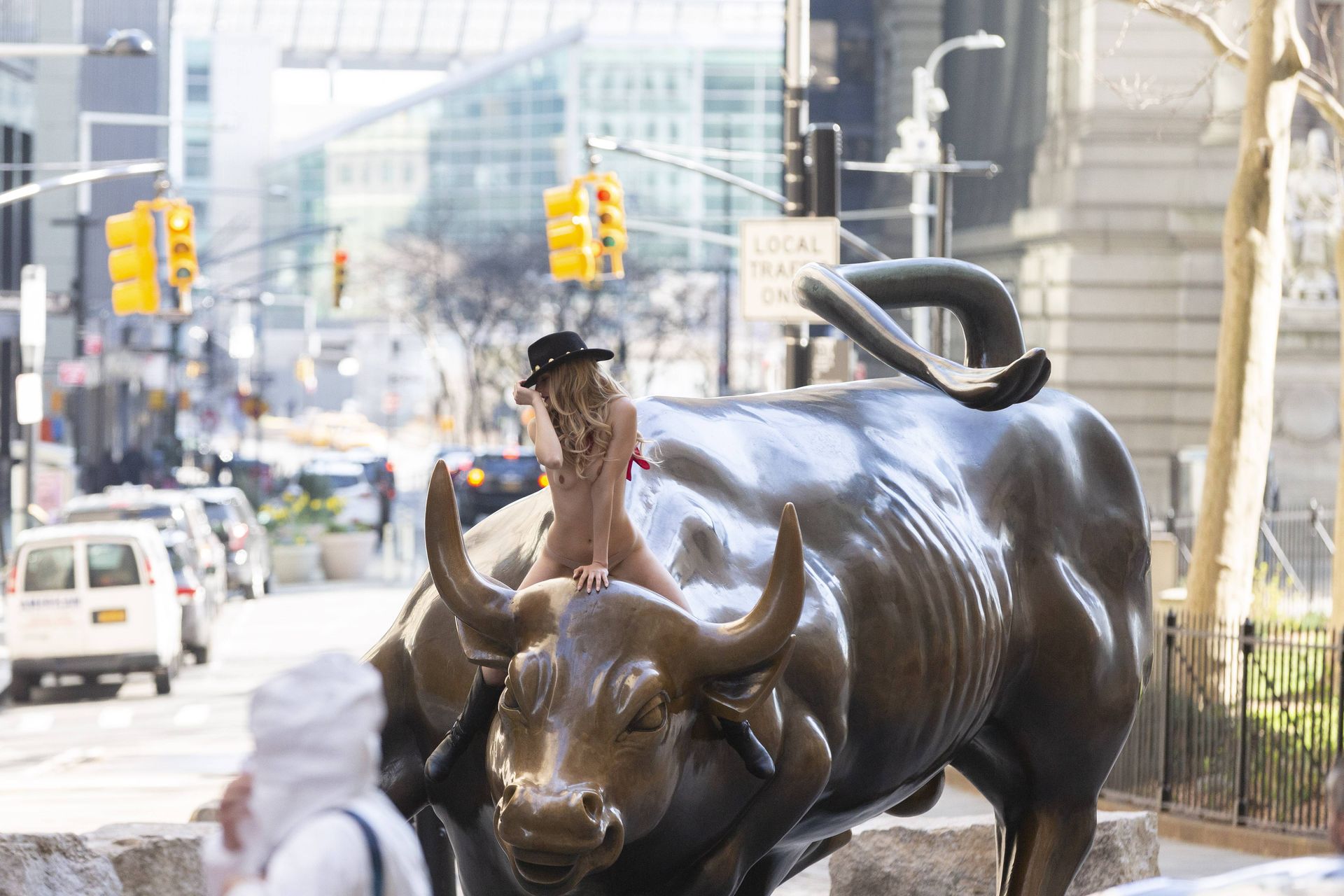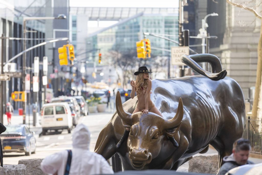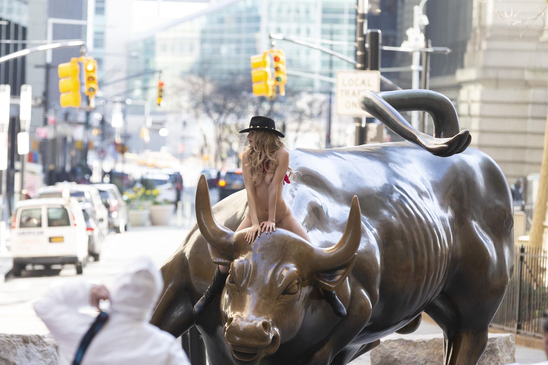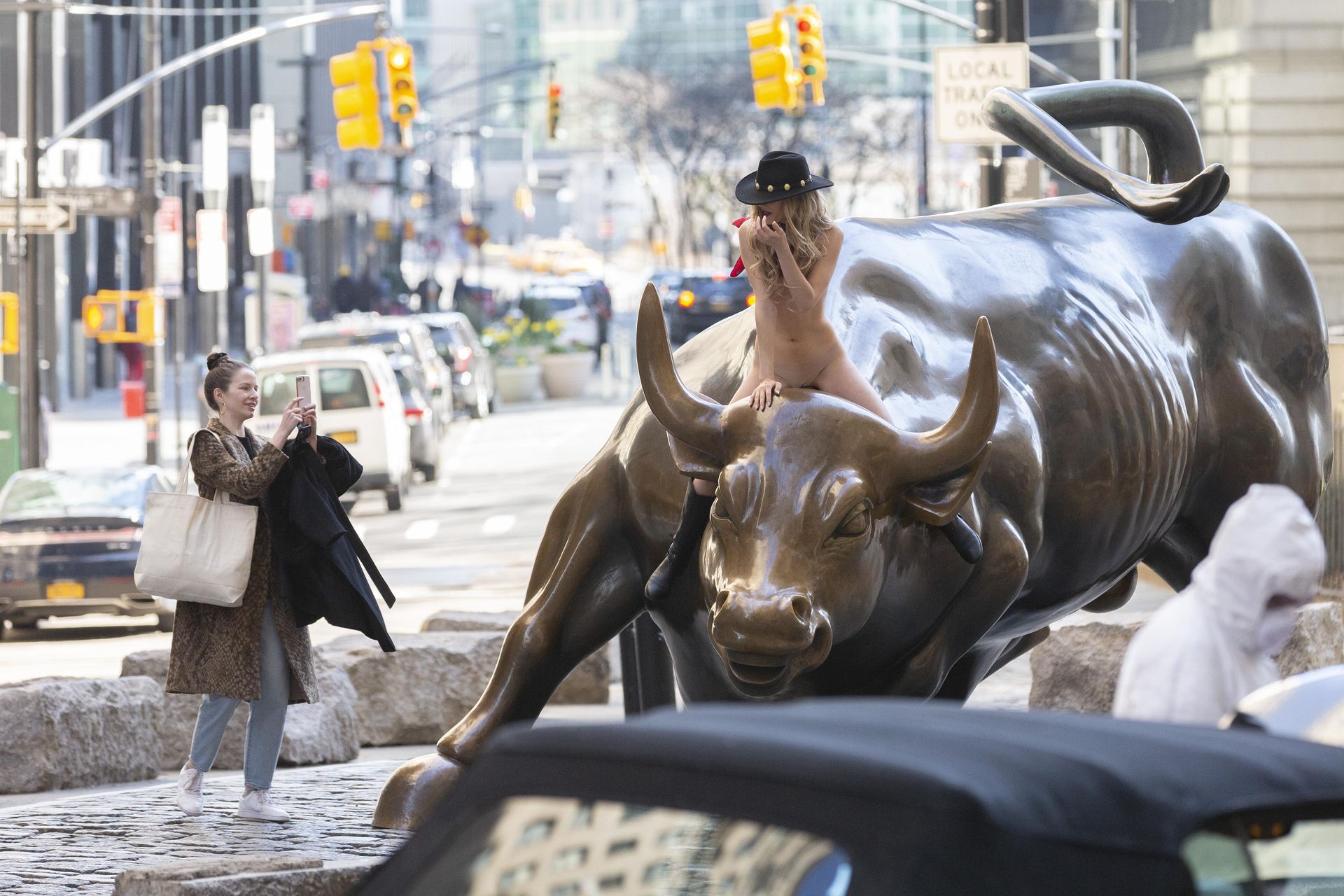 Cette bombe blonde a enfourché la statue du “Taureau Chargeant” nue jeudi, ignorant effrontément toutes les mesures de protection contre le coronavirus, 26/03/2020.
