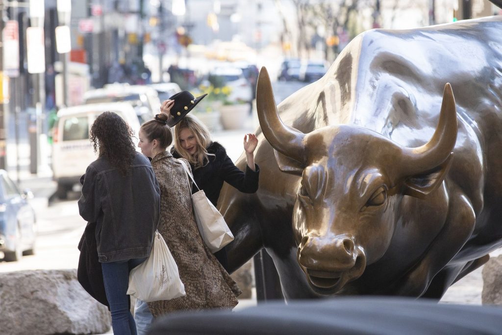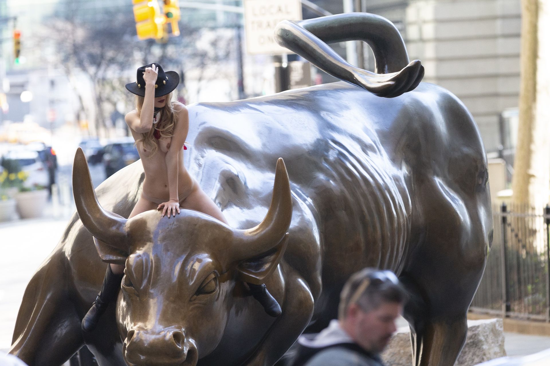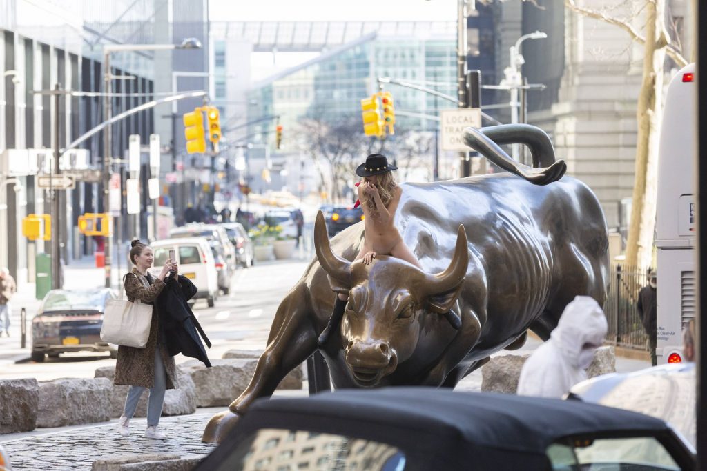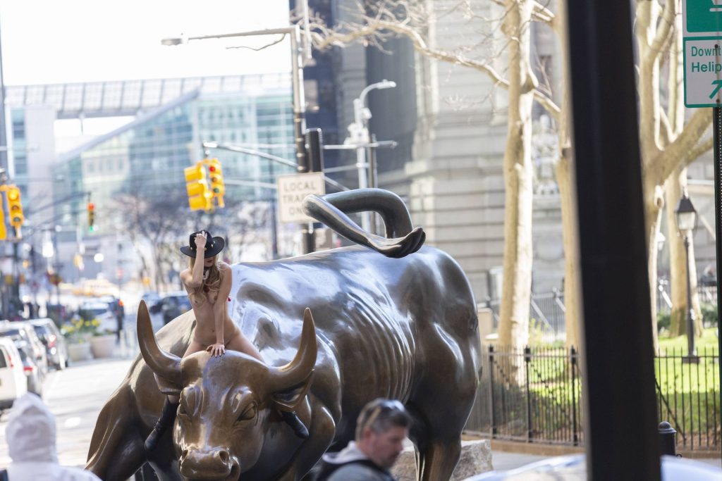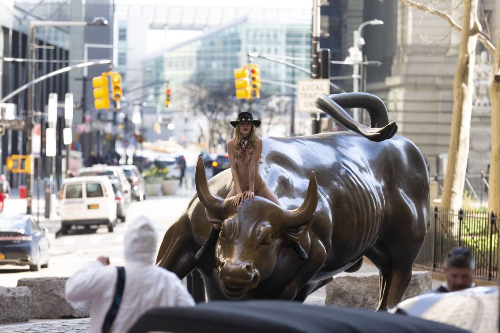 Cette bombe blonde a enfourché la statue du “Taureau Chargeant” nue jeudi, ignorant effrontément toutes les mesures de protection contre le coronavirus, 26/03/2020.